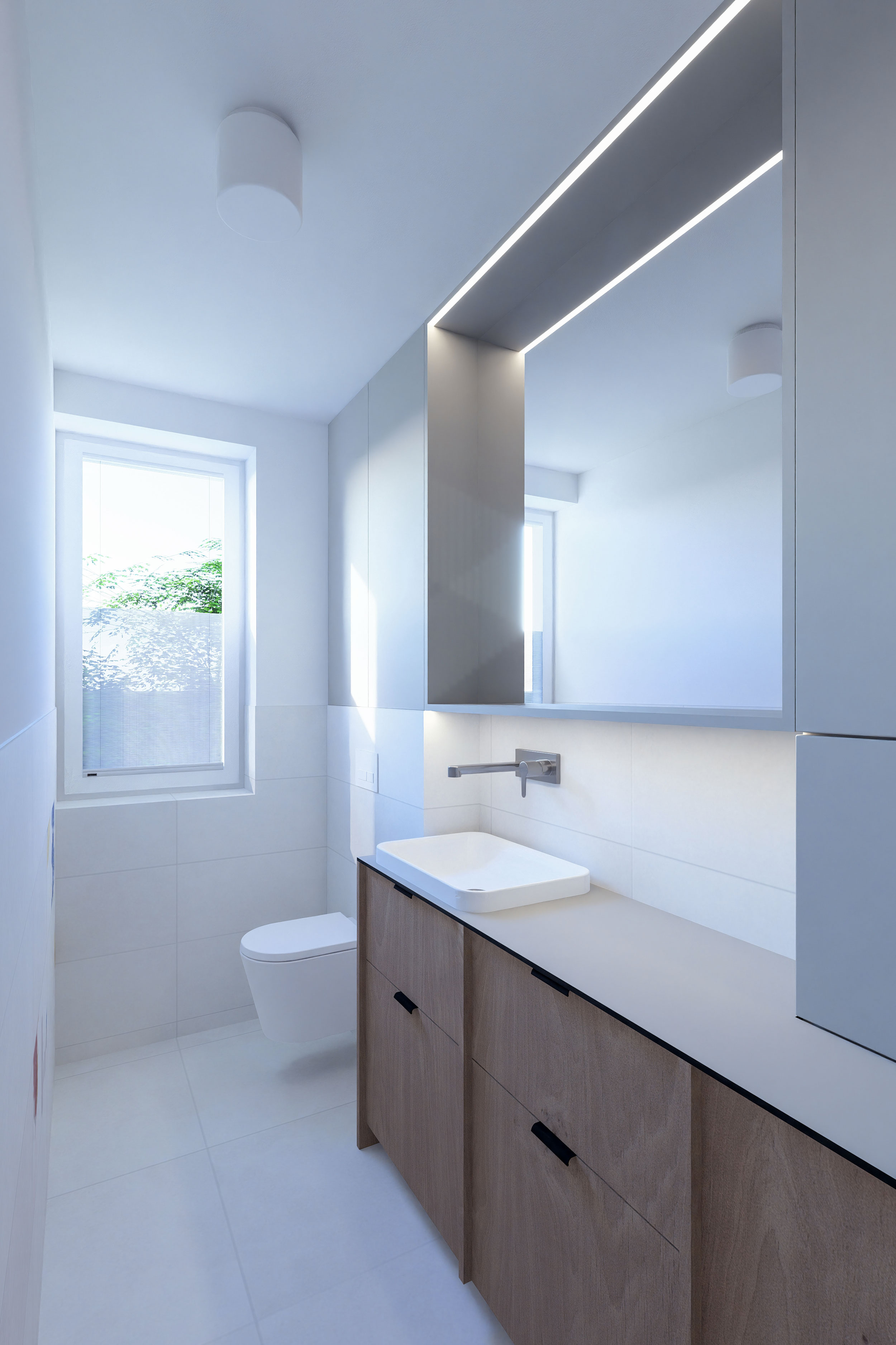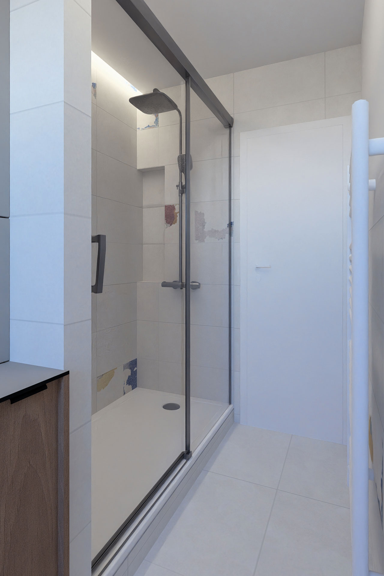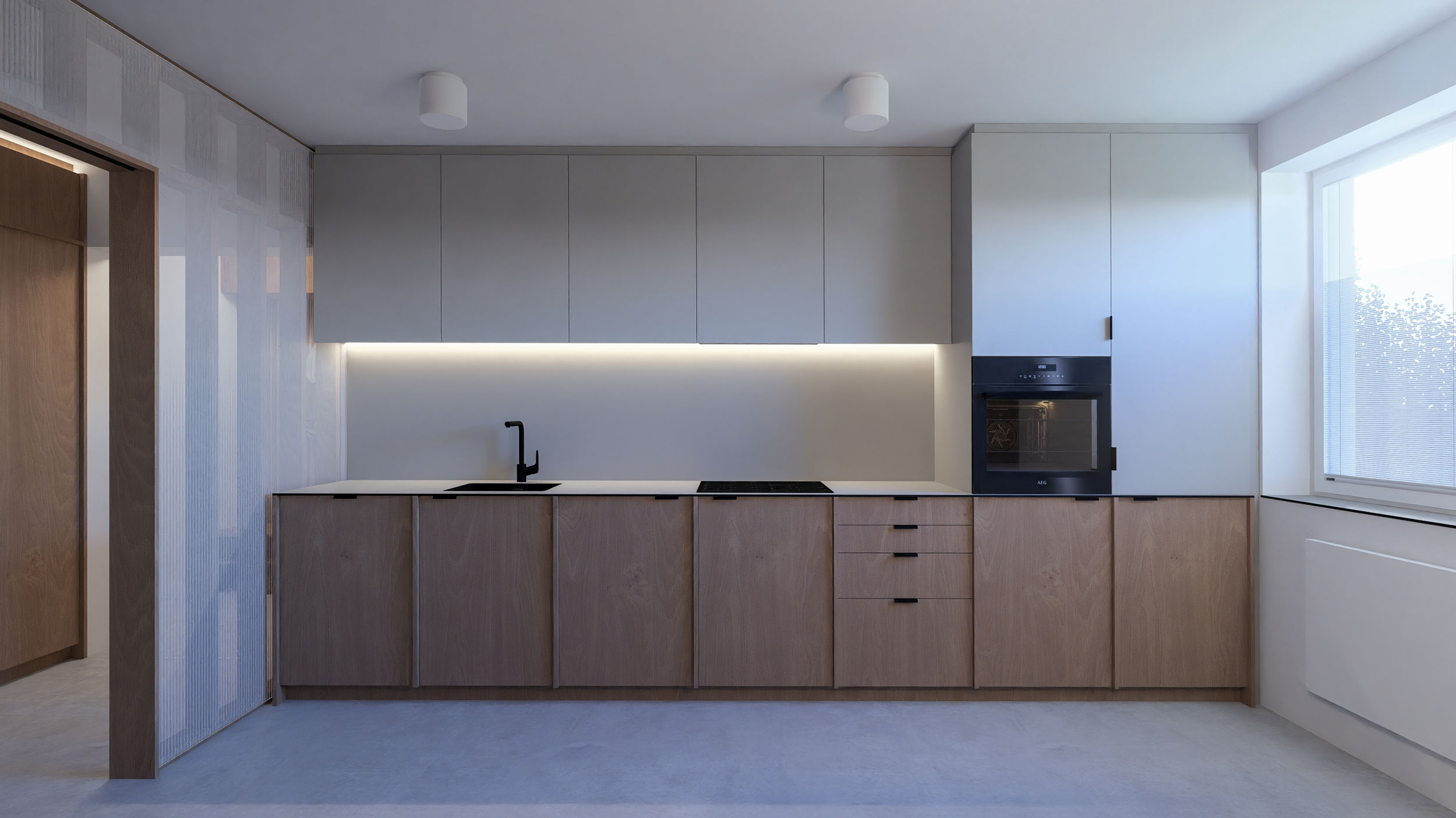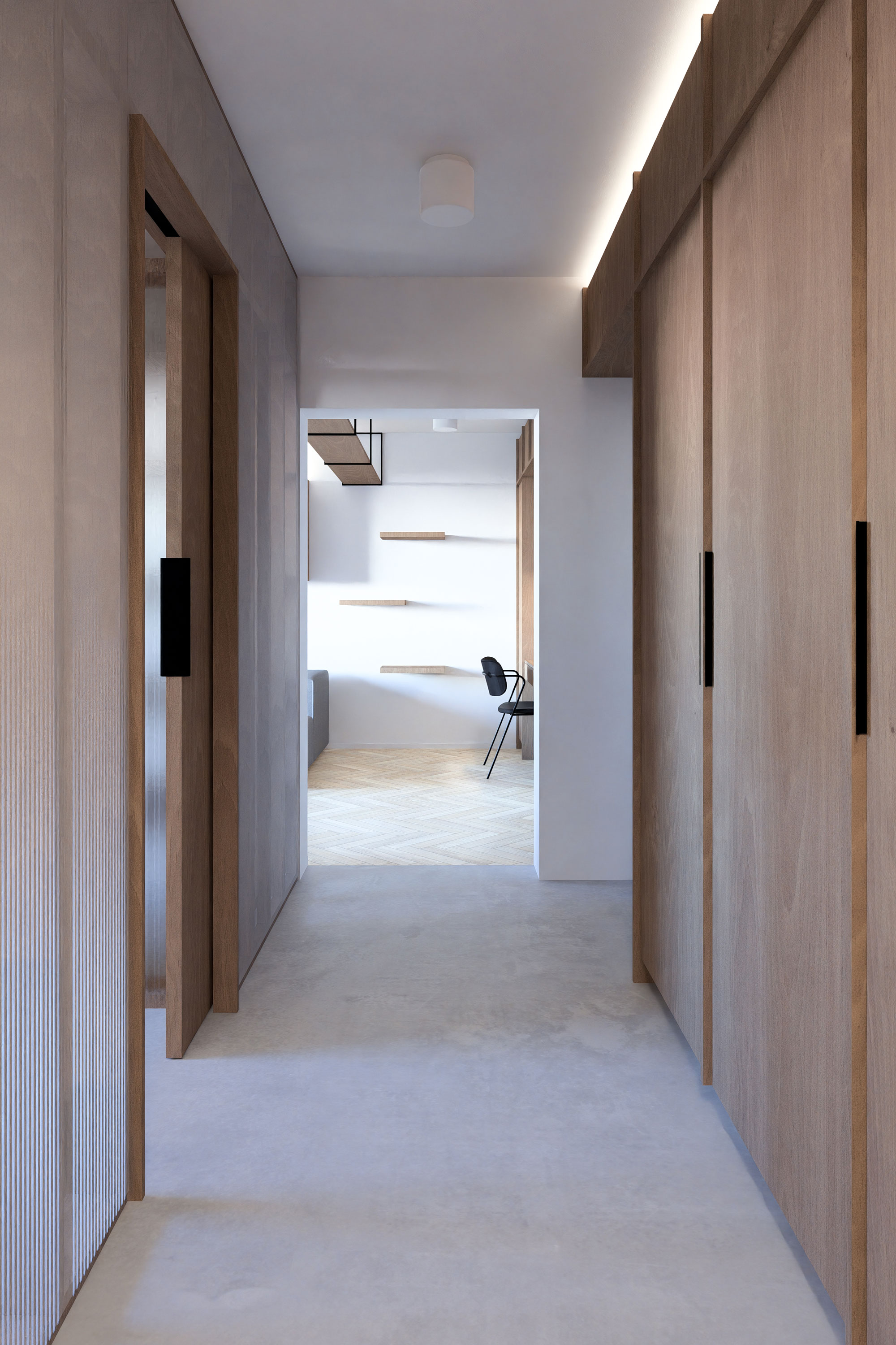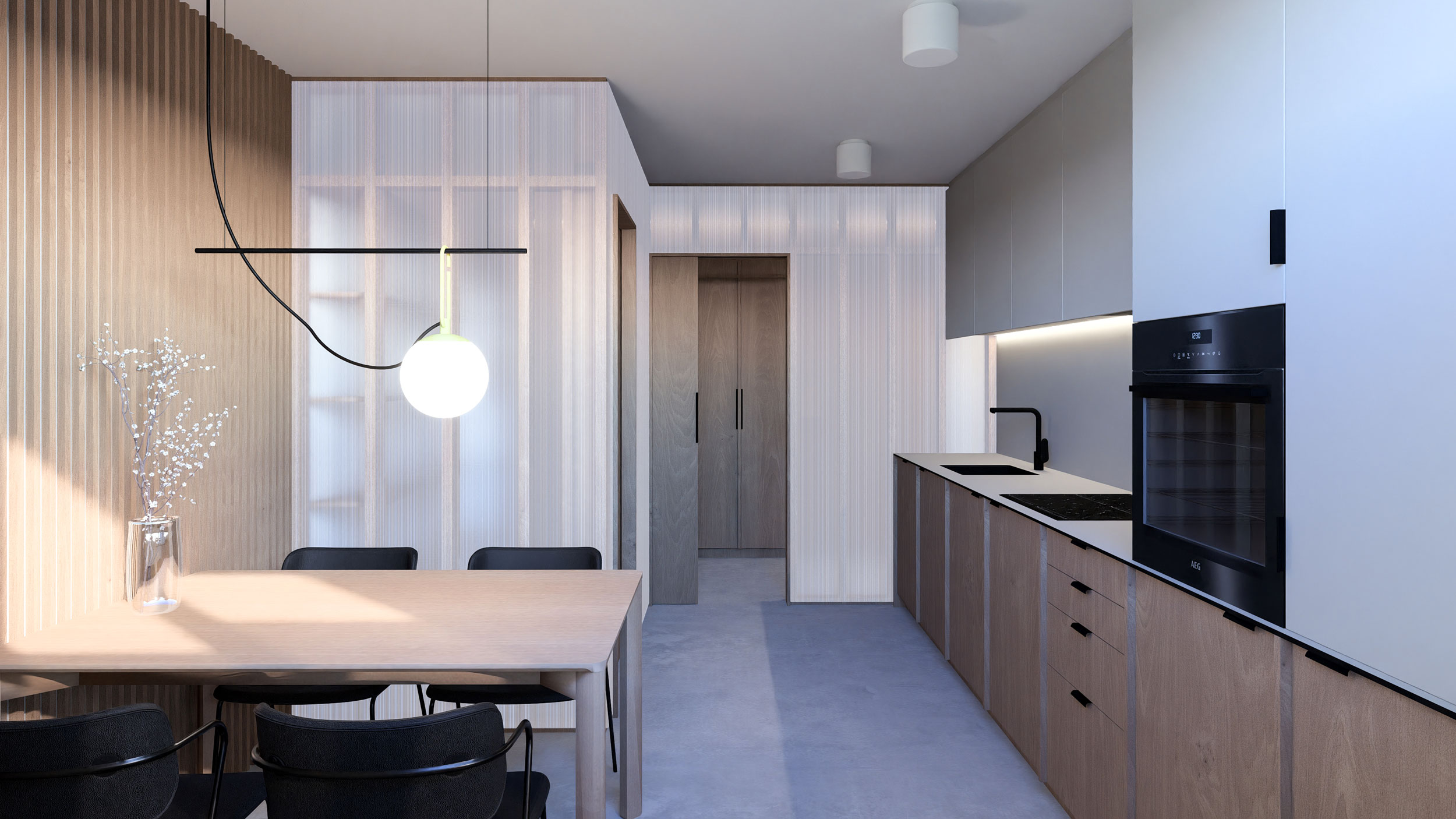 Tento projekt nám rozšířil obzory ještě v jednom směru a to v tom, jaké je to žít s několika kočkami v jednom bytě. Takže přesto že jsme spíš ve psím táboře, tak už víme, jak by měl být velký kočičí záchod, že je dobré mít možnost do kuchyně zavřít dveře a jaká tloušťka polykarbonátu odolá kočičímu náletu. A tak mezi chodbou a kuchyní není zeď, ale příčka z polykarbonátu se šoupacími dveřmi. Výhoda tohoto materiálu je v tom, že do dříve tmavé chodby pustí denní světlo a jednotlivé prostory se opticky propojí.