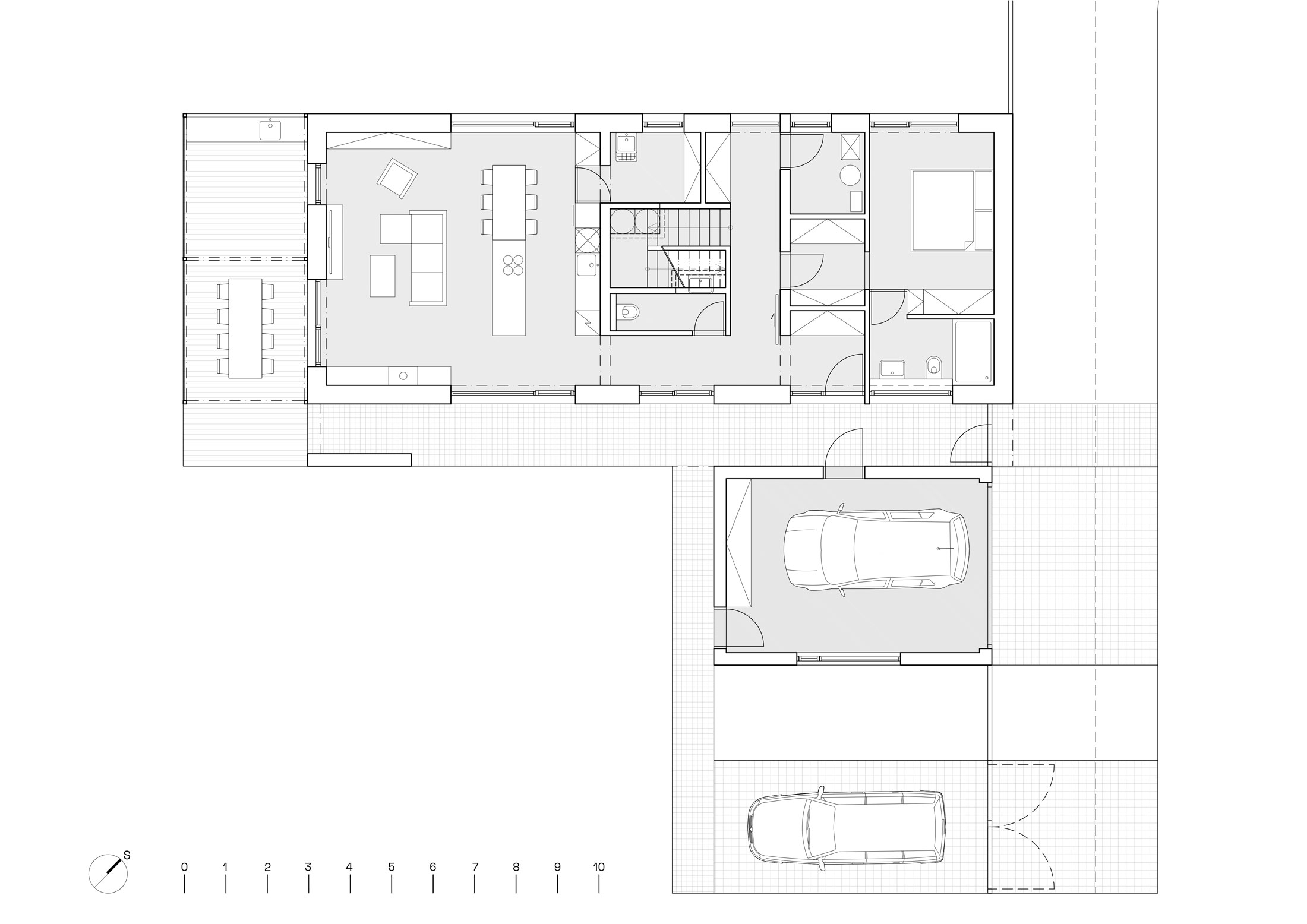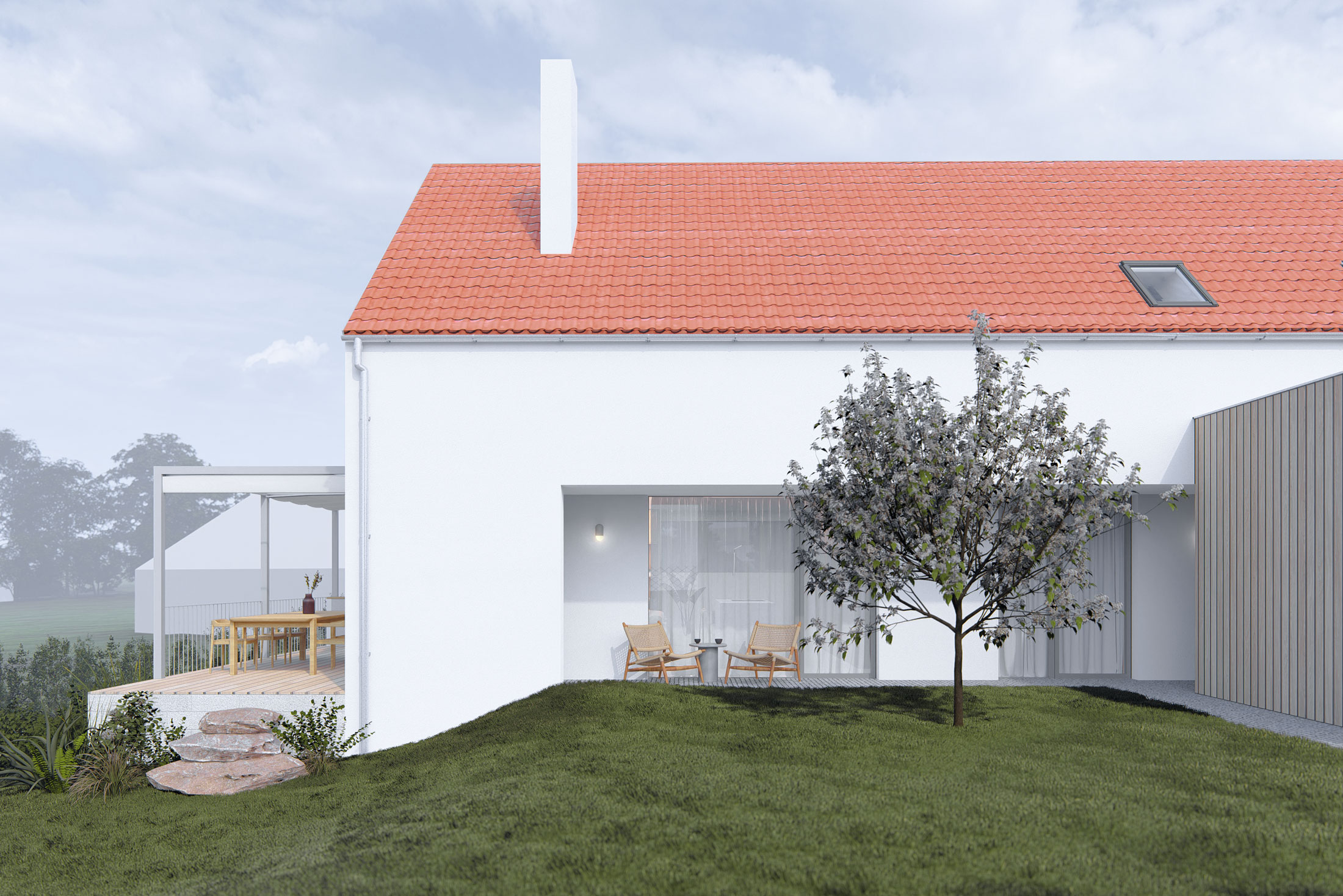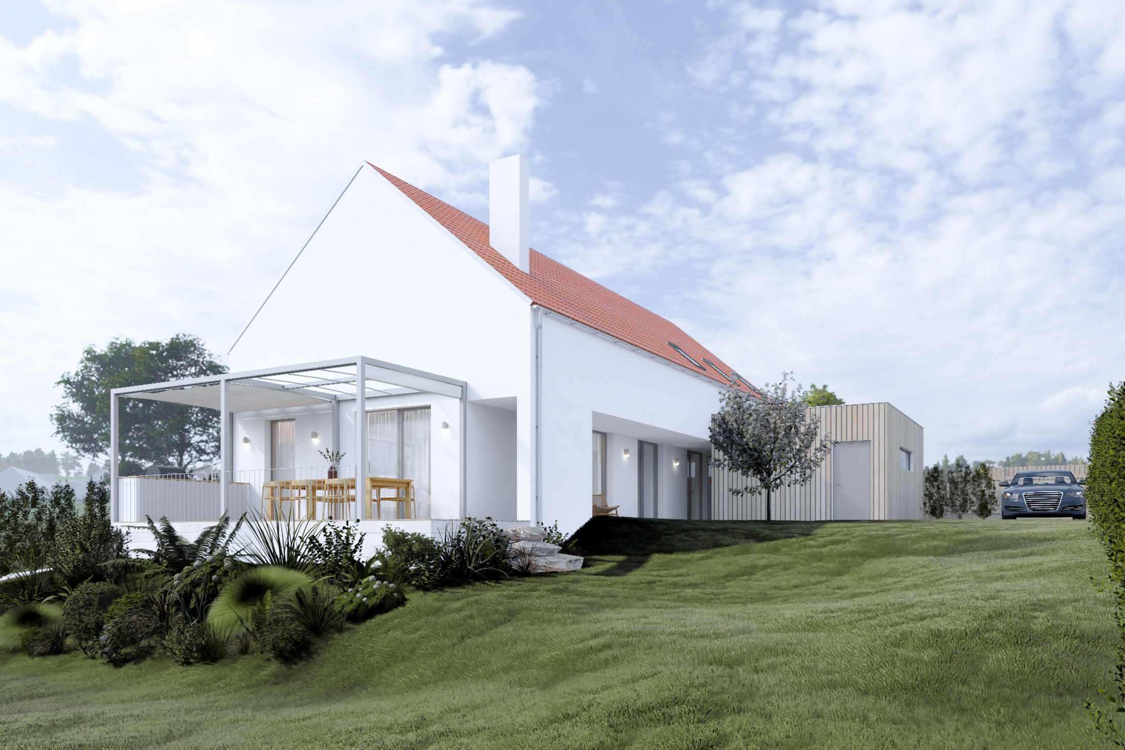 Orientace na světové strany a umístění domu na pozemku daly budově její konečný tvar, kdy přesahem střechy vzniklo tradiční zápraží. V létě bude na jihovýchodní fasádě oknům přirozeně stínit, naopak v zimě, kdy je slunce níž, nechá do interiéru proniknout teplé paprsky světla skrz velká francouzská okna.