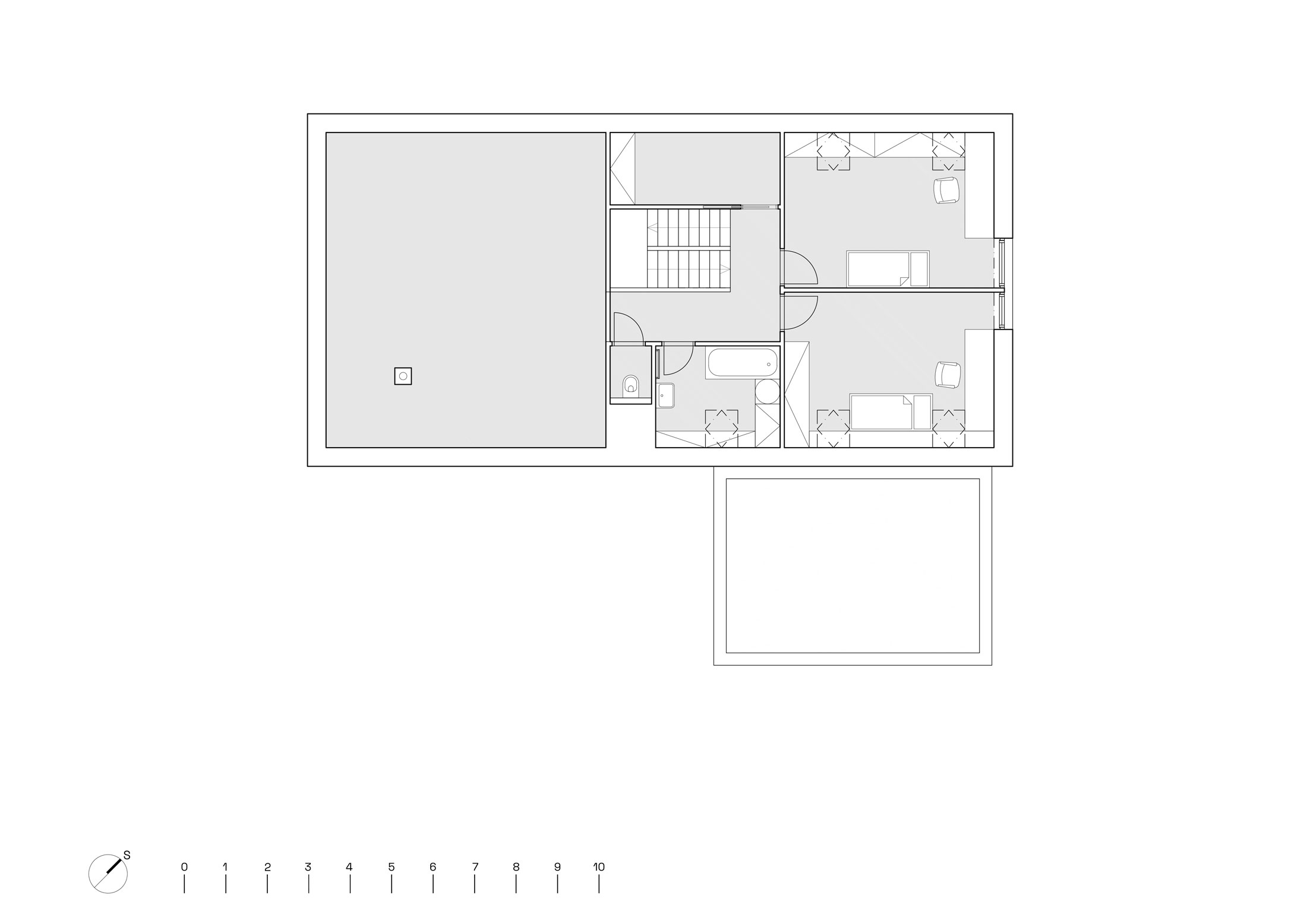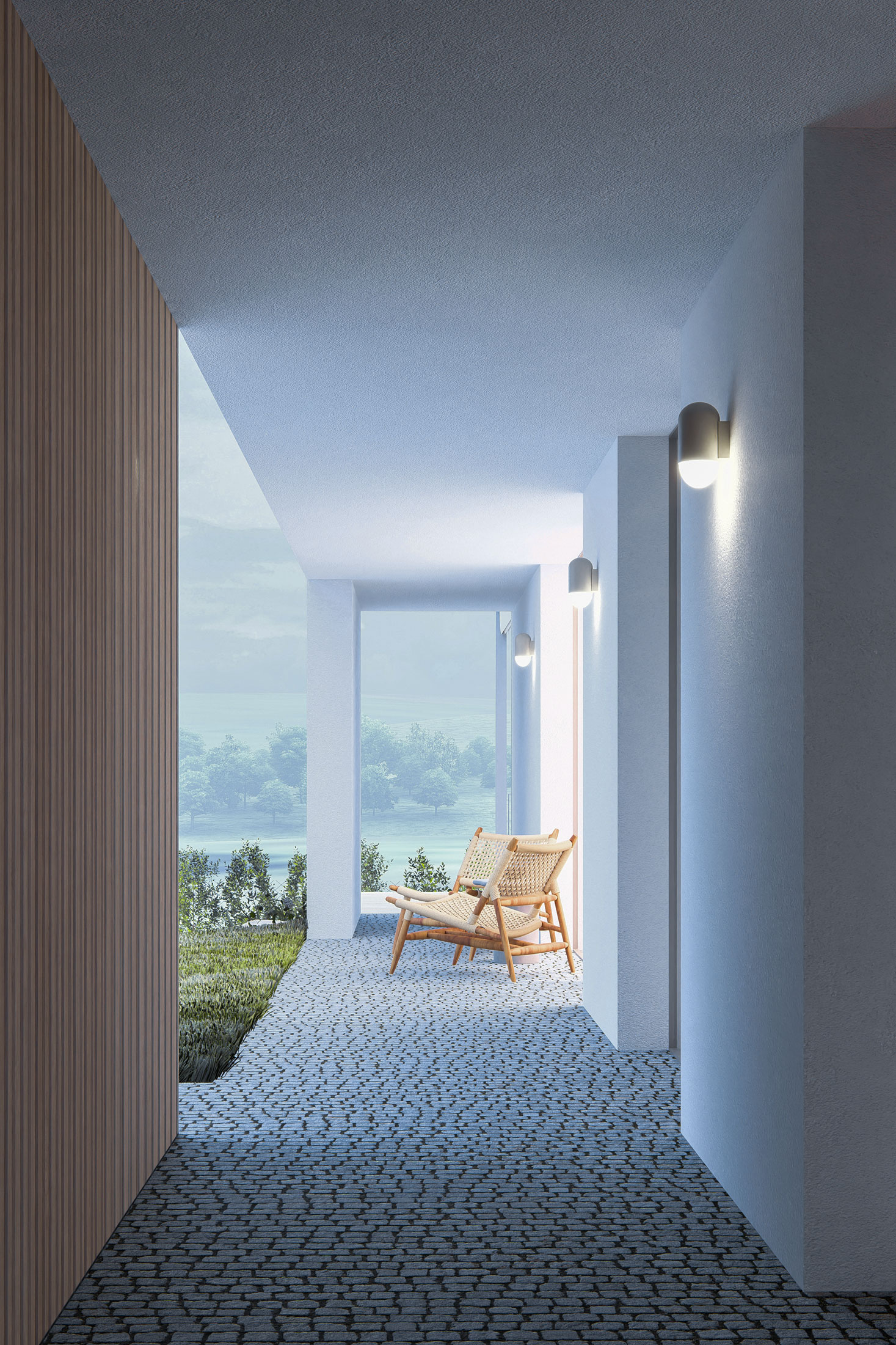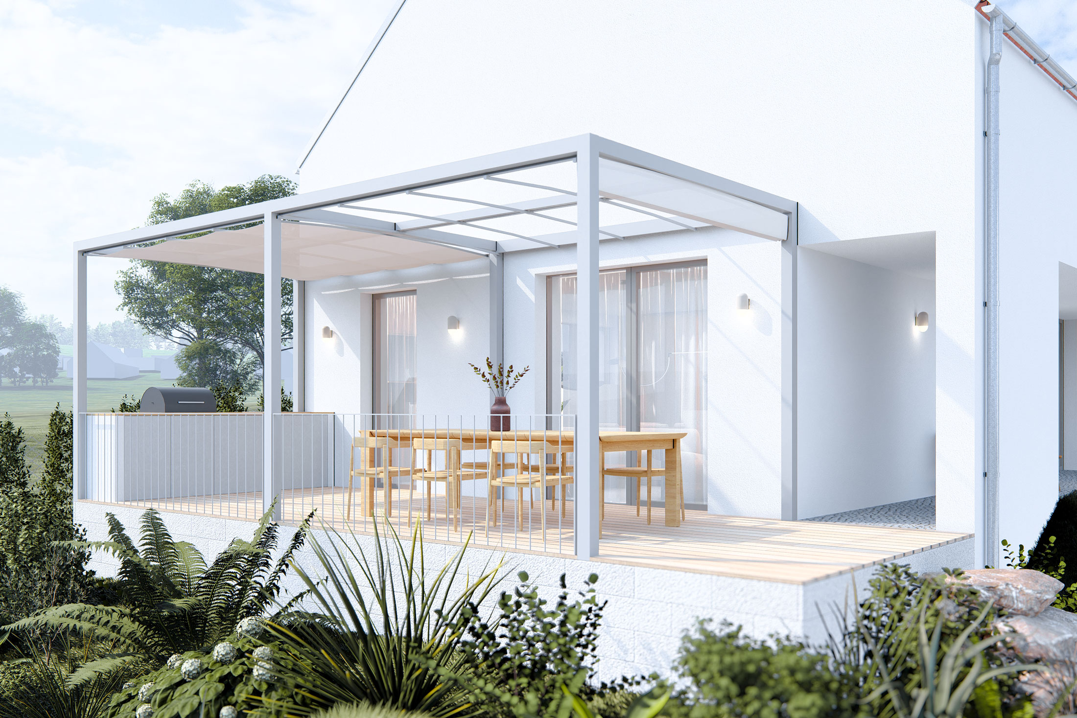 Orientace na světové strany a umístění domu na pozemku daly budově její konečný tvar, kdy přesahem střechy vzniklo tradiční zápraží. V létě bude na jihovýchodní fasádě oknům přirozeně stínit, naopak v zimě, kdy je slunce níž, nechá do interiéru proniknout teplé paprsky světla skrz velká francouzská okna.