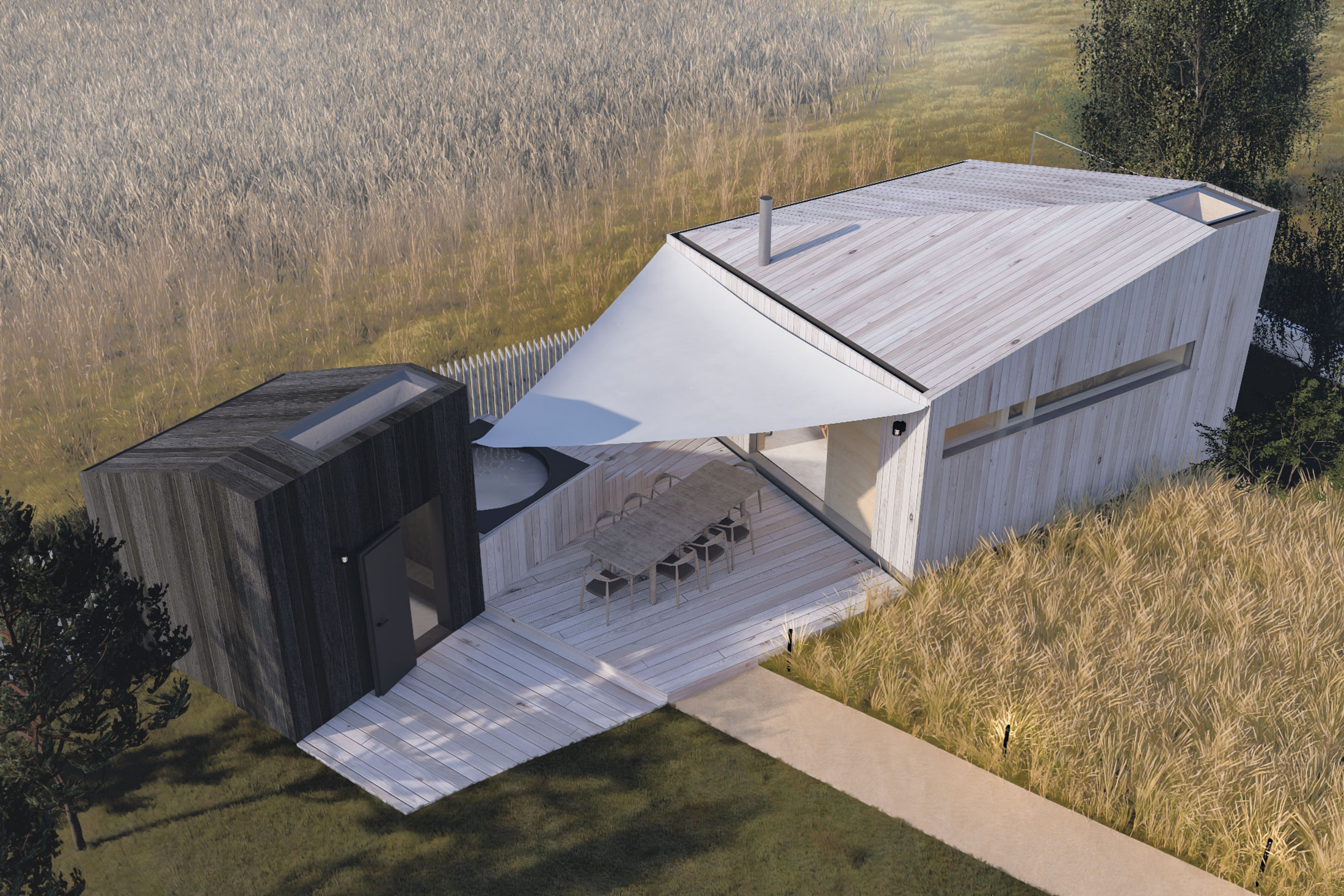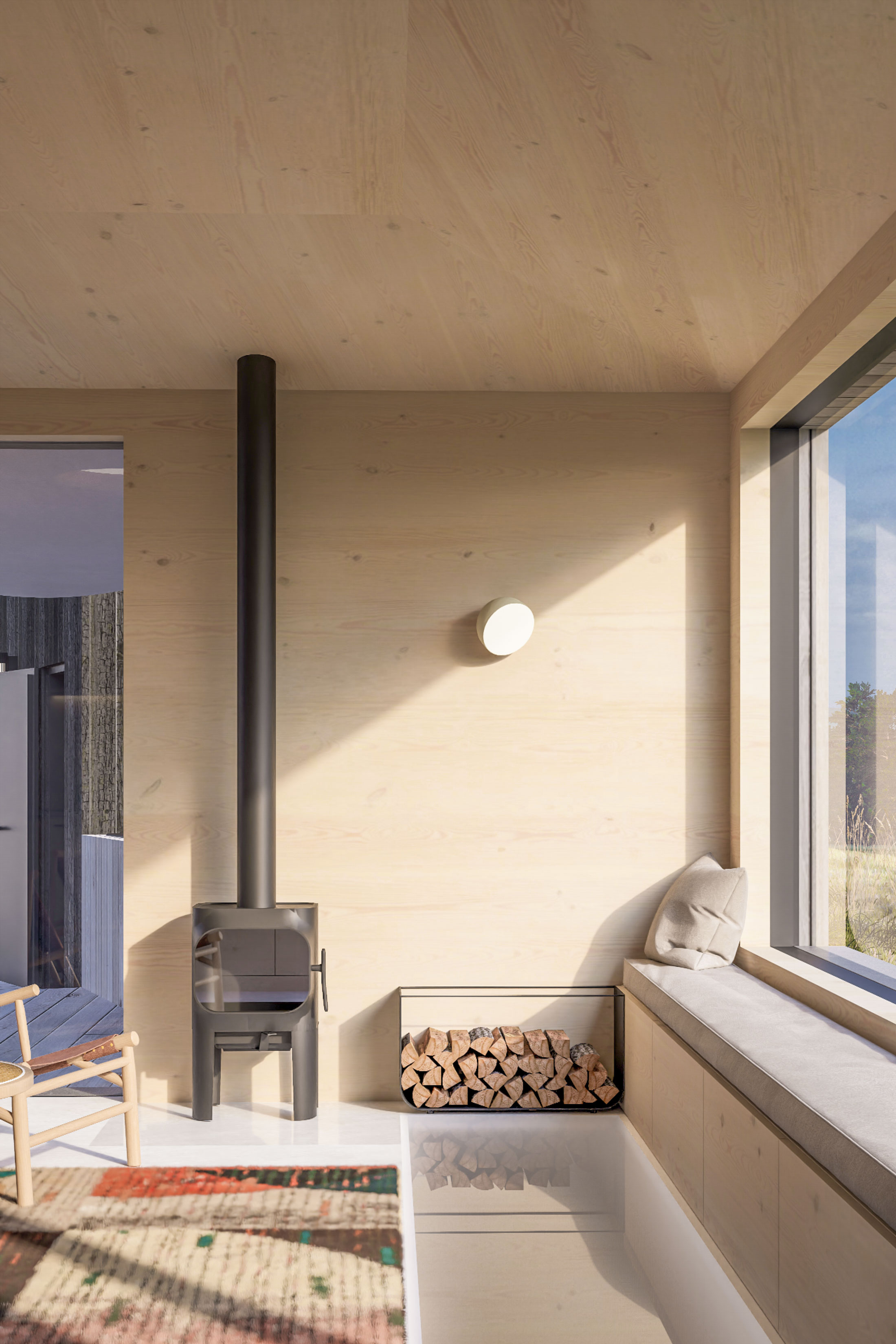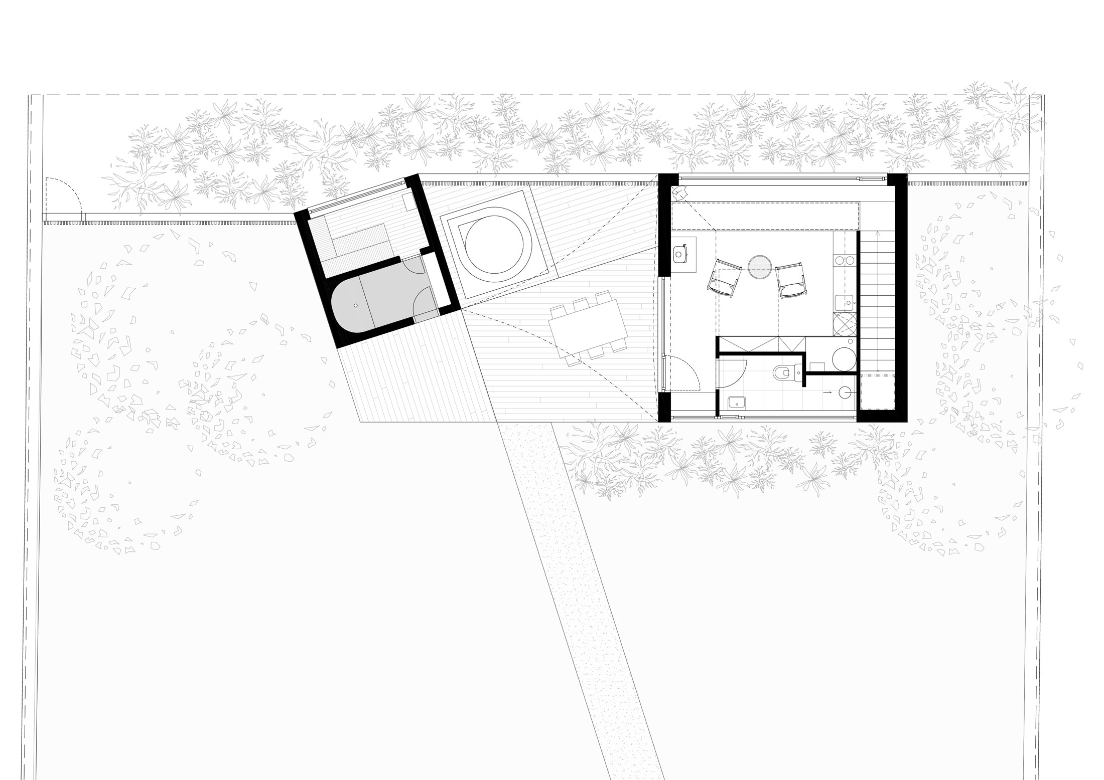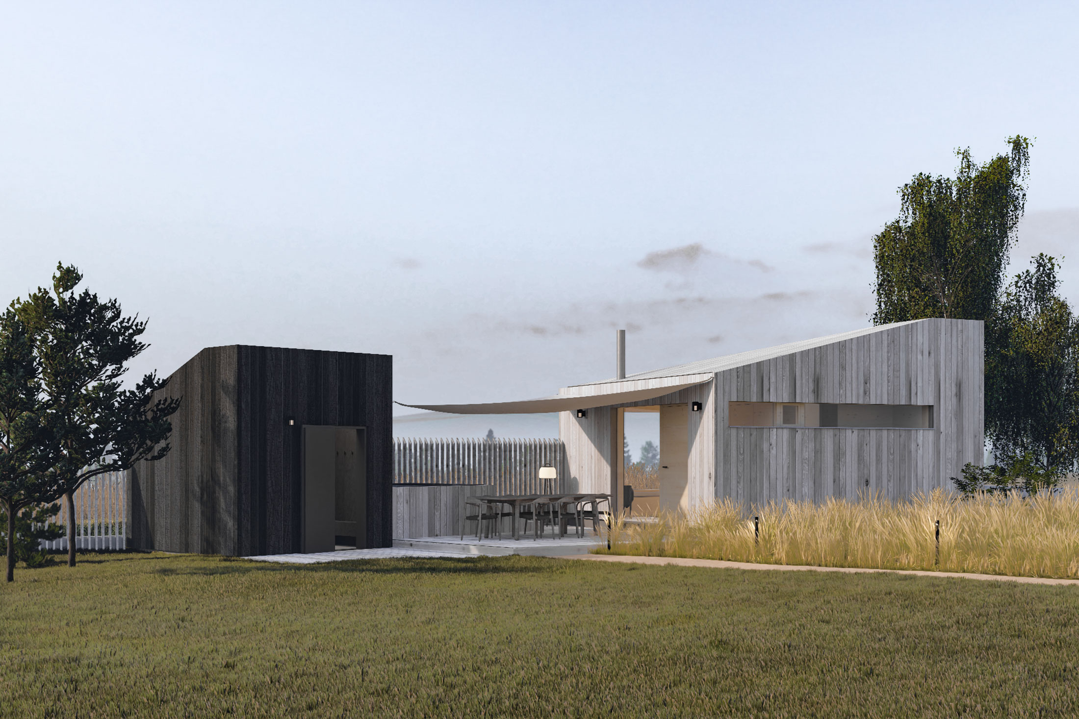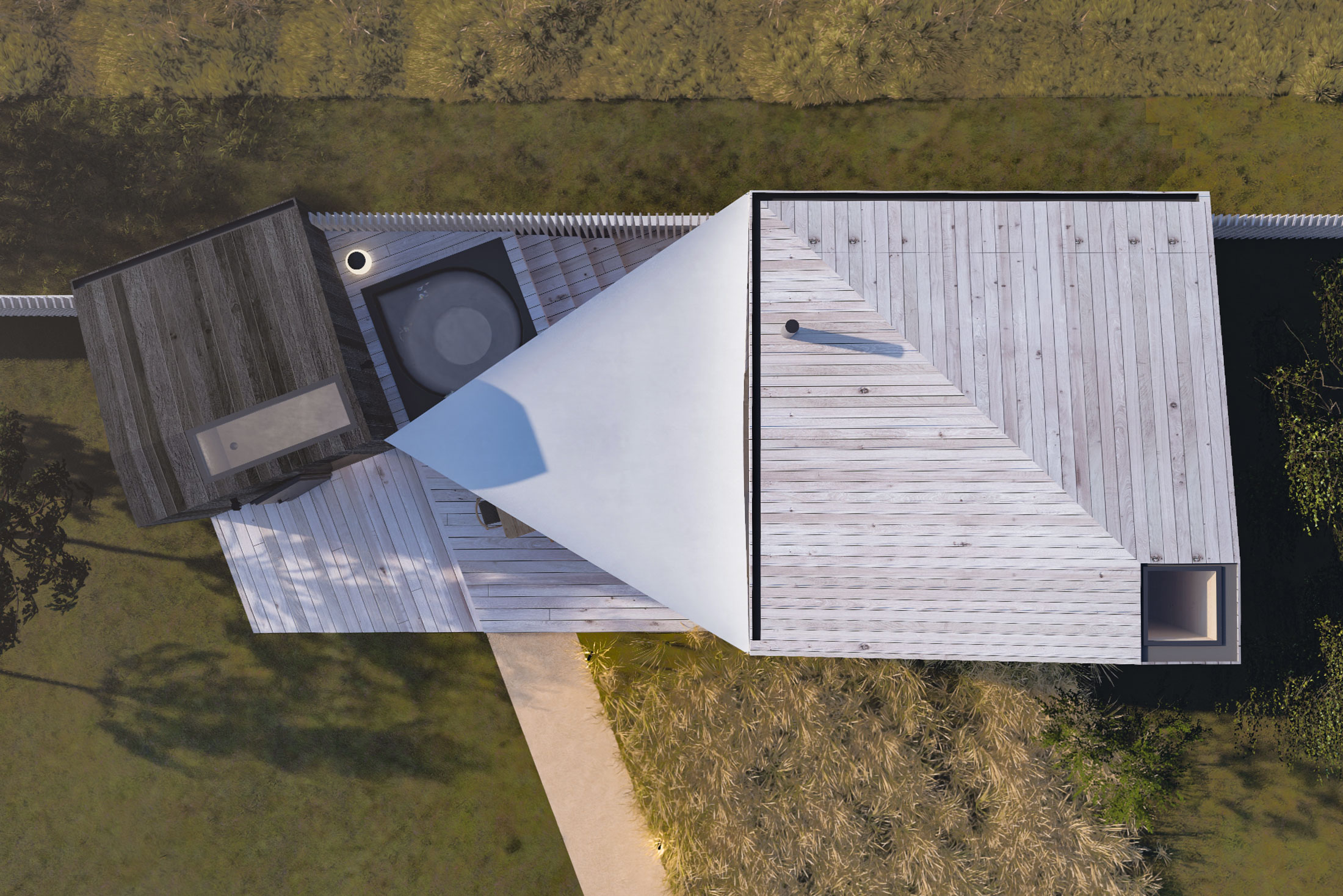 Větší z nich, srdce tohoto útočiště, v sobě ukrývá kuchyň s krbem a malým posezením. Schodiště dolů nás dovede do vinného sklípku prosvětleného skleněným stropem a světlíkem. Menší domek, s fasádou z opalovaného dřeva starobylou japonskou technikou, nabízí pravou finskou saunu se šatnou a sprchou. Unikátnost projektu spočívá v umístění domků dva metry od hranice pozemku, zatímco plot se stahuje na jejich úroveň. Pohledy z oken tak plynou volně do krajiny, nerušené žádnou překážkou. Pozemek zůstává chráněný, a přesto otevřený světu.