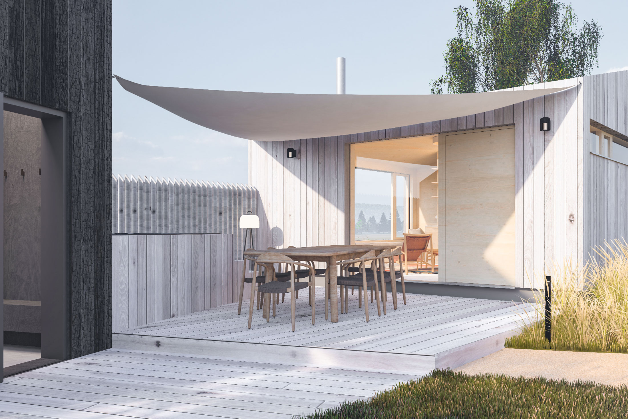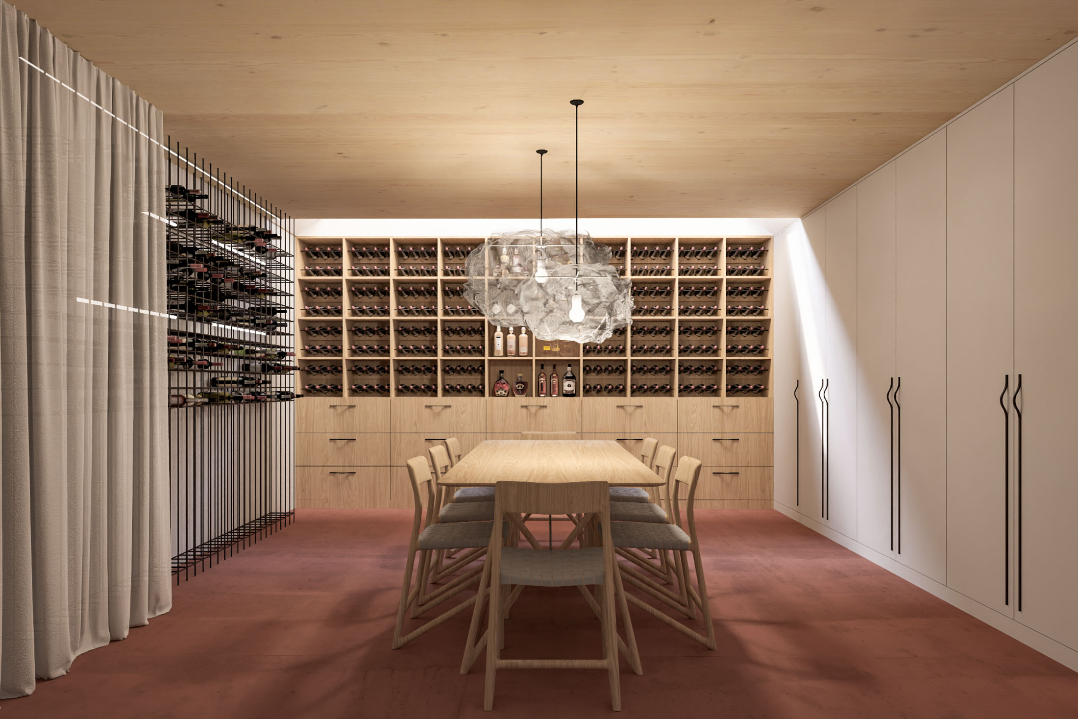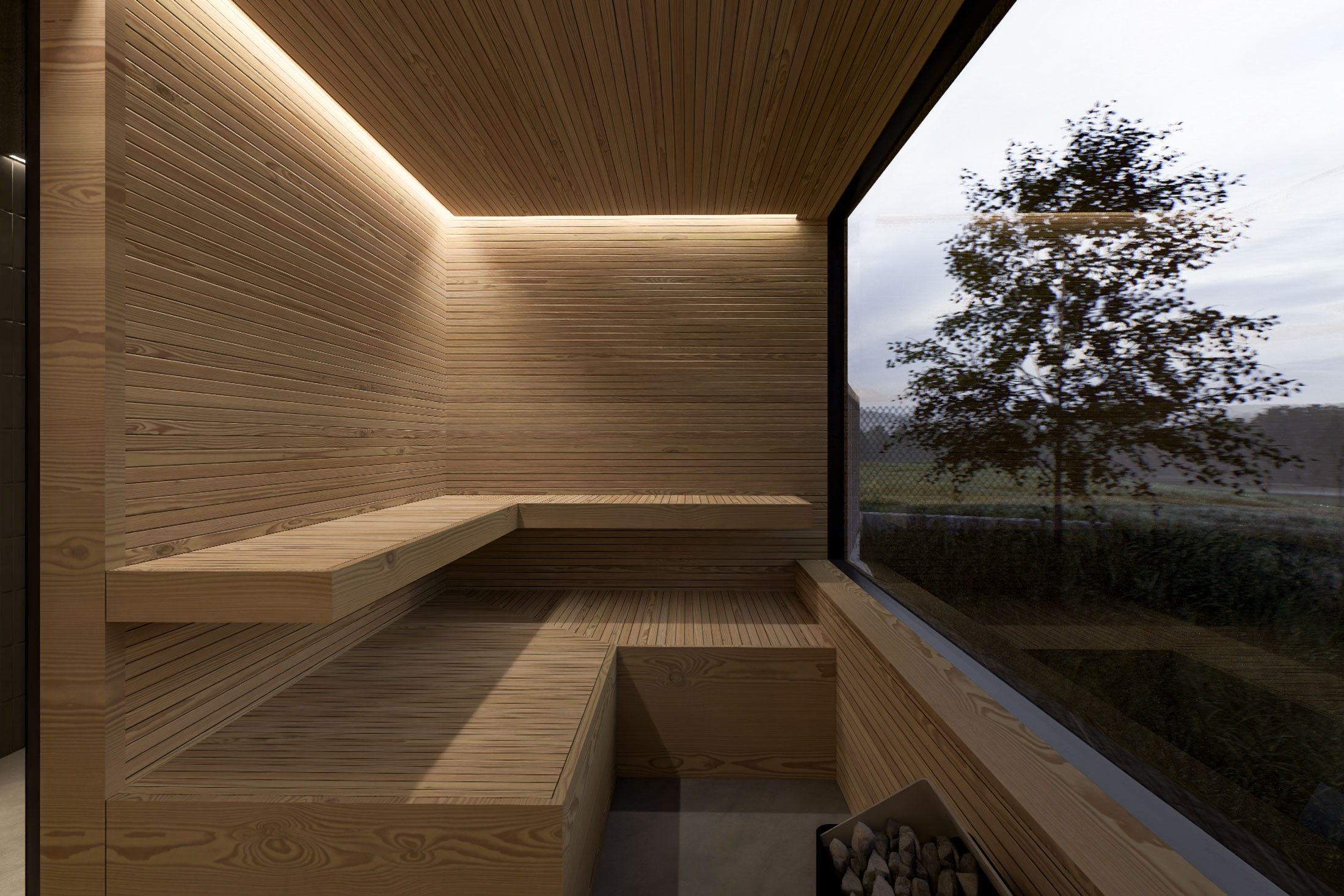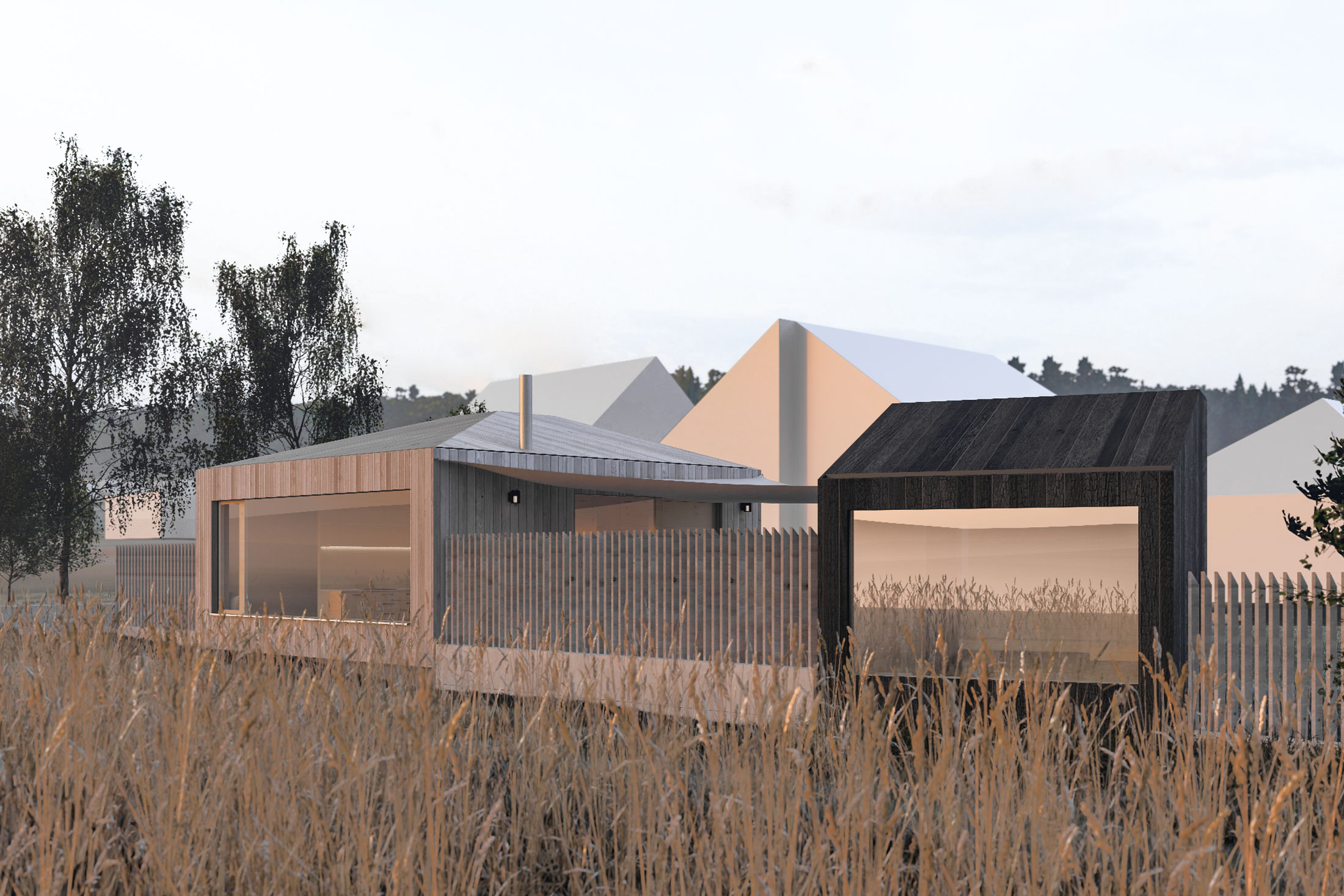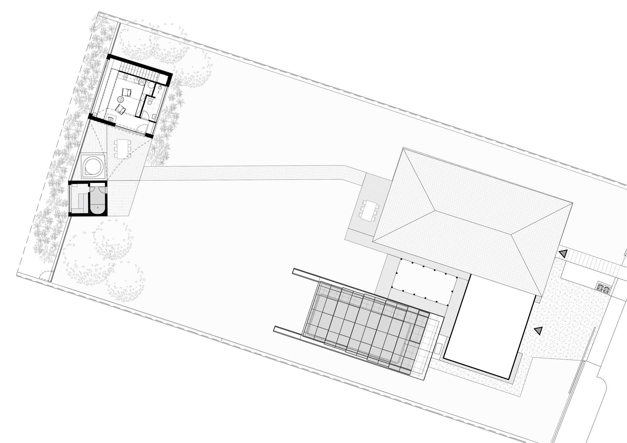 Větší z nich, srdce tohoto útočiště, v sobě ukrývá kuchyň s krbem a malým posezením. Schodiště dolů nás dovede do vinného sklípku prosvětleného skleněným stropem a světlíkem. Menší domek, s fasádou z opalovaného dřeva starobylou japonskou technikou, nabízí pravou finskou saunu se šatnou a sprchou. Unikátnost projektu spočívá v umístění domků dva metry od hranice pozemku, zatímco plot se stahuje na jejich úroveň. Pohledy z oken tak plynou volně do krajiny, nerušené žádnou překážkou. Pozemek zůstává chráněný, a přesto otevřený světu.