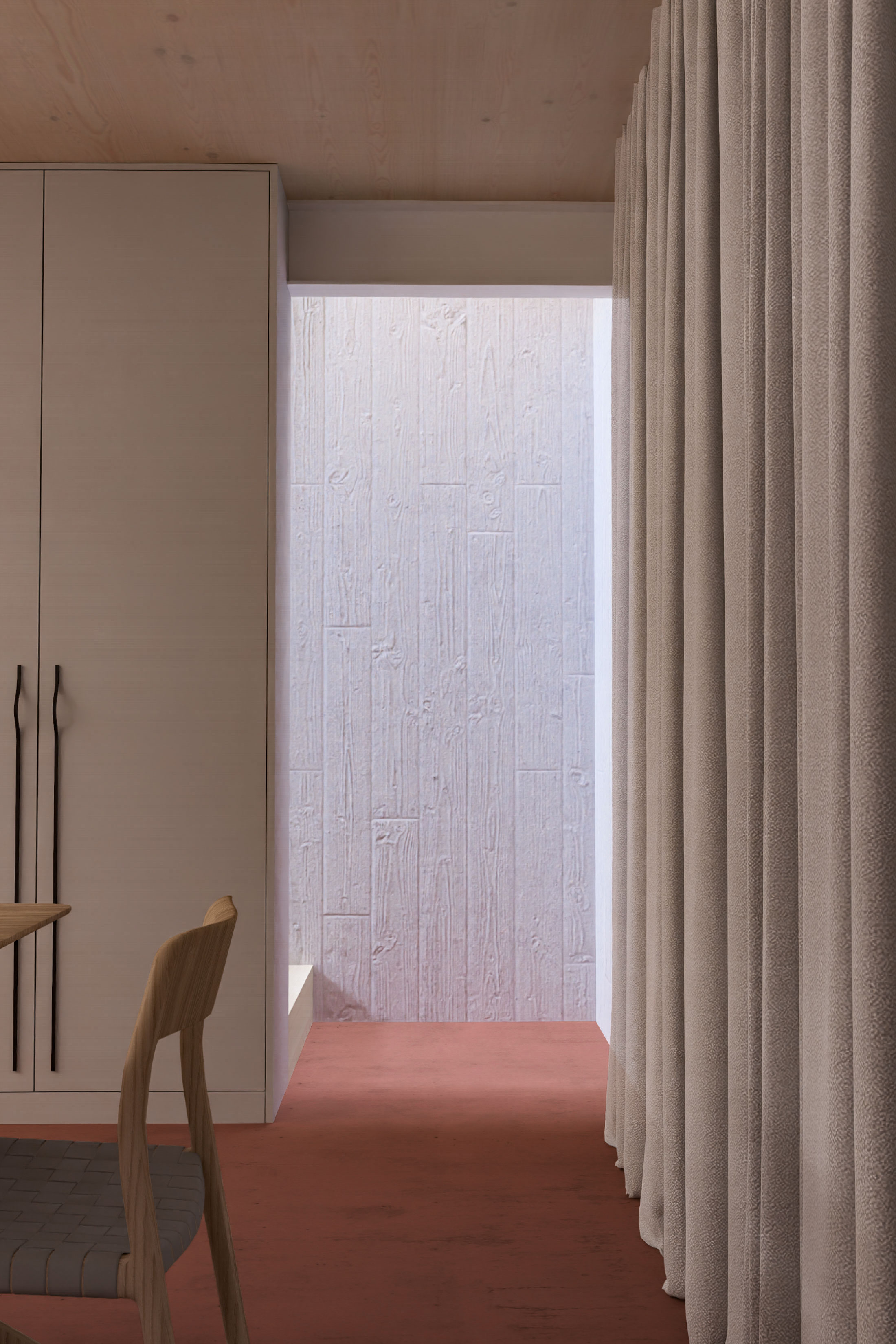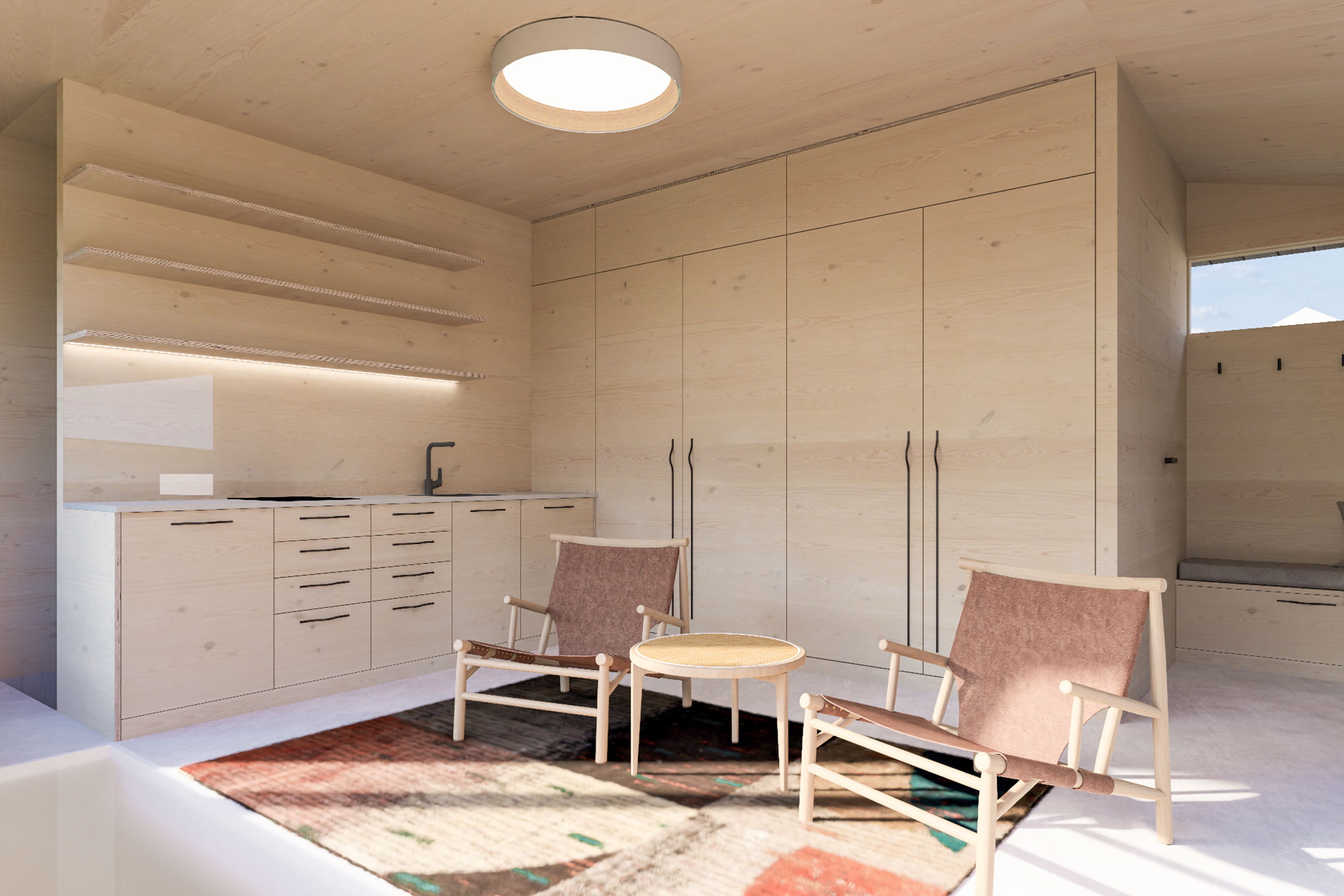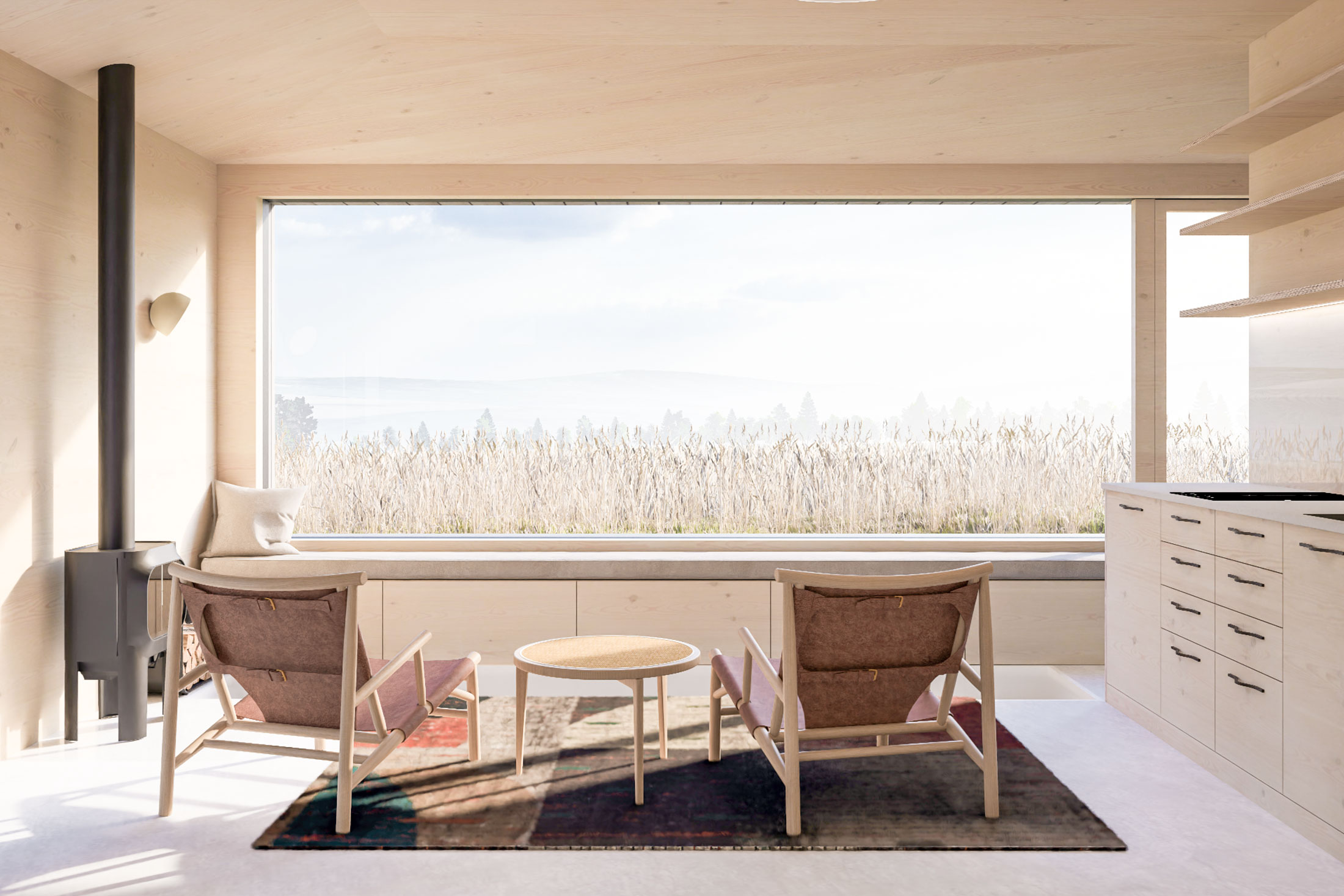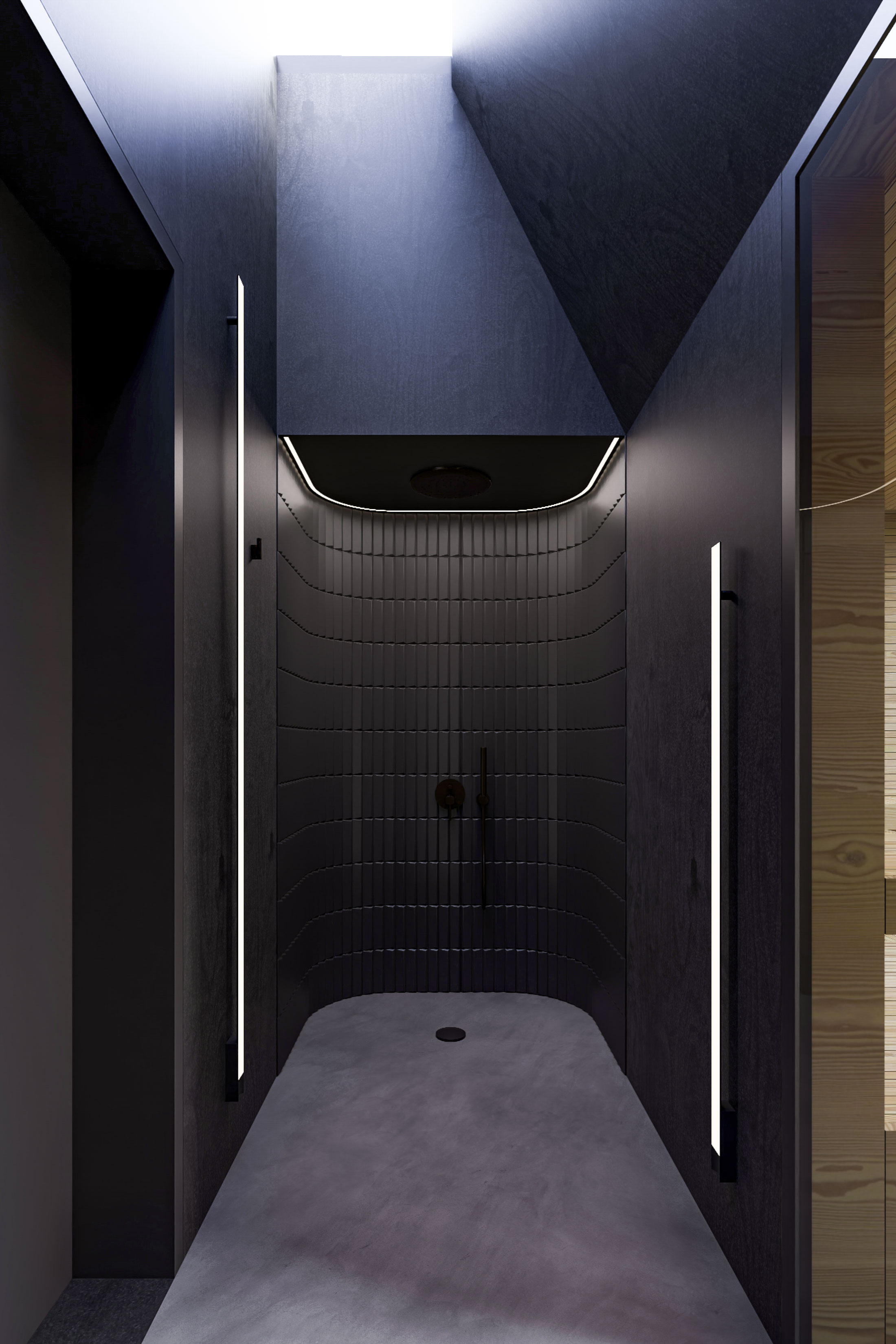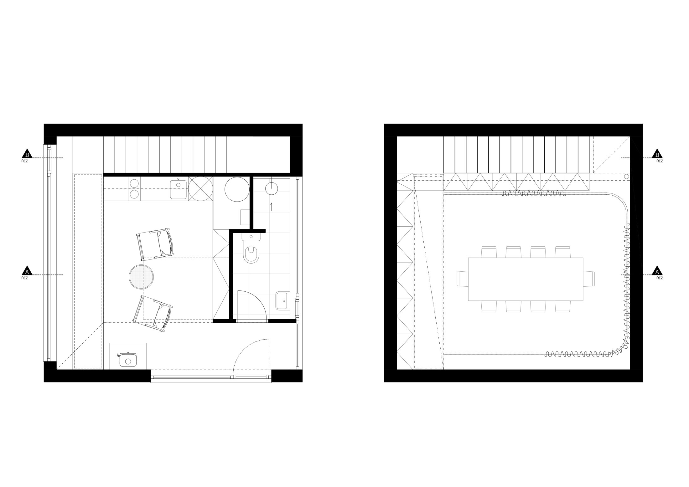 Větší z nich, srdce tohoto útočiště, v sobě ukrývá kuchyň s krbem a malým posezením. Schodiště dolů nás dovede do vinného sklípku prosvětleného skleněným stropem a světlíkem. Menší domek, s fasádou z opalovaného dřeva starobylou japonskou technikou, nabízí pravou finskou saunu se šatnou a sprchou. Unikátnost projektu spočívá v umístění domků dva metry od hranice pozemku, zatímco plot se stahuje na jejich úroveň. Pohledy z oken tak plynou volně do krajiny, nerušené žádnou překážkou. Pozemek zůstává chráněný, a přesto otevřený světu.