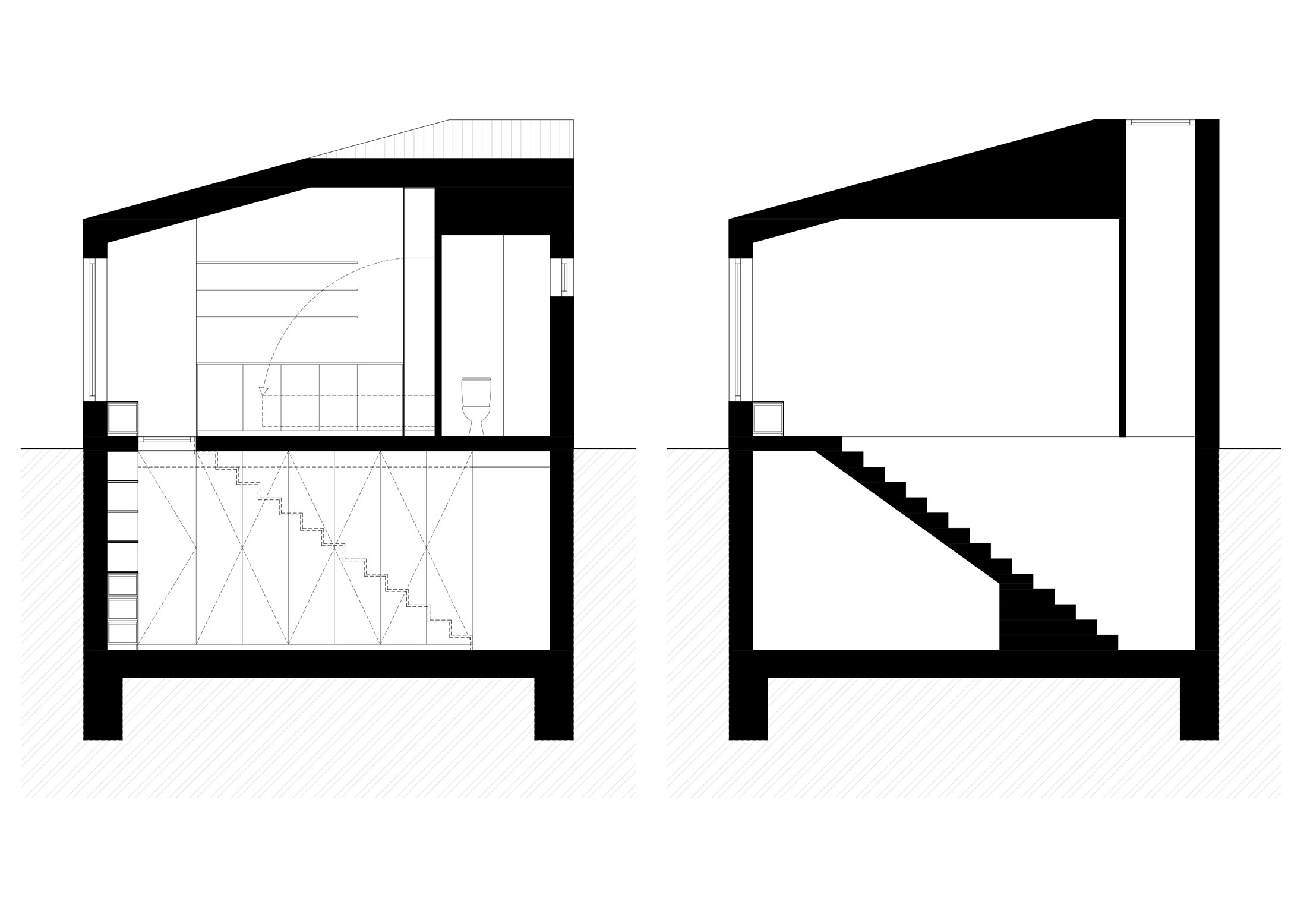 Na konci zahrady rodinného domu v Kamenném Přívozu, kde pole přechází v krajinu, se rodí záměr zahradního domku. Dva dřevěné objekty, spočívající v tichém rozhovoru s přírodou, hledí přes údolí řeky Sázavy do hlubin lesů. Tvarově i svými materiály jsou to trochu bratři, svým postavením a barevností jsou každý trochu jiný. Spojuje je ovšem prostorná společná terasa.