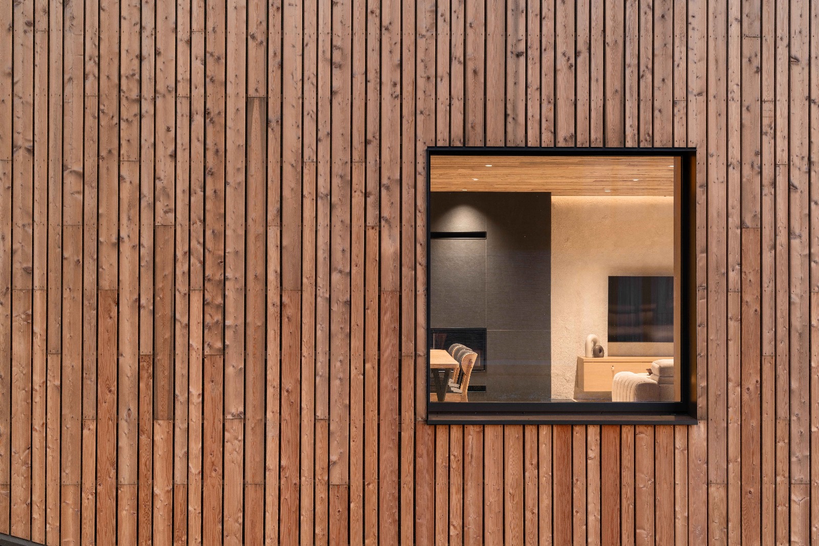Materiálové řešení podporuje propojení stavby s okolní krajinou. Fasáda je obložena sibiřským modřínem se střídáním dvou šířek prken v nepravidelném rytmu, který se opakuje na terasách, dřevěných podlahách interiérů i obkladech stěn společných prostor. Suterénní podlaží kombinuje plechový obklad a gabionové koše, střecha je navržena z falcovaného plechu v barevné shodě s podnoží.