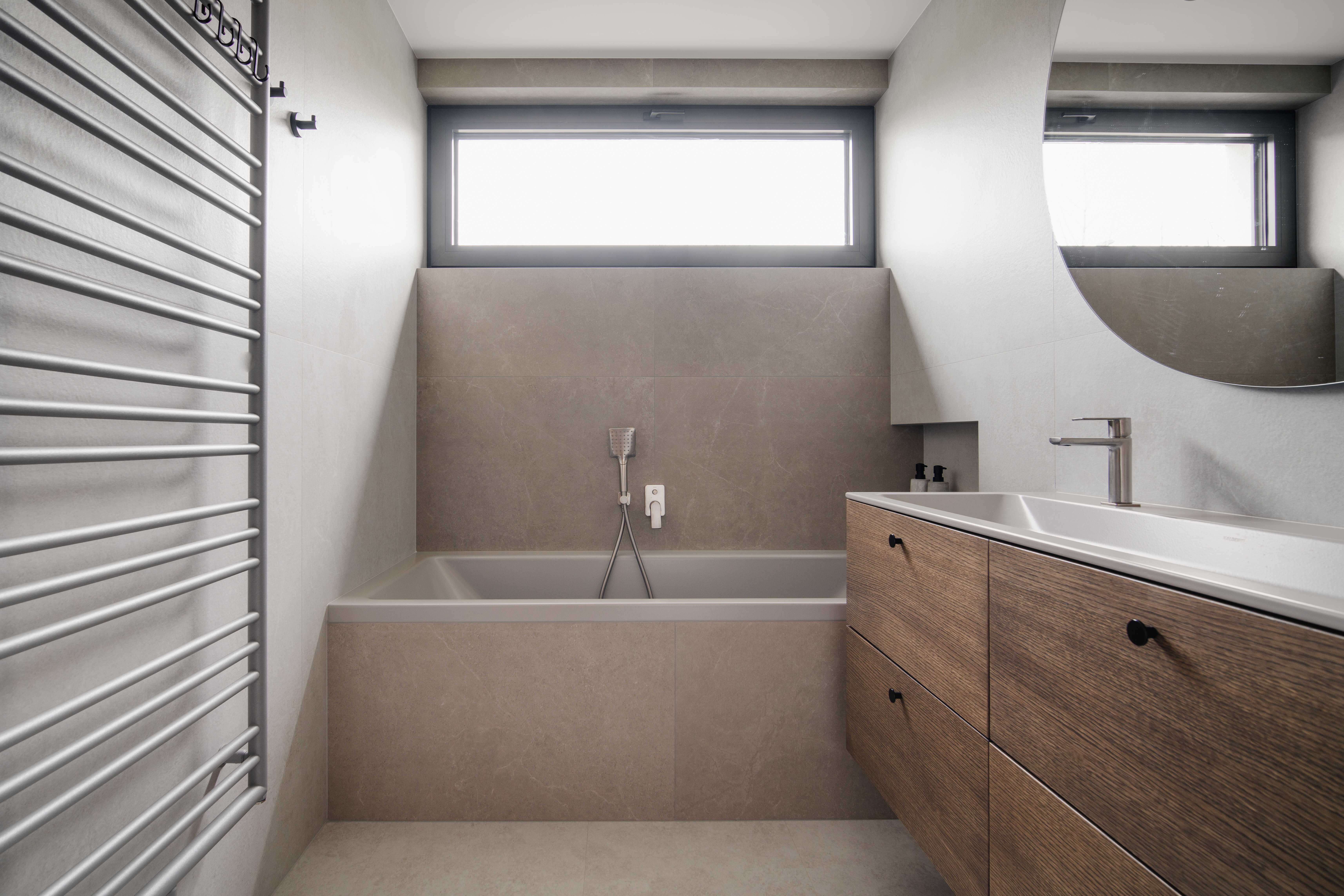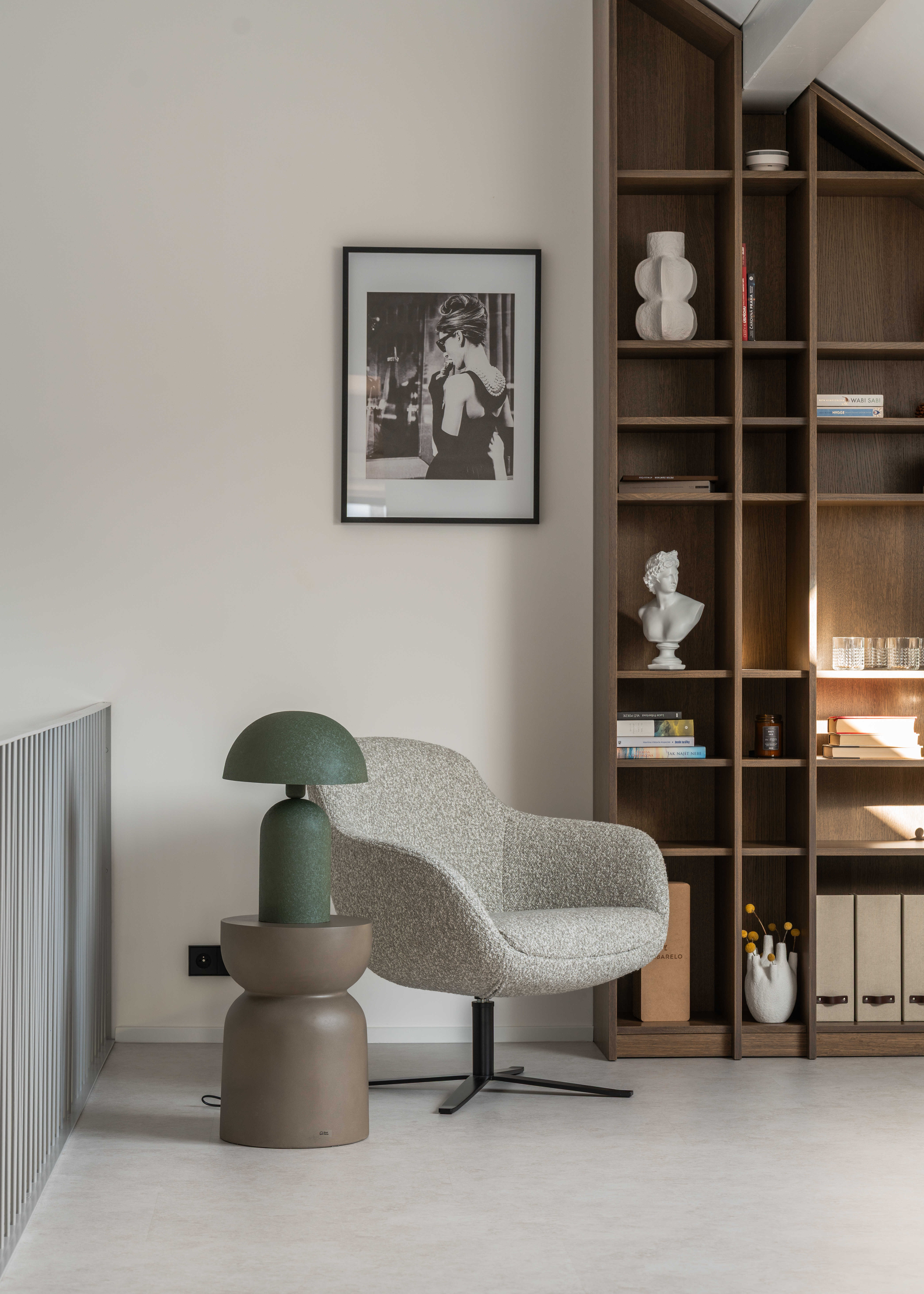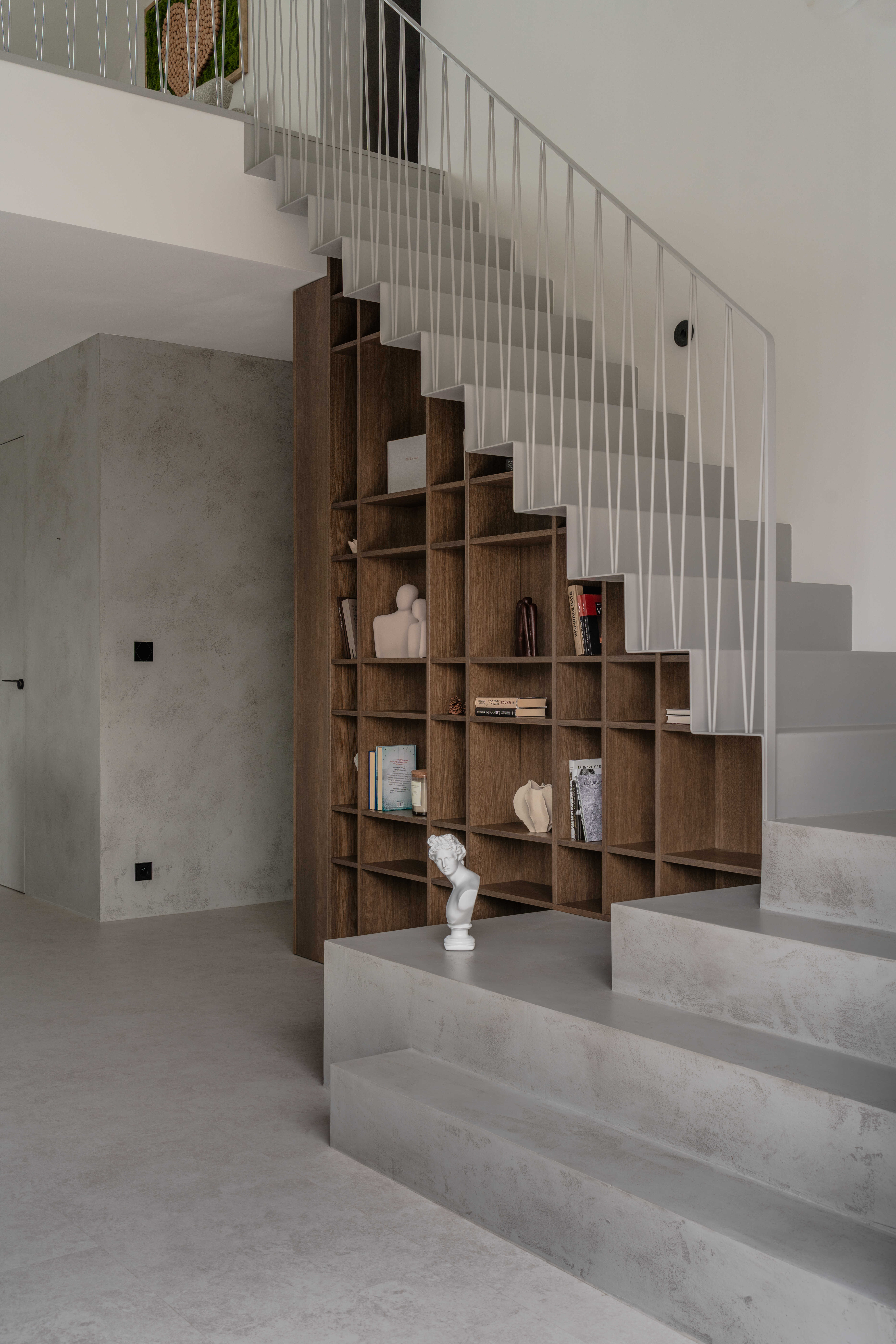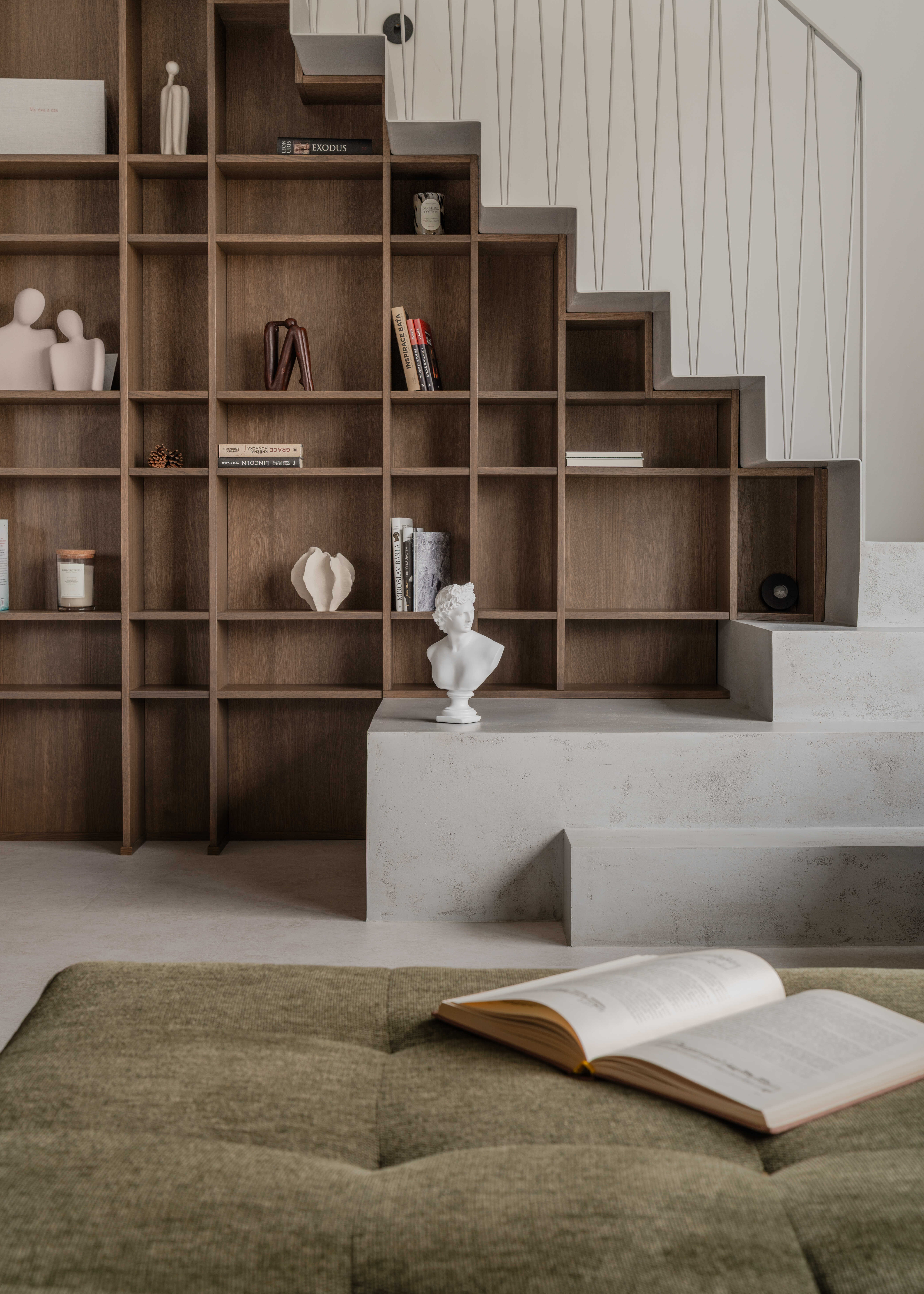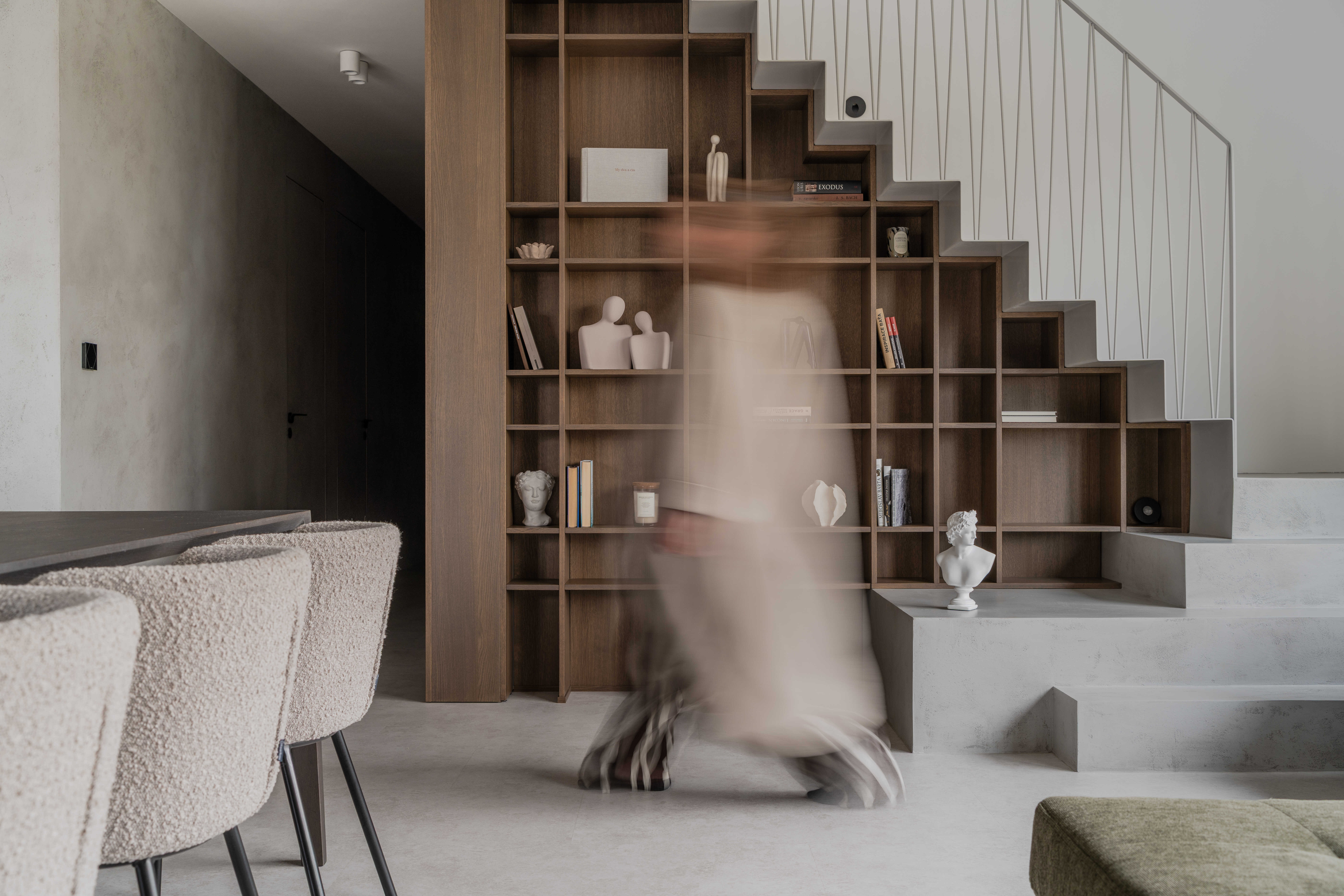 Materiálově je návrh založen na kontrastu betonových stěrek a tmavě mořené dubové dýhy, která se promítá do truhlářských a nábytkových prvků a interiéru dodává hloubku bez zbytečné dekorativnosti. Výrazným detailem je zámečnické zábradlí u otevřeného patra – subtilní linie, která podtrhuje charakter prostoru. Celé řešení doplňují promyšlené úložné kapacity a precizní práce s detailem.