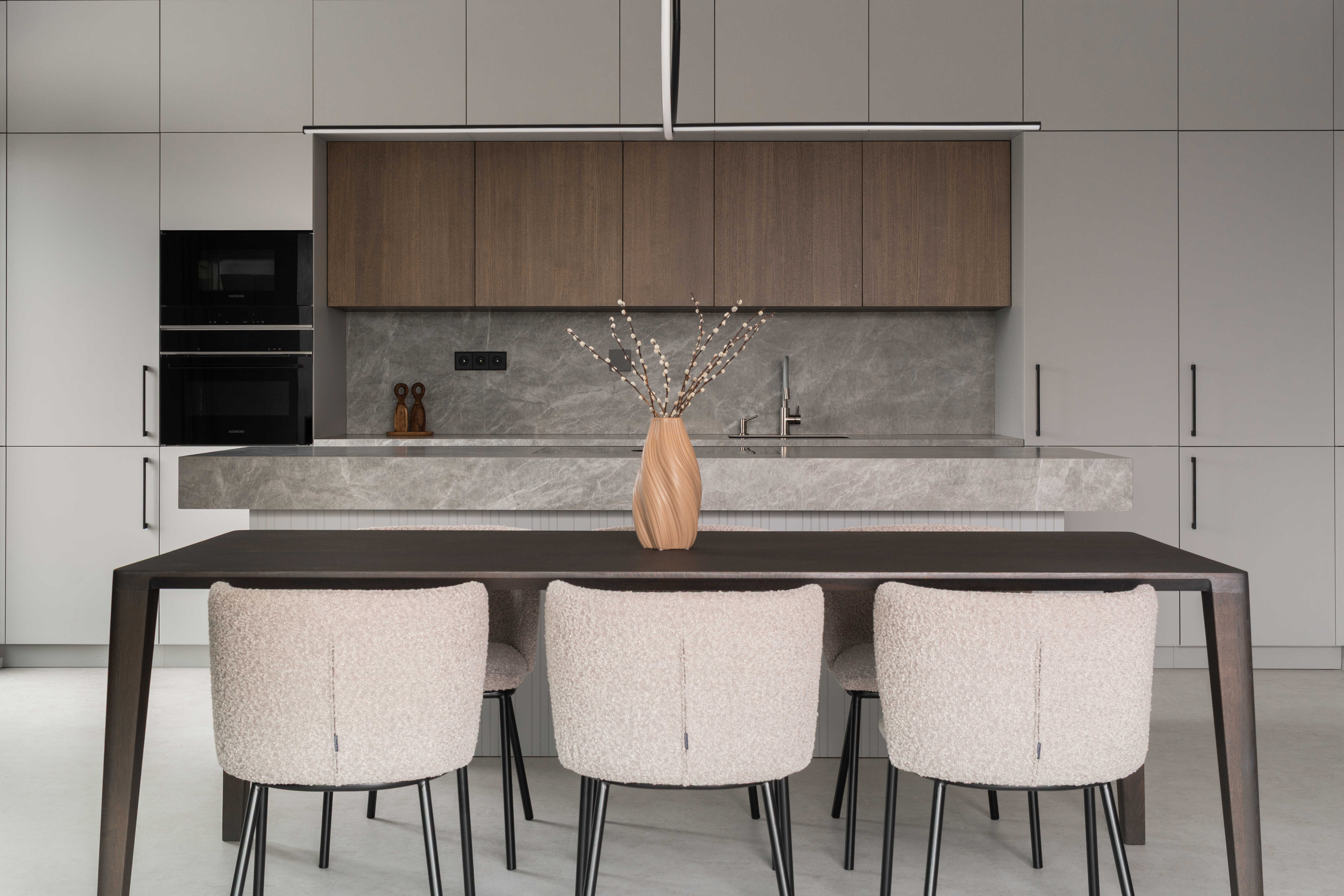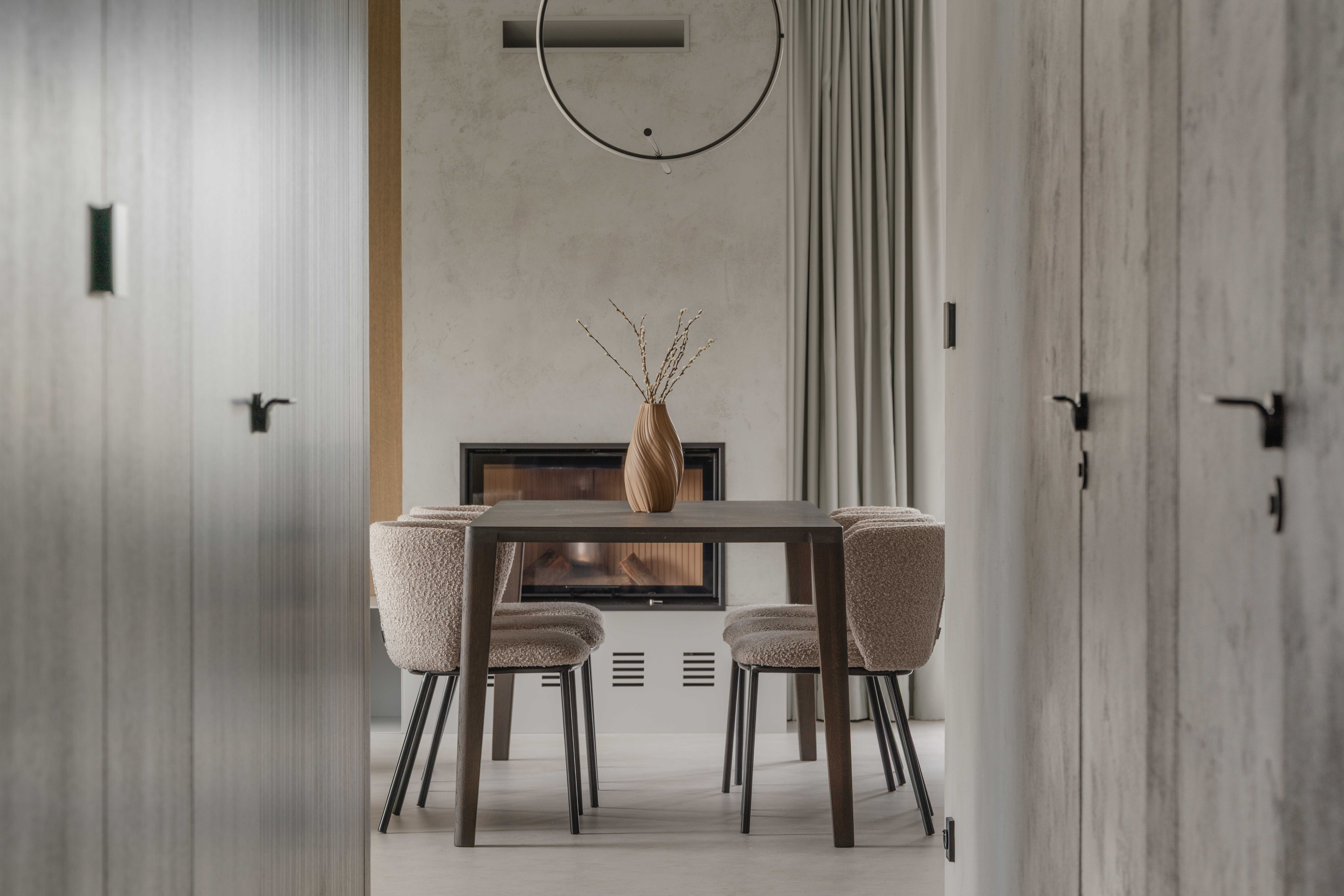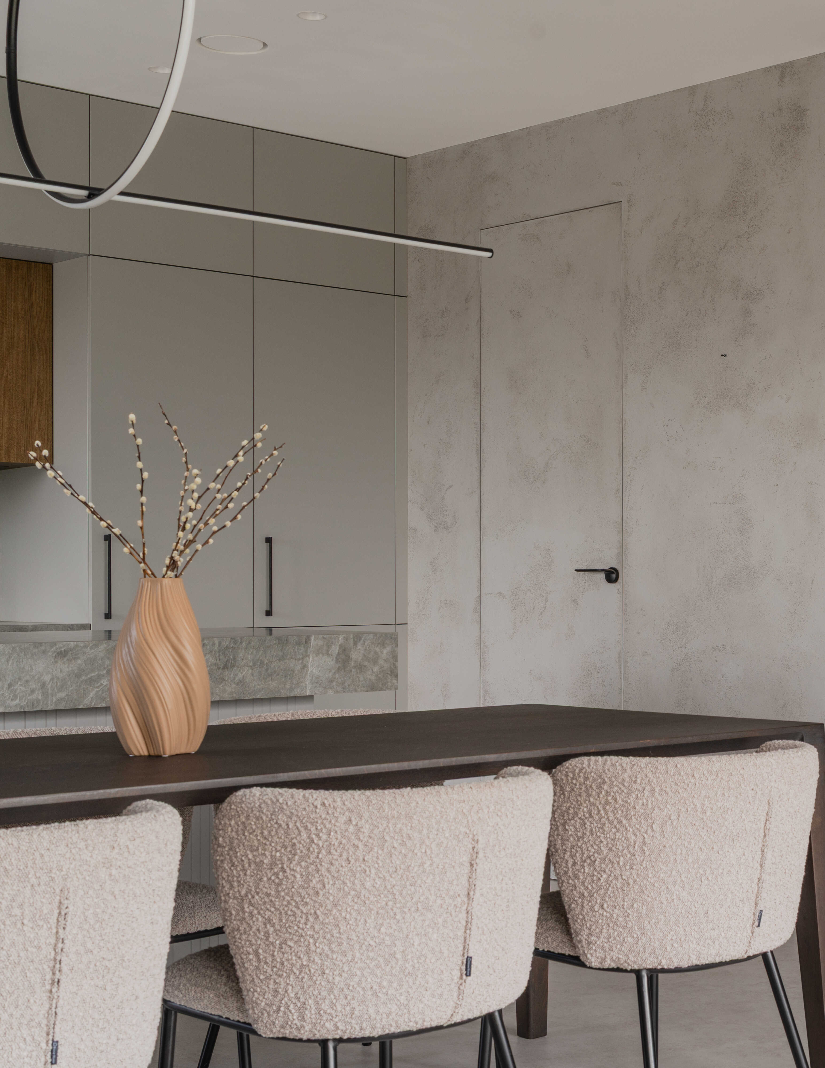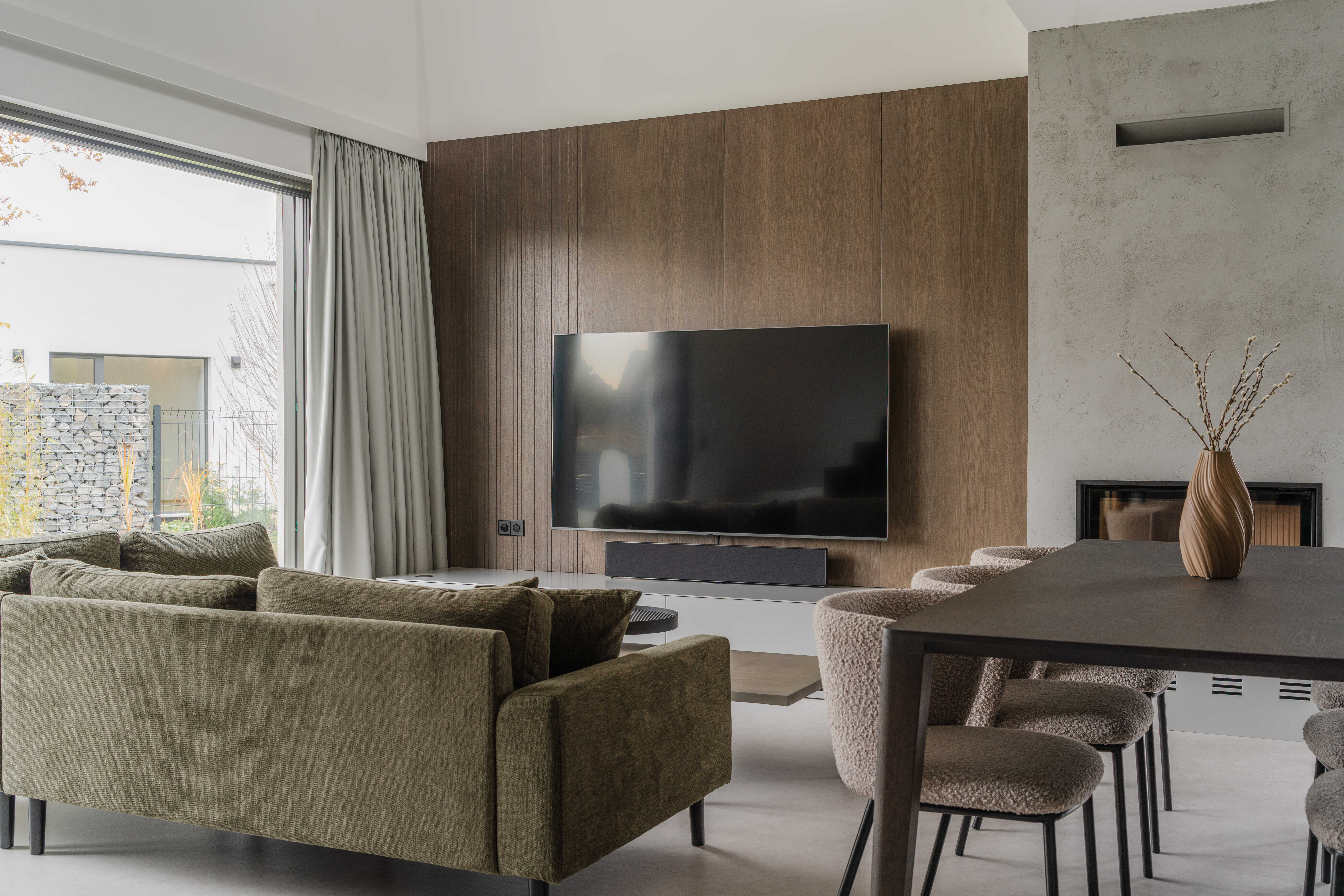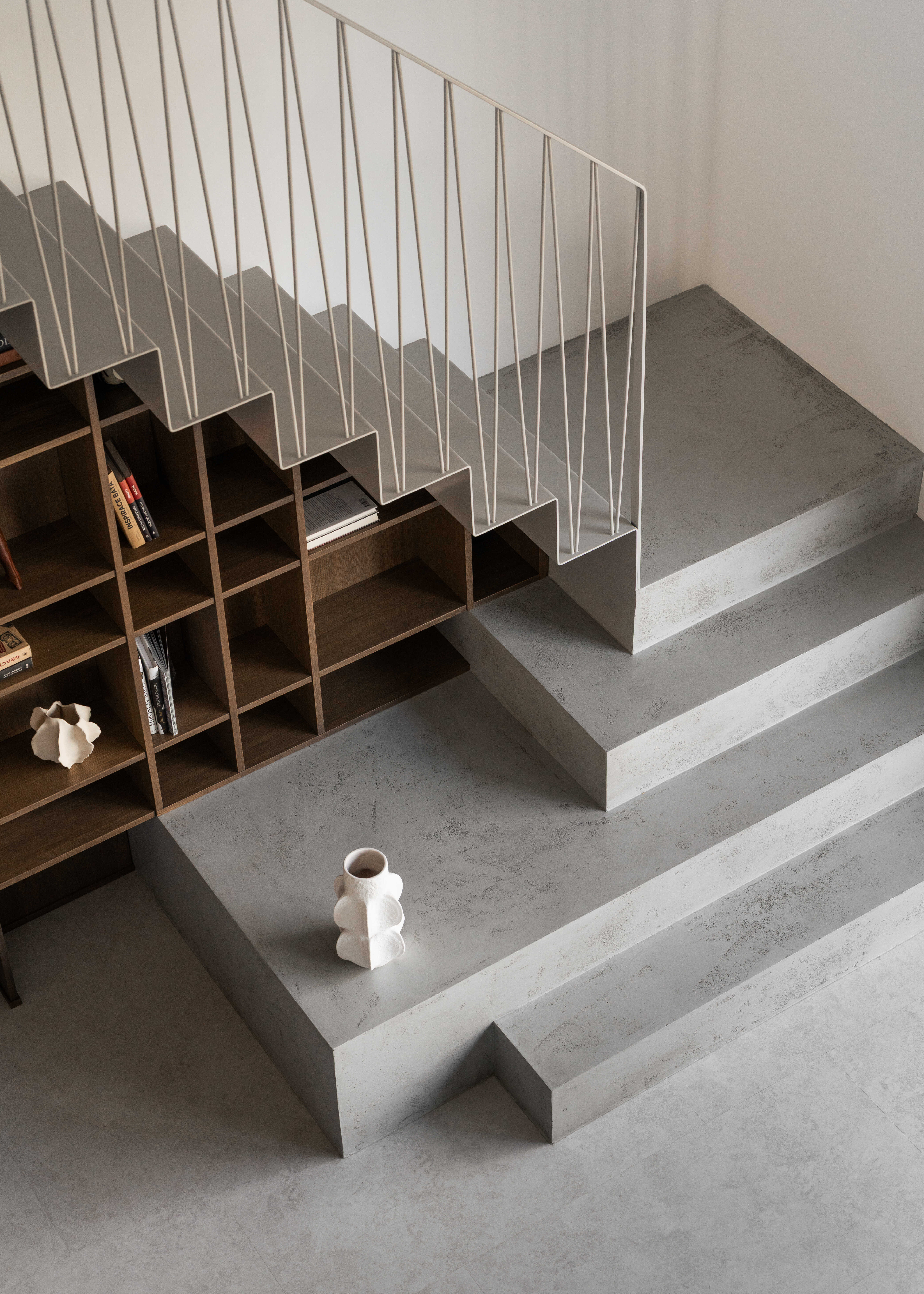 Materiálově je návrh založen na kontrastu betonových stěrek a tmavě mořené dubové dýhy, která se promítá do truhlářských a nábytkových prvků a interiéru dodává hloubku bez zbytečné dekorativnosti. Výrazným detailem je zámečnické zábradlí u otevřeného patra – subtilní linie, která podtrhuje charakter prostoru. Celé řešení doplňují promyšlené úložné kapacity a precizní práce s detailem.