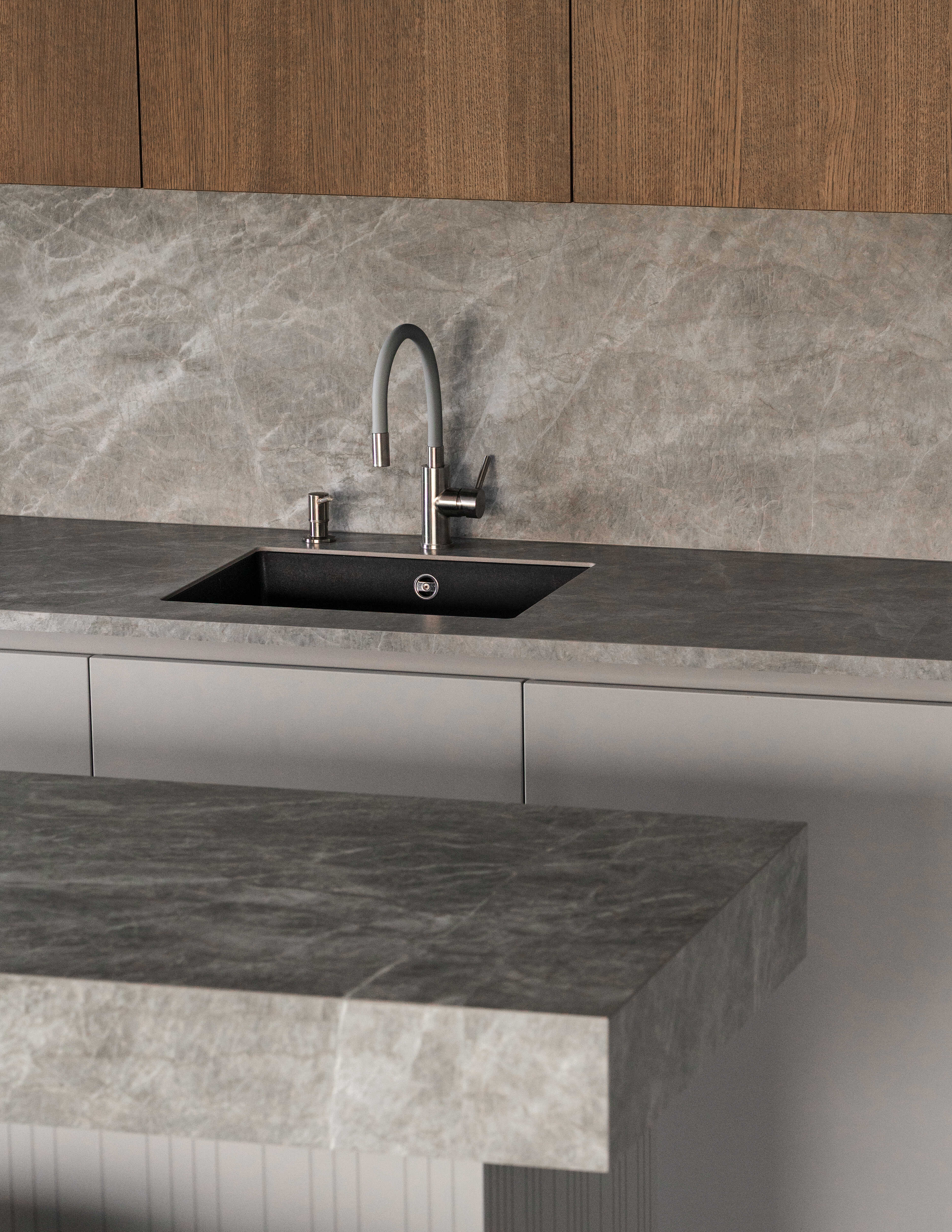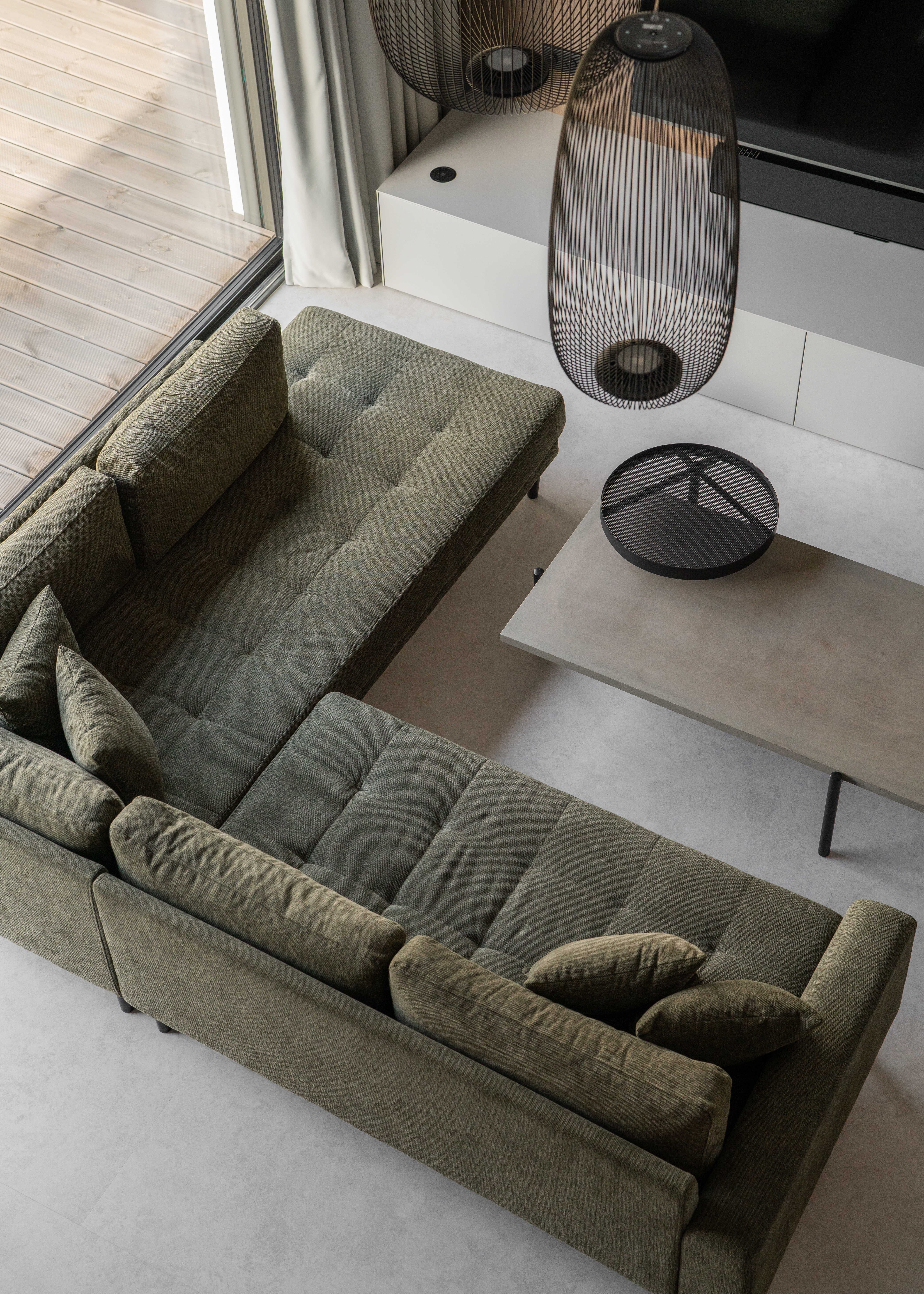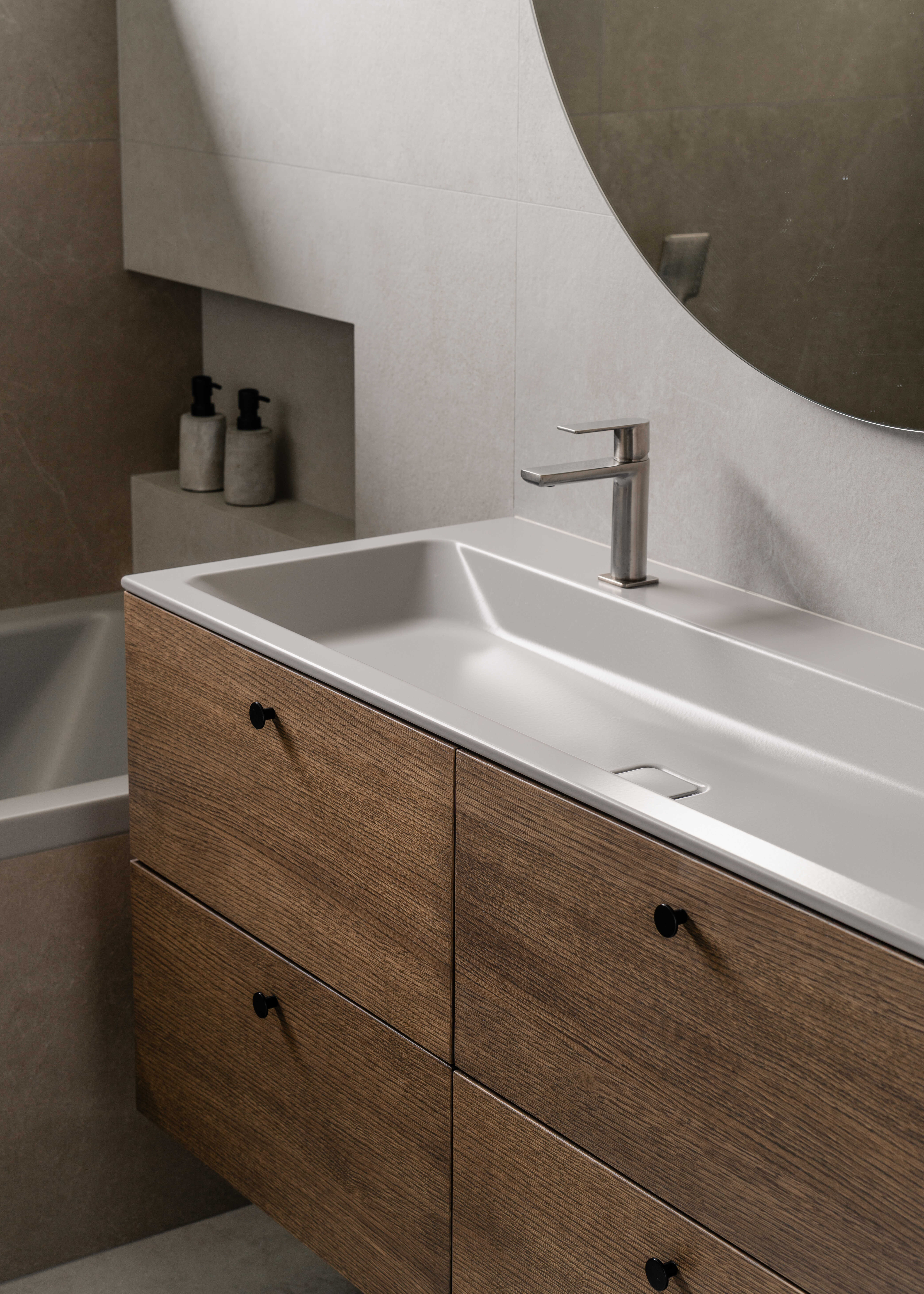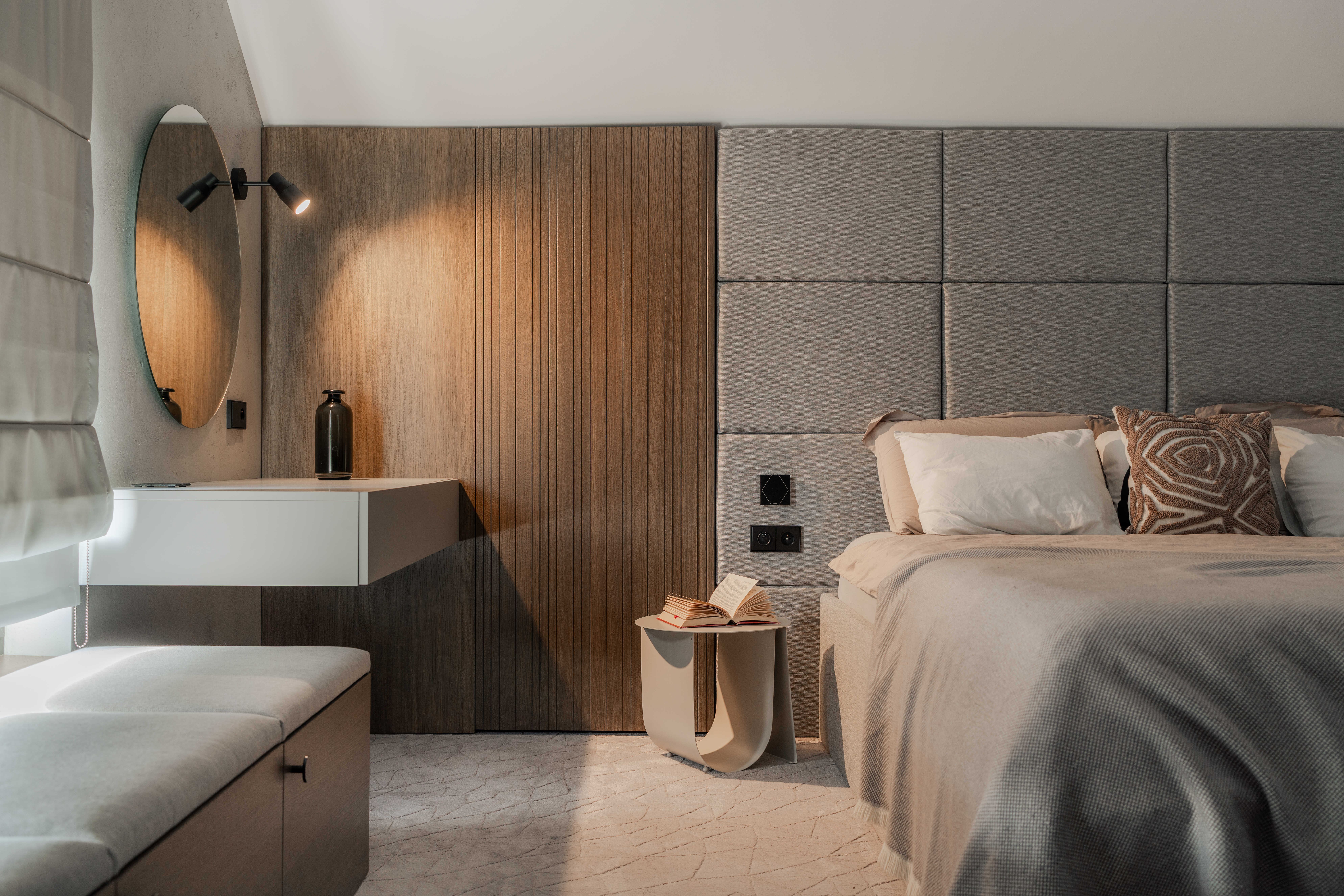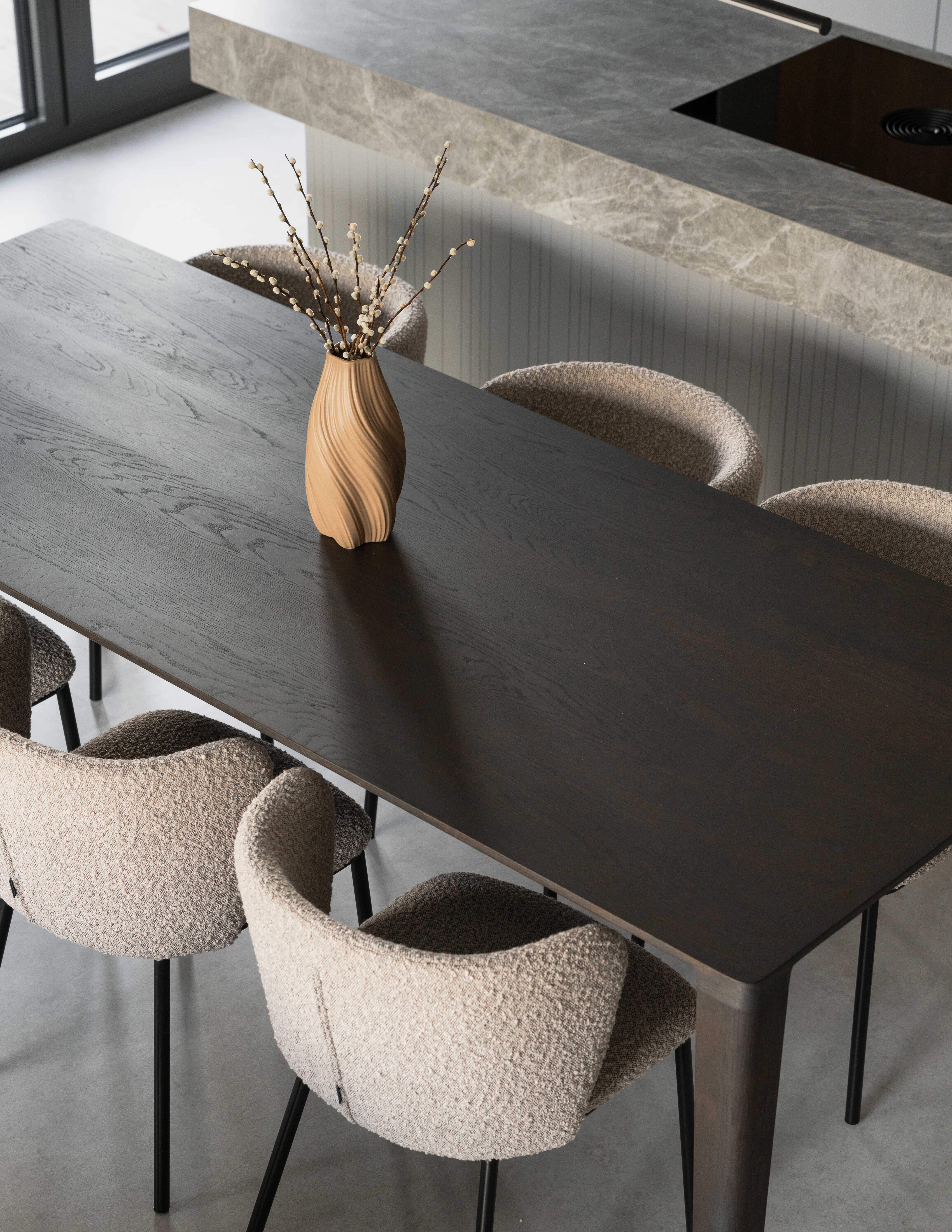 Materiálově je návrh založen na kontrastu betonových stěrek a tmavě mořené dubové dýhy, která se promítá do truhlářských a nábytkových prvků a interiéru dodává hloubku bez zbytečné dekorativnosti. Výrazným detailem je zámečnické zábradlí u otevřeného patra – subtilní linie, která podtrhuje charakter prostoru. Celé řešení doplňují promyšlené úložné kapacity a precizní práce s detailem.