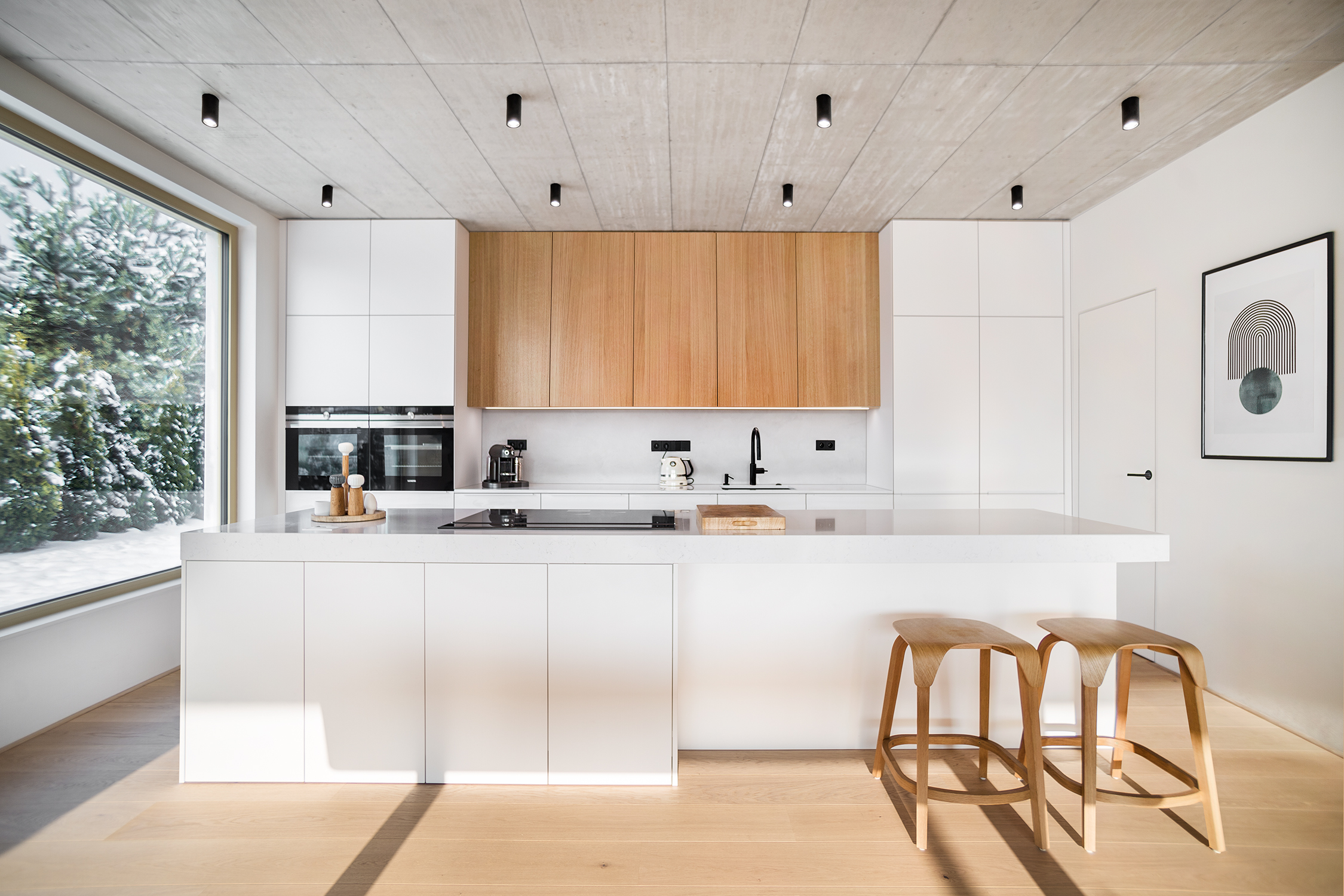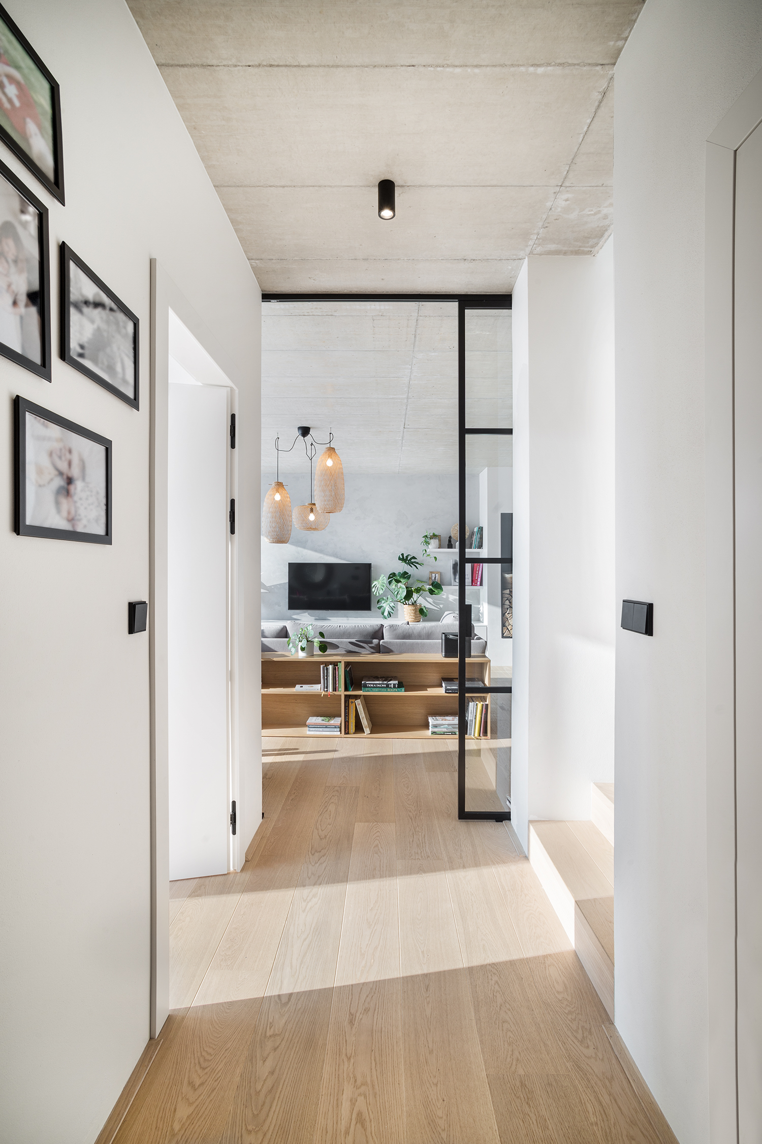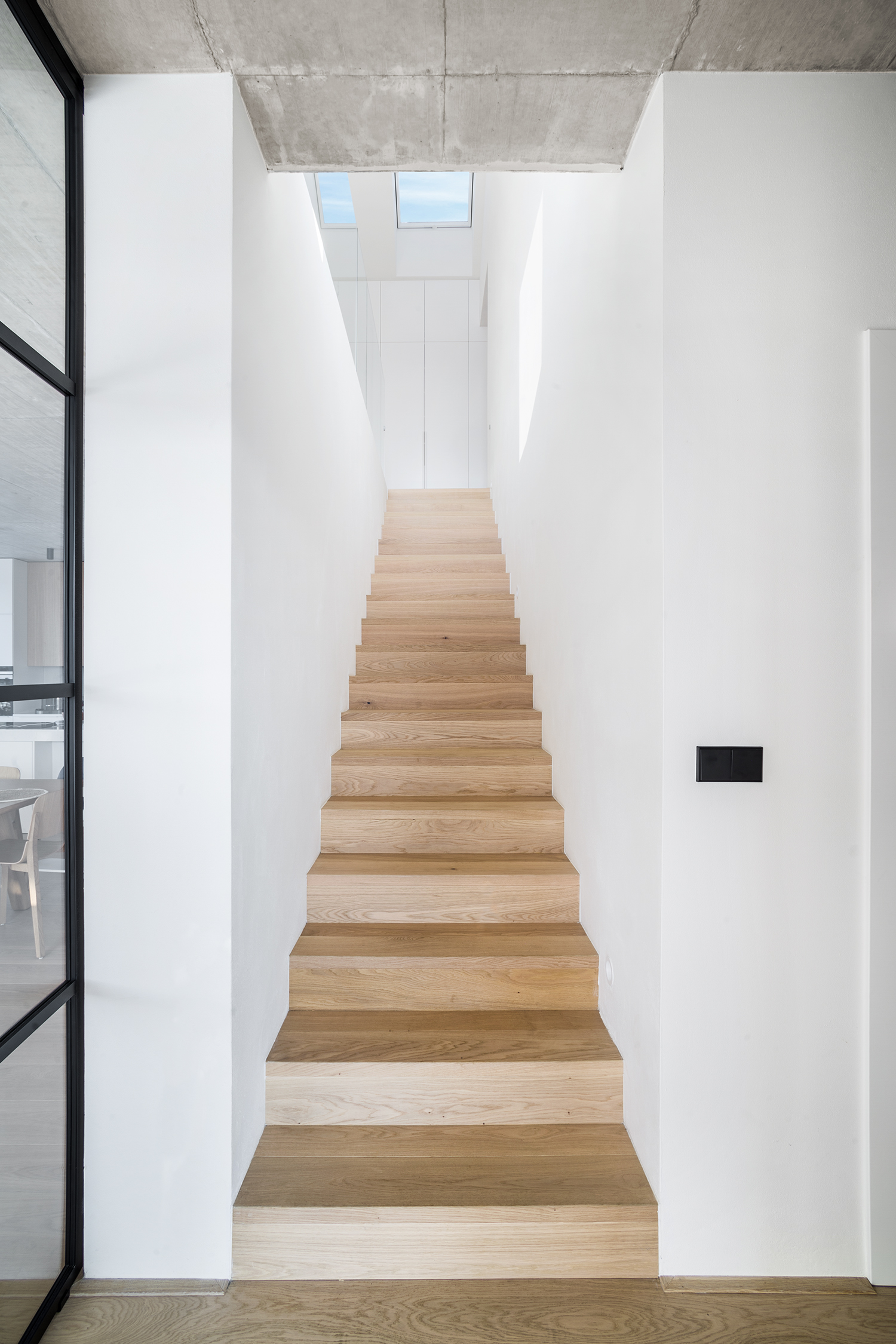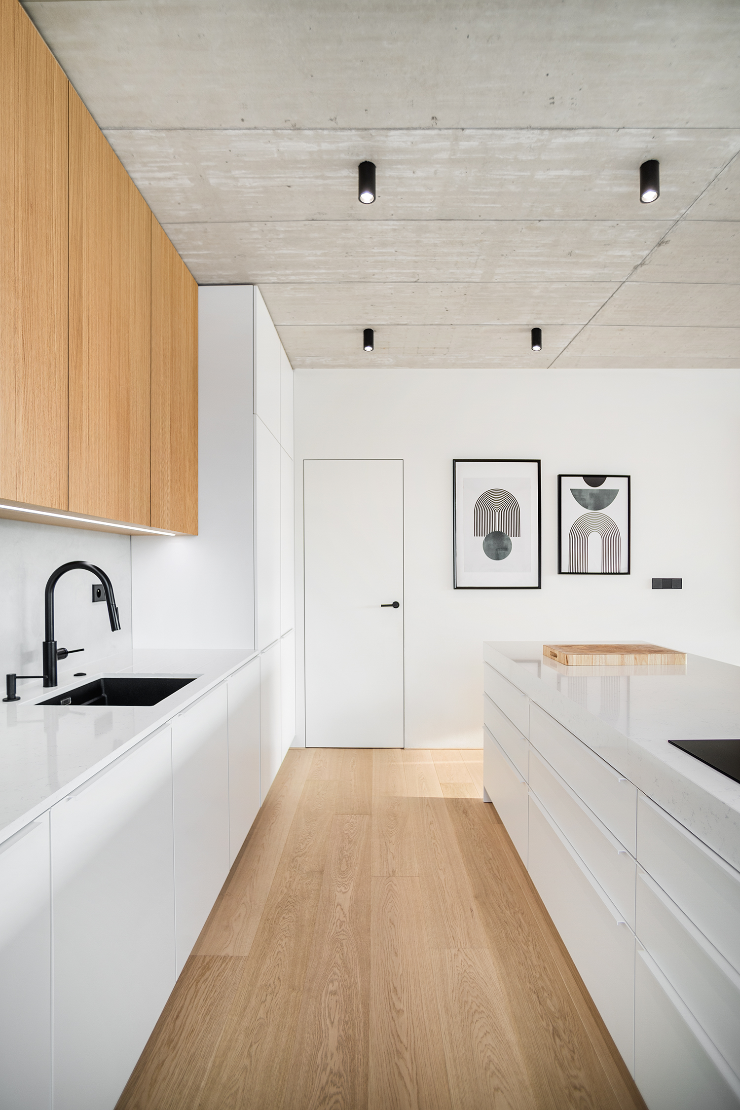 Zbylé plochy jsou ponechány v bílé výmalbě, díky čemuž působí interiér světle a čistě. Celkově stojí návrh na střídmé materialitě a nadčasové kombinaci, která nechává vyniknout prostoru, světlu a detailu.