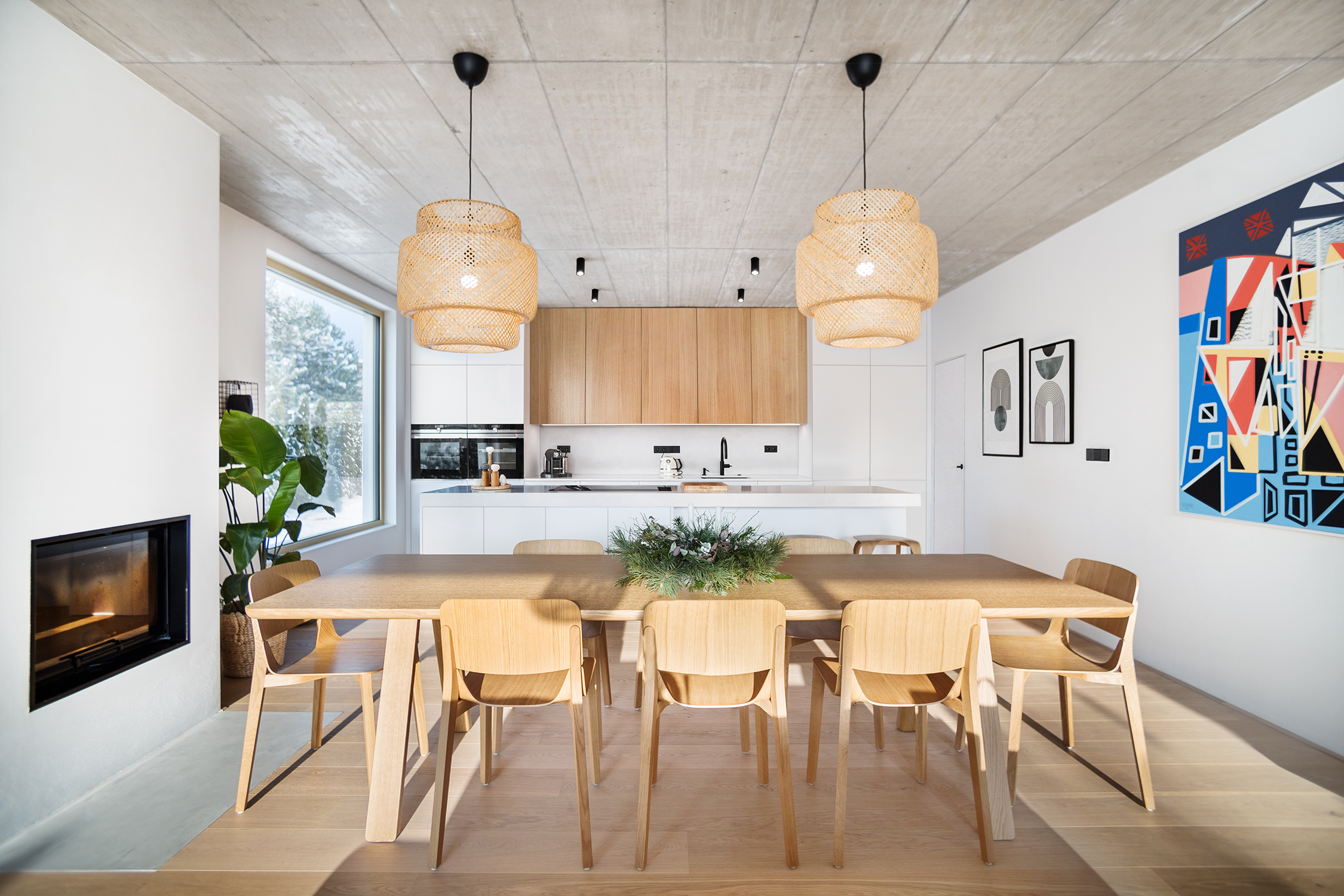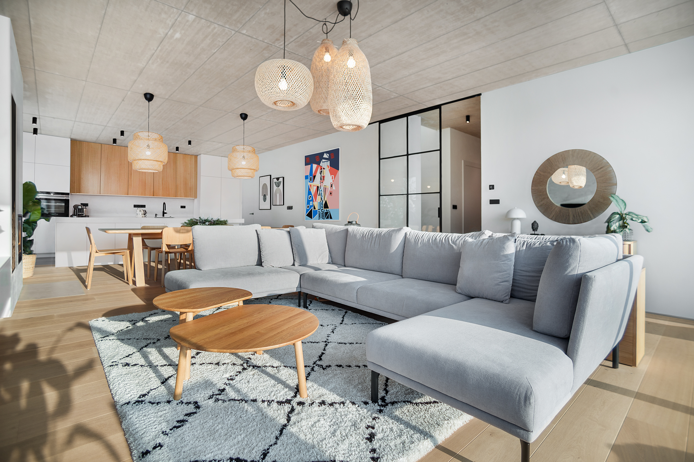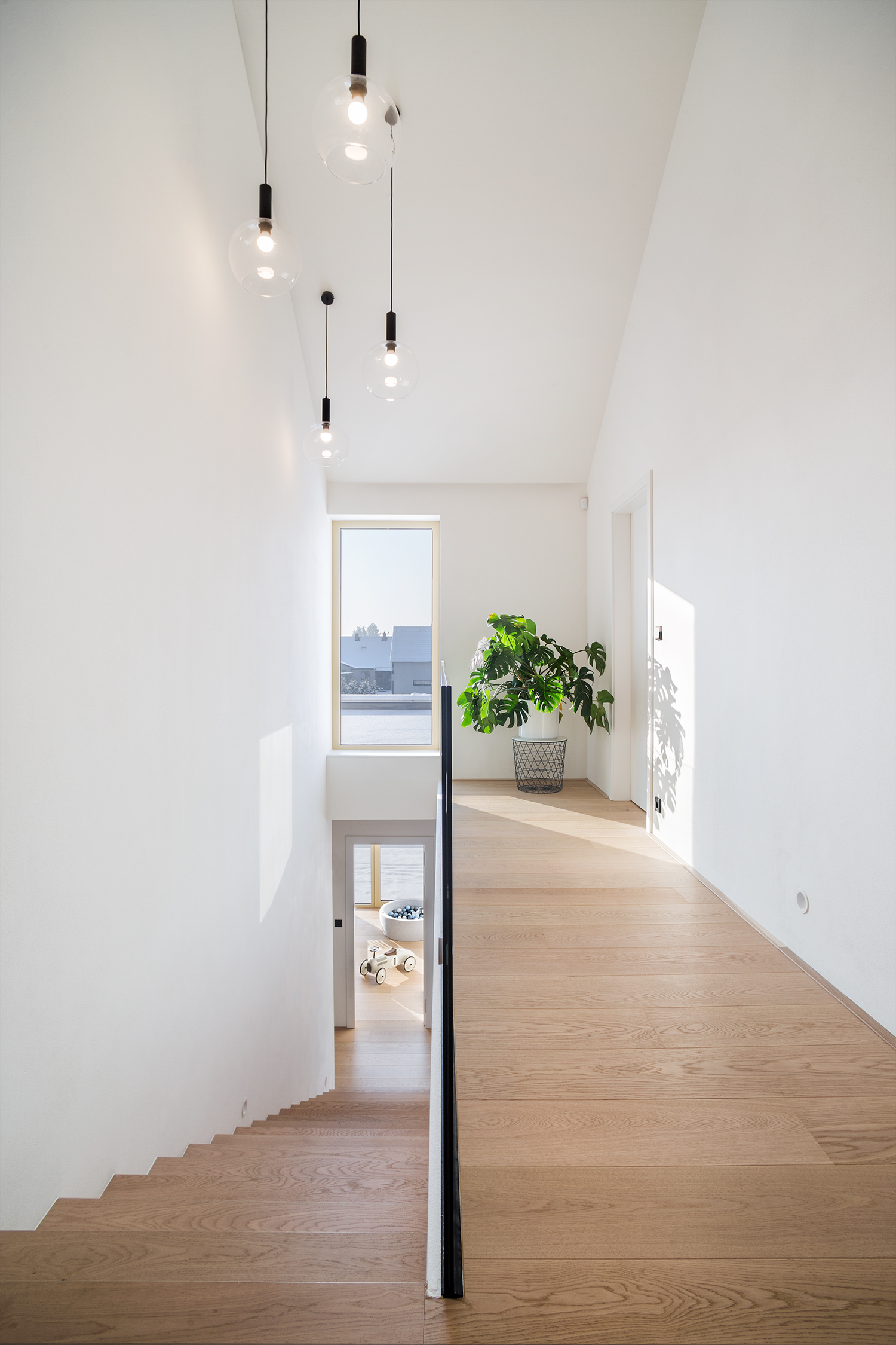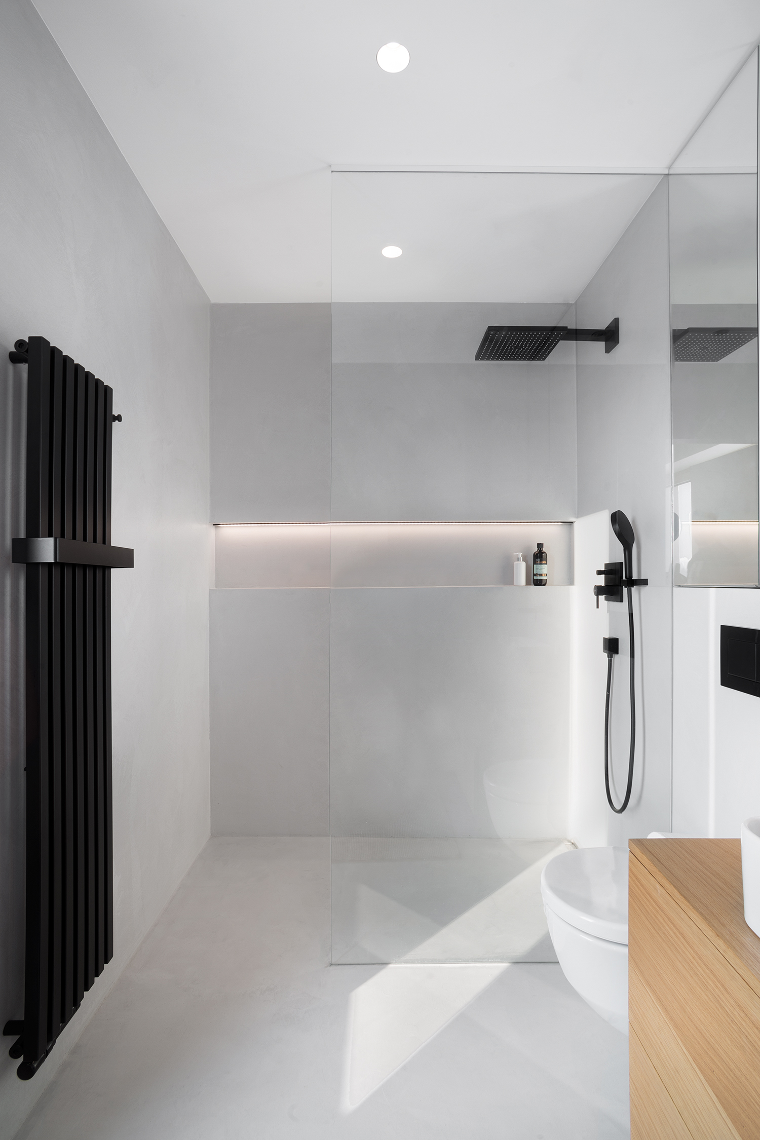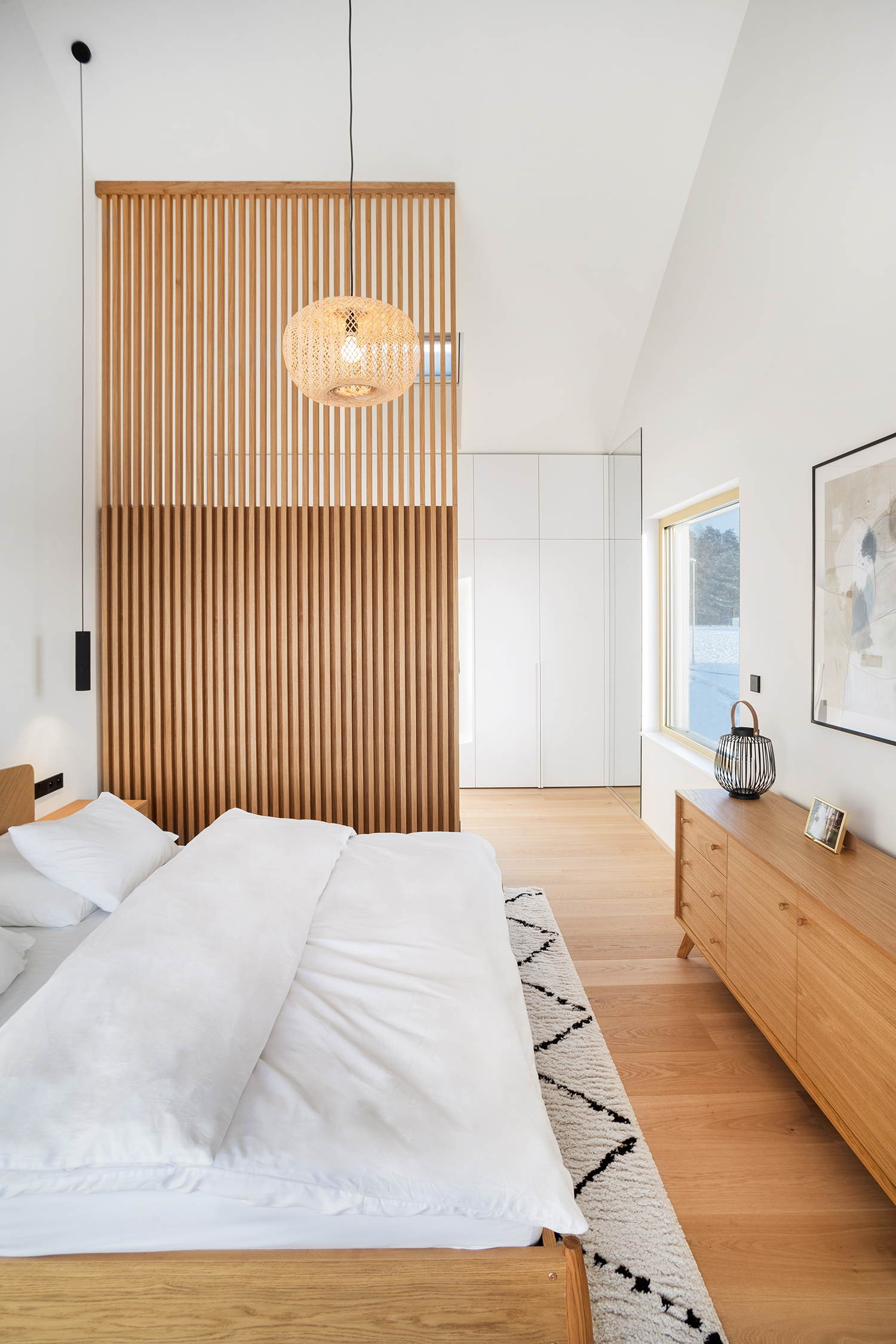 Zbylé plochy jsou ponechány v bílé výmalbě, díky čemuž působí interiér světle a čistě. Celkově stojí návrh na střídmé materialitě a nadčasové kombinaci, která nechává vyniknout prostoru, světlu a detailu.
