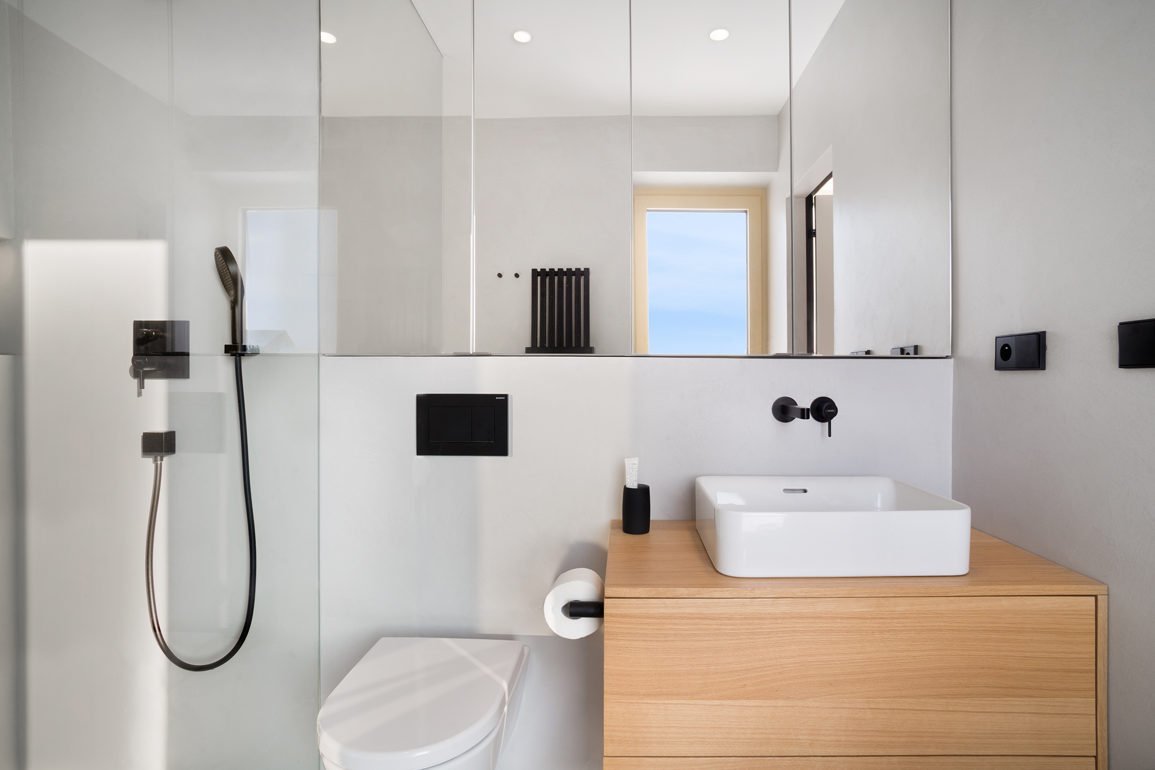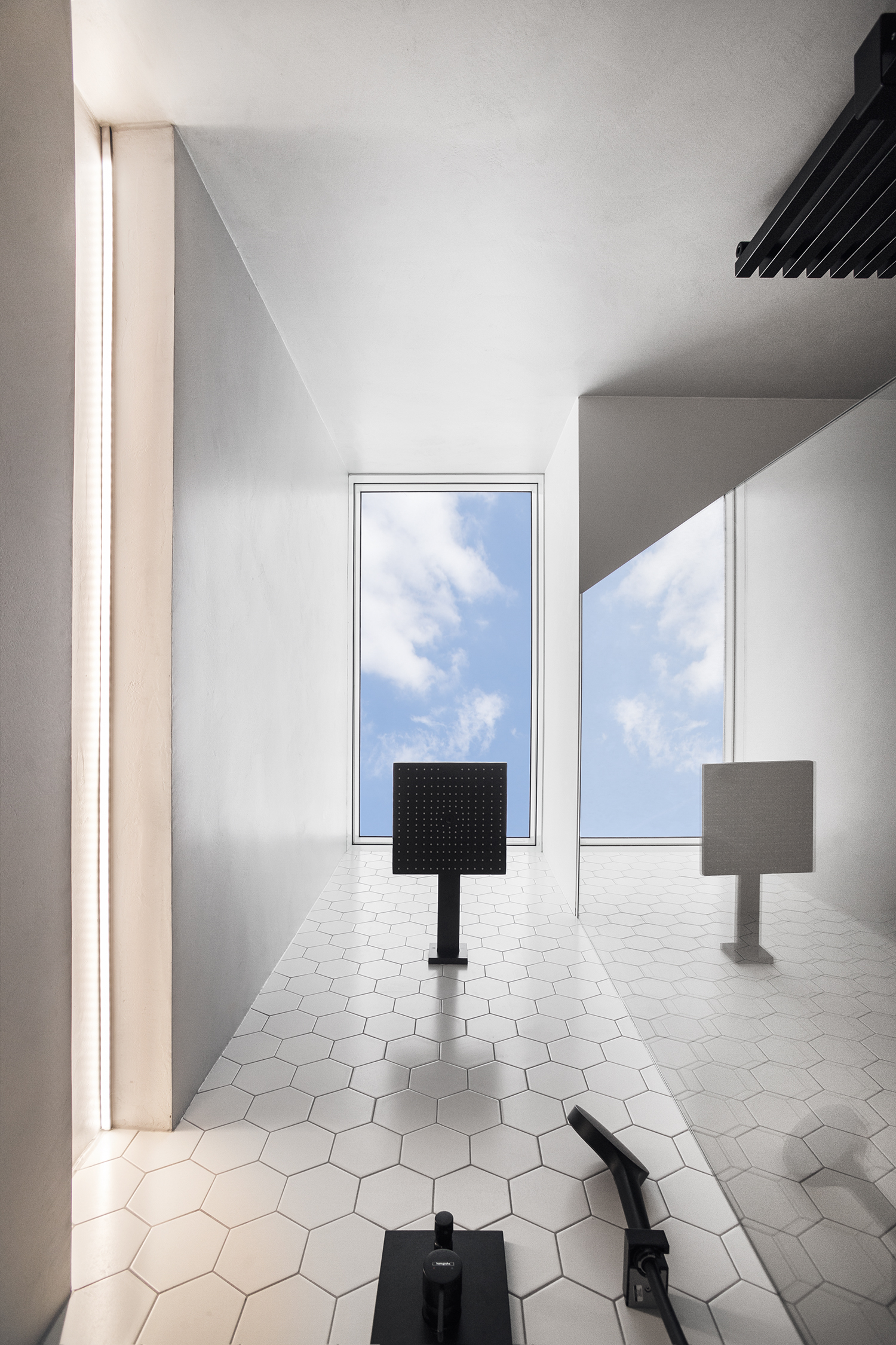 Spodnímu podlaží, zejména hlavnímu obytnému prostoru, dominuje přiznaný železobetonový strop s výraznou strukturou otisků bednění. V koupelnách jsme použili betonové hydrofobní stěrky na stěnách i podlahách, které doplňuje vždy jedna akcentní stěna s keramickým obkladem z hexagonů. Sanita i elektro prvky jsou řešeny v matné černé, která interiéru dodává finální kontrastní akcent.