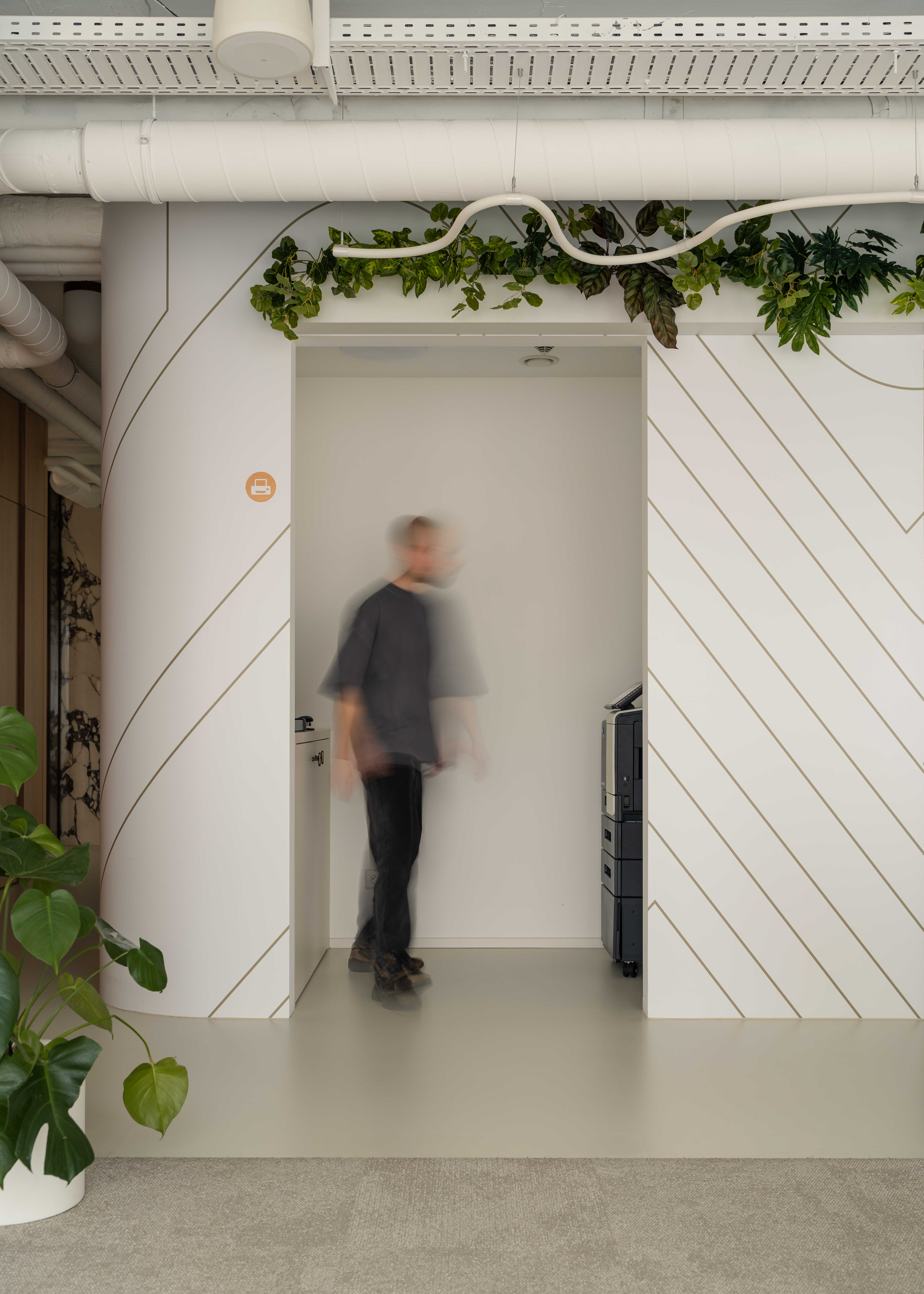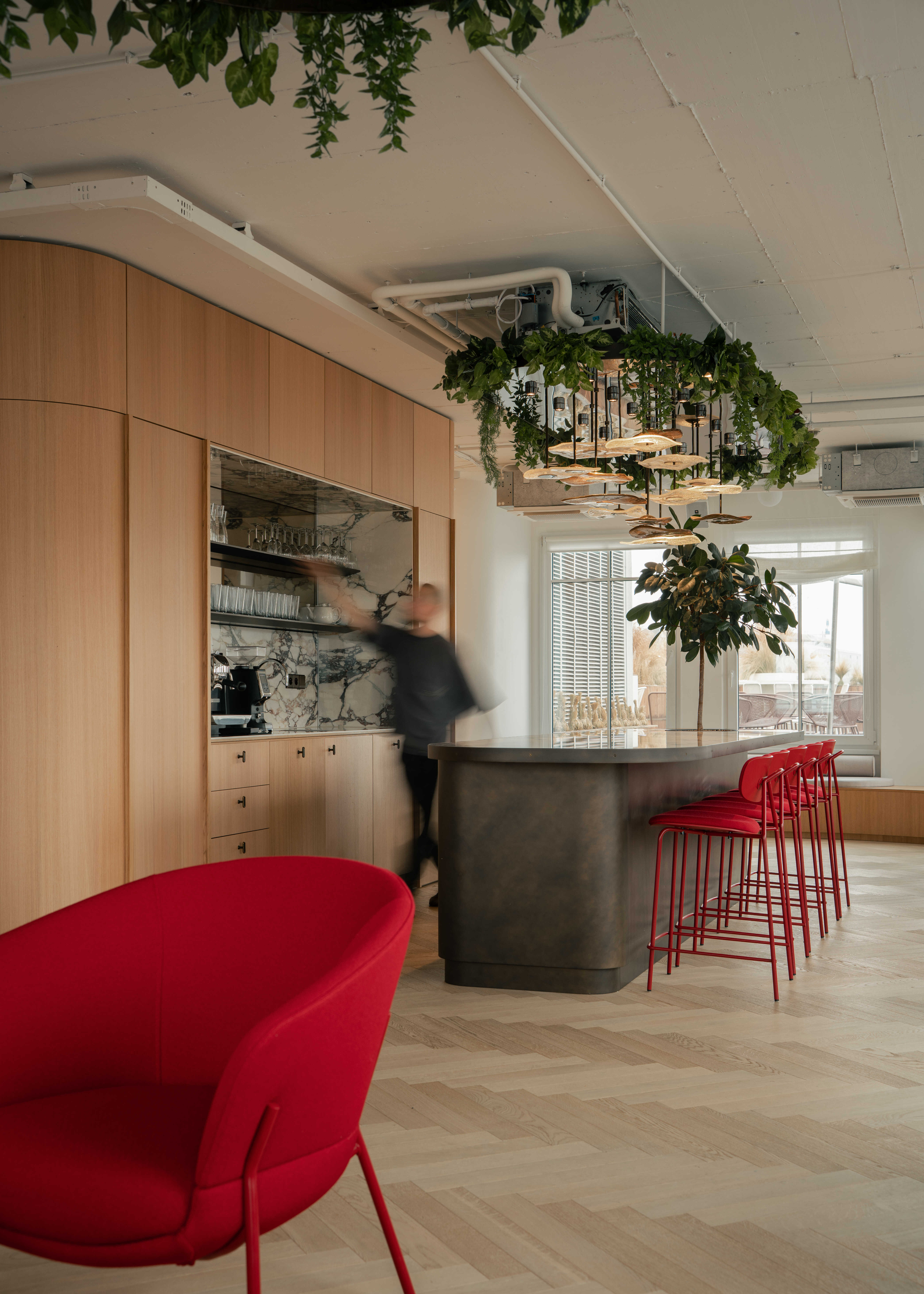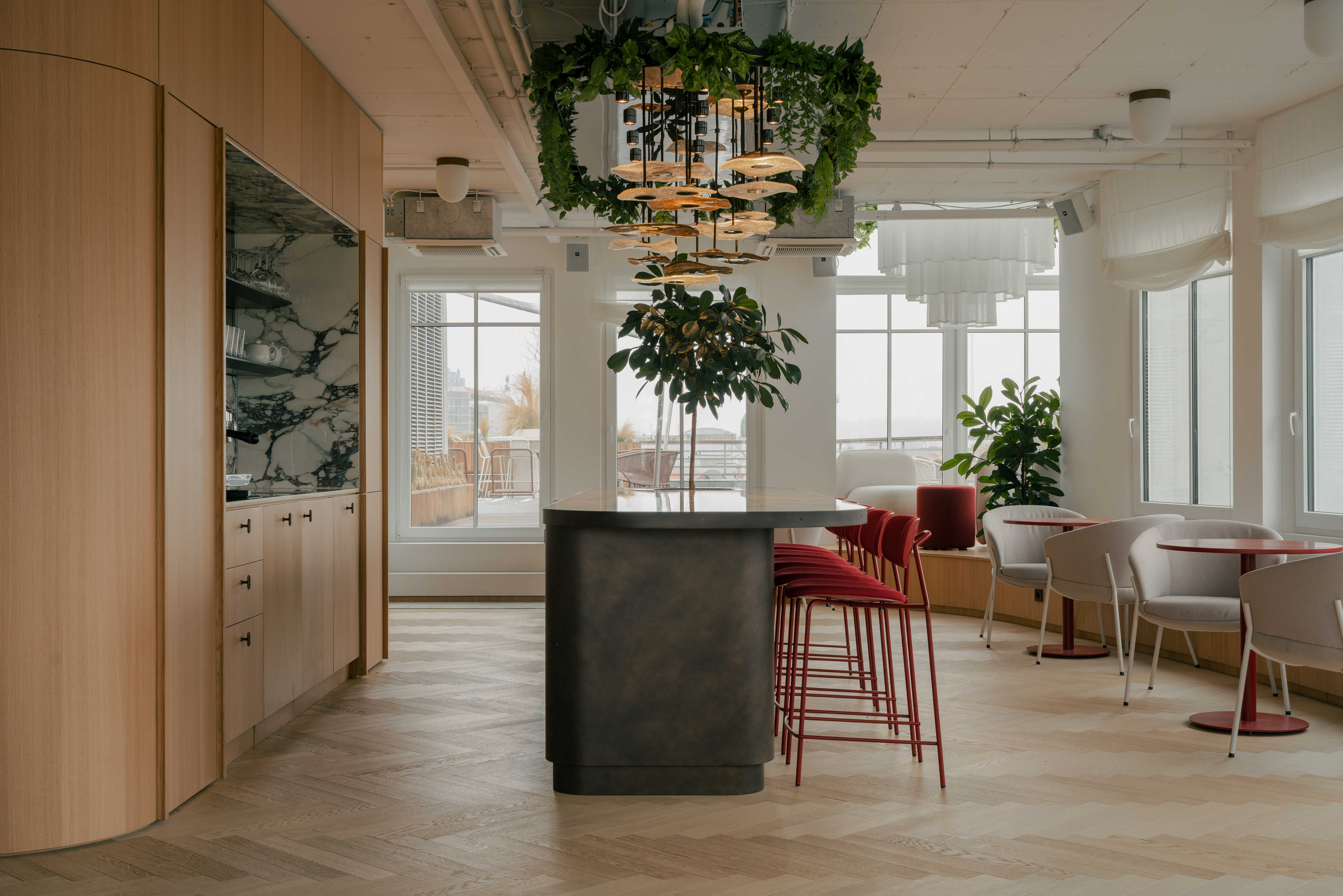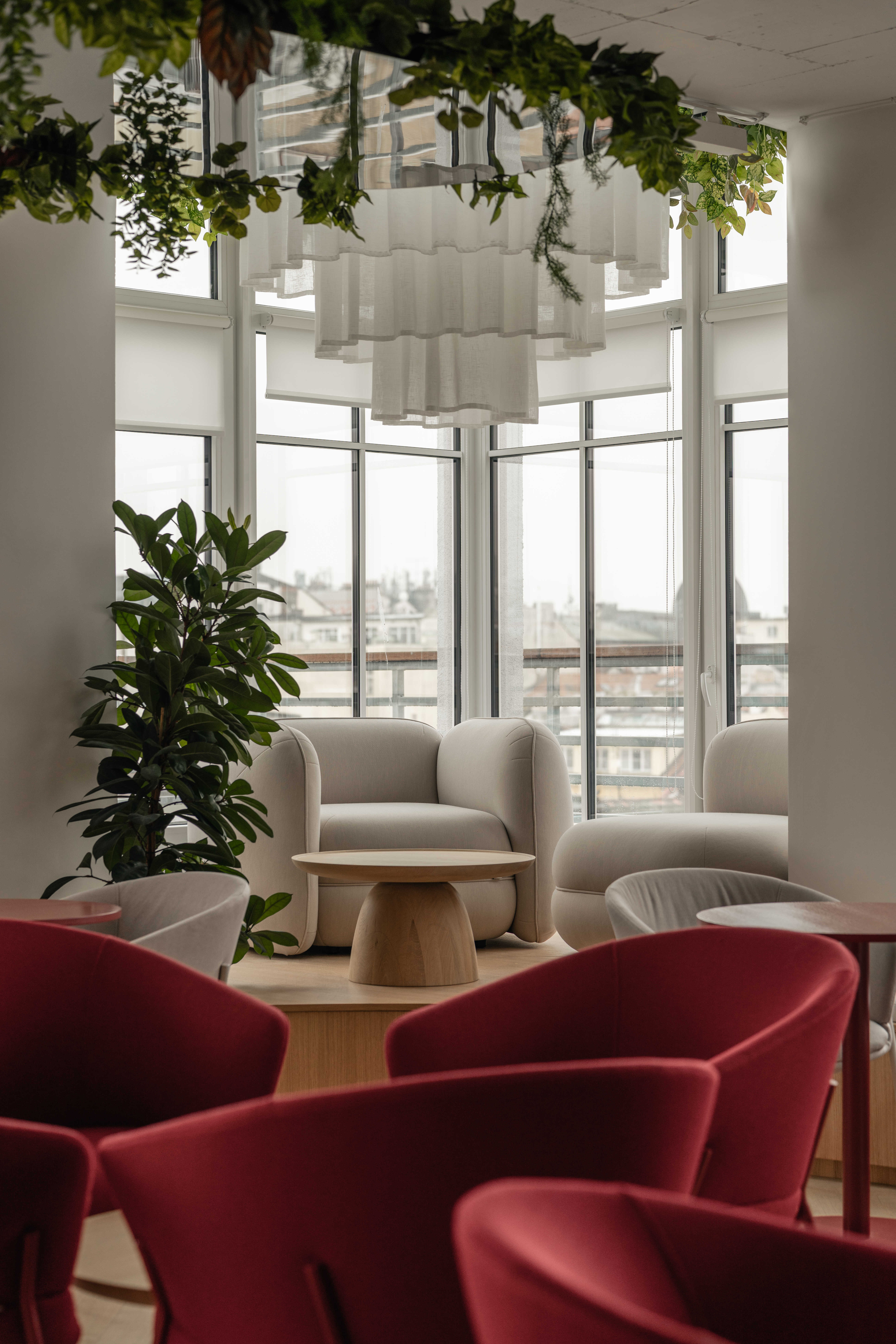 Jemná kombinace materiálů v krémových a světlých odstínech je doplněna o výrazné červené prvky a množství zeleně. Návrh je obohacen o grafické práce studia Upsala nebo například ručně malované tapety od Patrika Hábla. Na podlahy je zvoleno několik druhů krytin s ohledem na funkci prostoru. V kancelářích je navržen světle krémový koberec s nízkým chlupem, v komunikacích je navržena kaučuková podlaha a v reprezentačních prostorech dřevěná lepená podlaha skládaná do parketového vzoru. Vybavení interiéru je z velké části řešeno pomocí vestavěného truhlářského nábytku, který je převážně navržen z bělené dubové dýhy. Výrazným prvkem interiéru je staromosazný plech na recepčním pultu a dalších drobných detailech napříč celým prostorem. Základním principem návrhu interiéru je udržitelnost, která je v tomto případě naplněna výběrem lokálních dodavatelů, výrobců a designérů. Volný nábytek je od českých výrobců Ton, Polstrin, Master&Master a recepční pult je například zdoben bespoke osvětlením od sklářské firmy Lasvit. Stejně tak ostatní svítidla v interiéru jsou od českých výrobců převážně Lucis a Bomma.