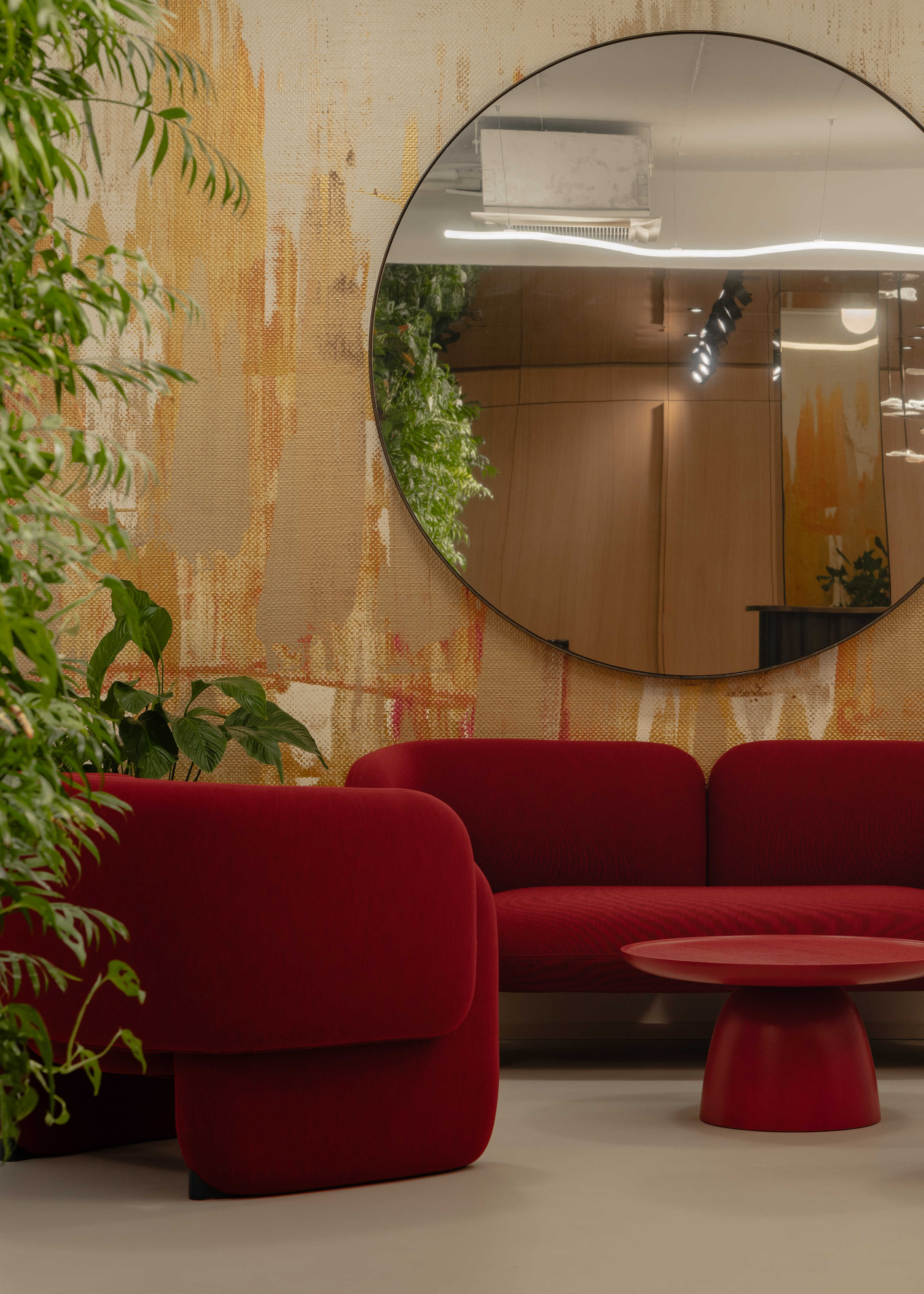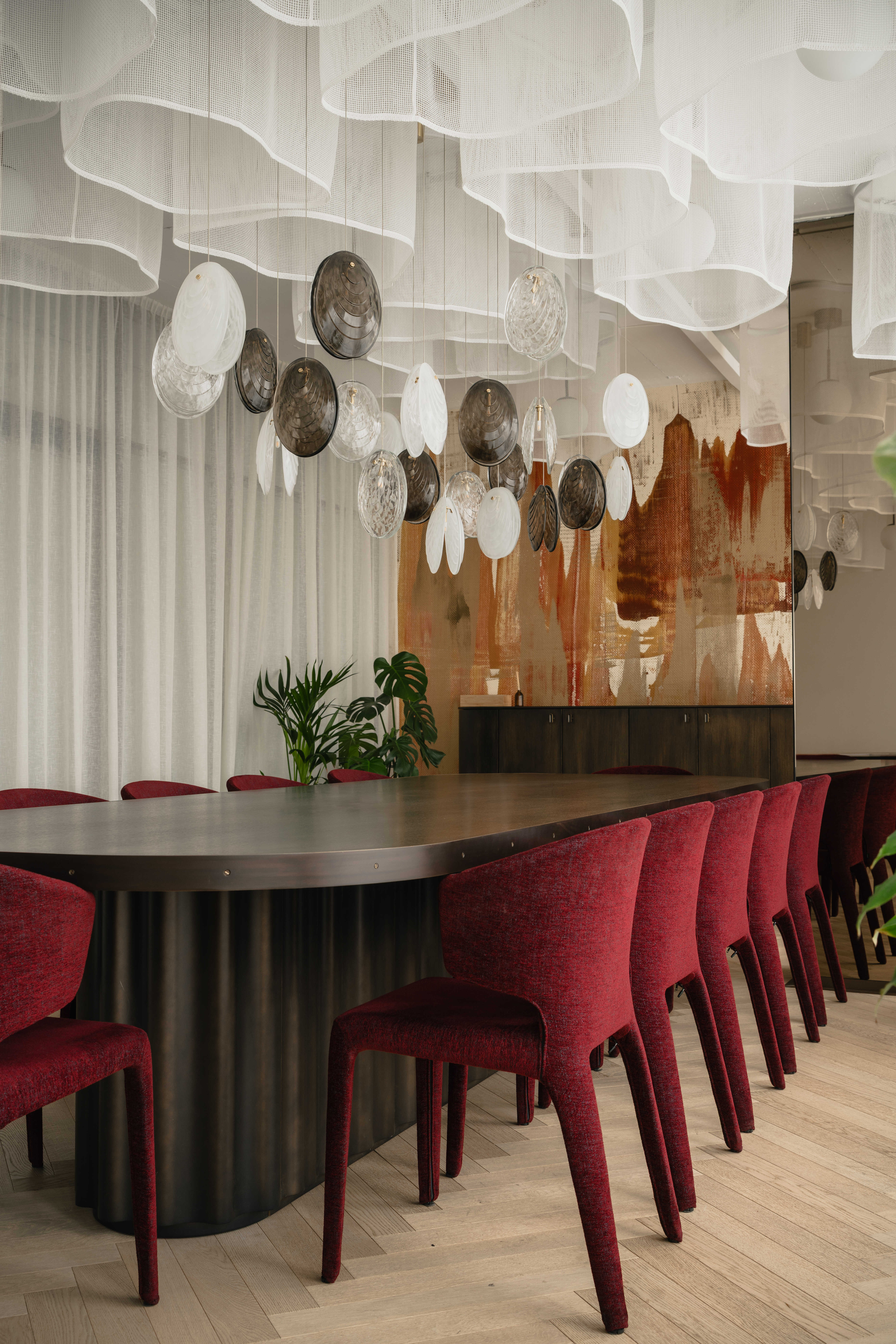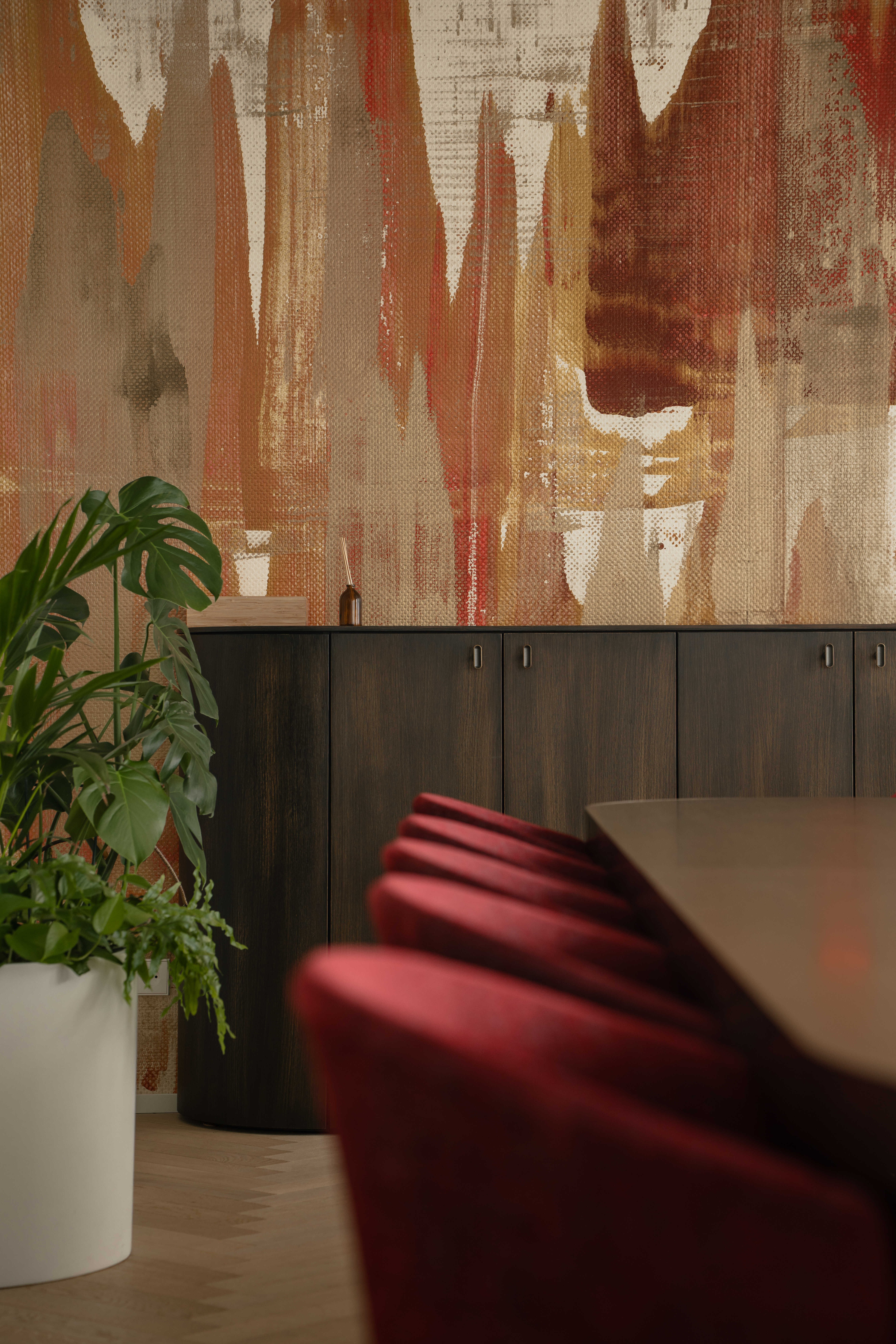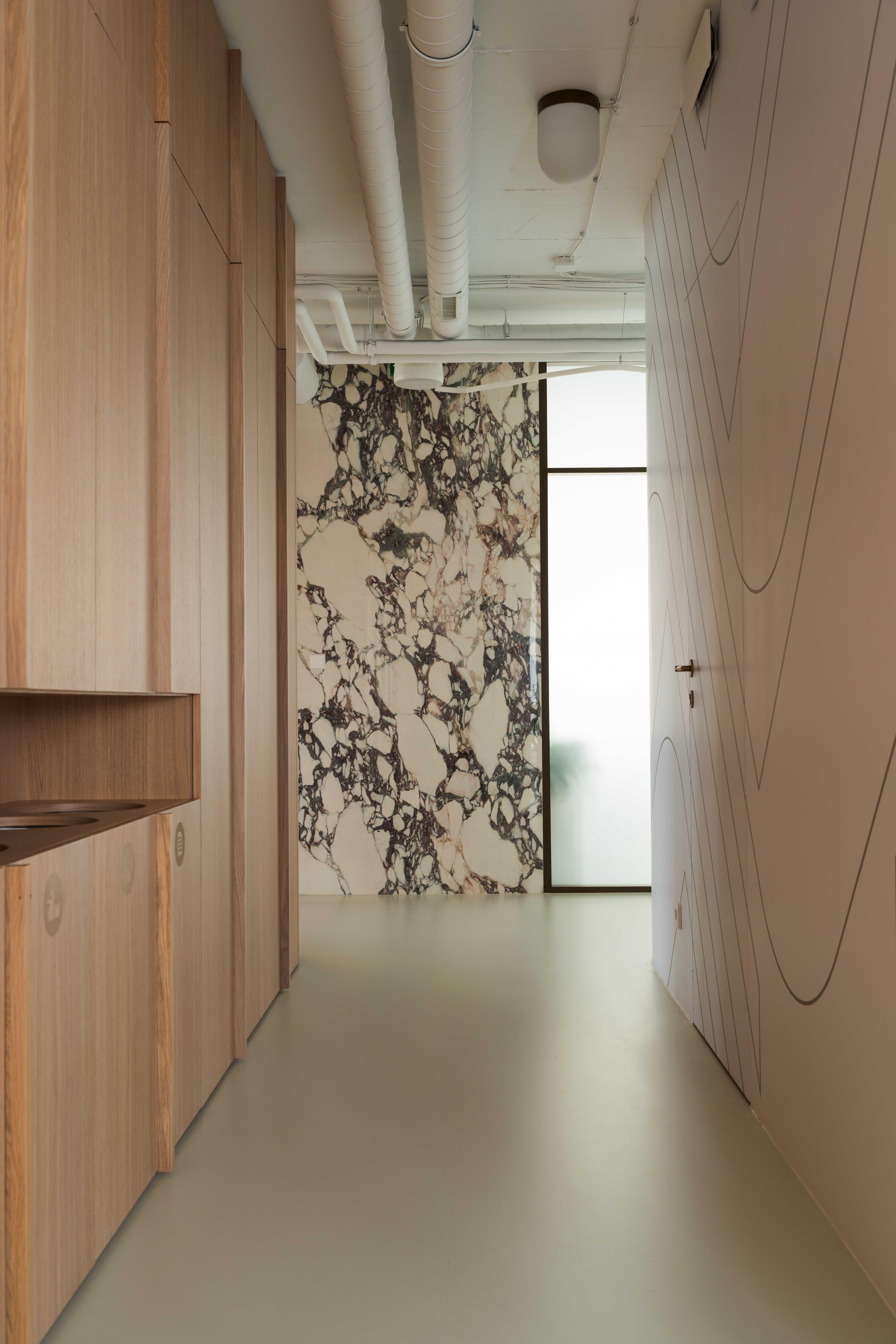 Jemná kombinace materiálů v krémových a světlých odstínech je doplněna o výrazné červené prvky a množství zeleně. Návrh je obohacen o grafické práce studia Upsala nebo například ručně malované tapety od Patrika Hábla. Na podlahy je zvoleno několik druhů krytin s ohledem na funkci prostoru. V kancelářích je navržen světle krémový koberec s nízkým chlupem, v komunikacích je navržena kaučuková podlaha a v reprezentačních prostorech dřevěná lepená podlaha skládaná do parketového vzoru. Vybavení interiéru je z velké části řešeno pomocí vestavěného truhlářského nábytku, který je převážně navržen z bělené dubové dýhy. Výrazným prvkem interiéru je staromosazný plech na recepčním pultu a dalších drobných detailech napříč celým prostorem. Základním principem návrhu interiéru je udržitelnost, která je v tomto případě naplněna výběrem lokálních dodavatelů, výrobců a designérů. Volný nábytek je od českých výrobců Ton, Polstrin, Master&Master a recepční pult je například zdoben bespoke osvětlením od sklářské firmy Lasvit. Stejně tak ostatní svítidla v interiéru jsou od českých výrobců převážně Lucis a Bomma.