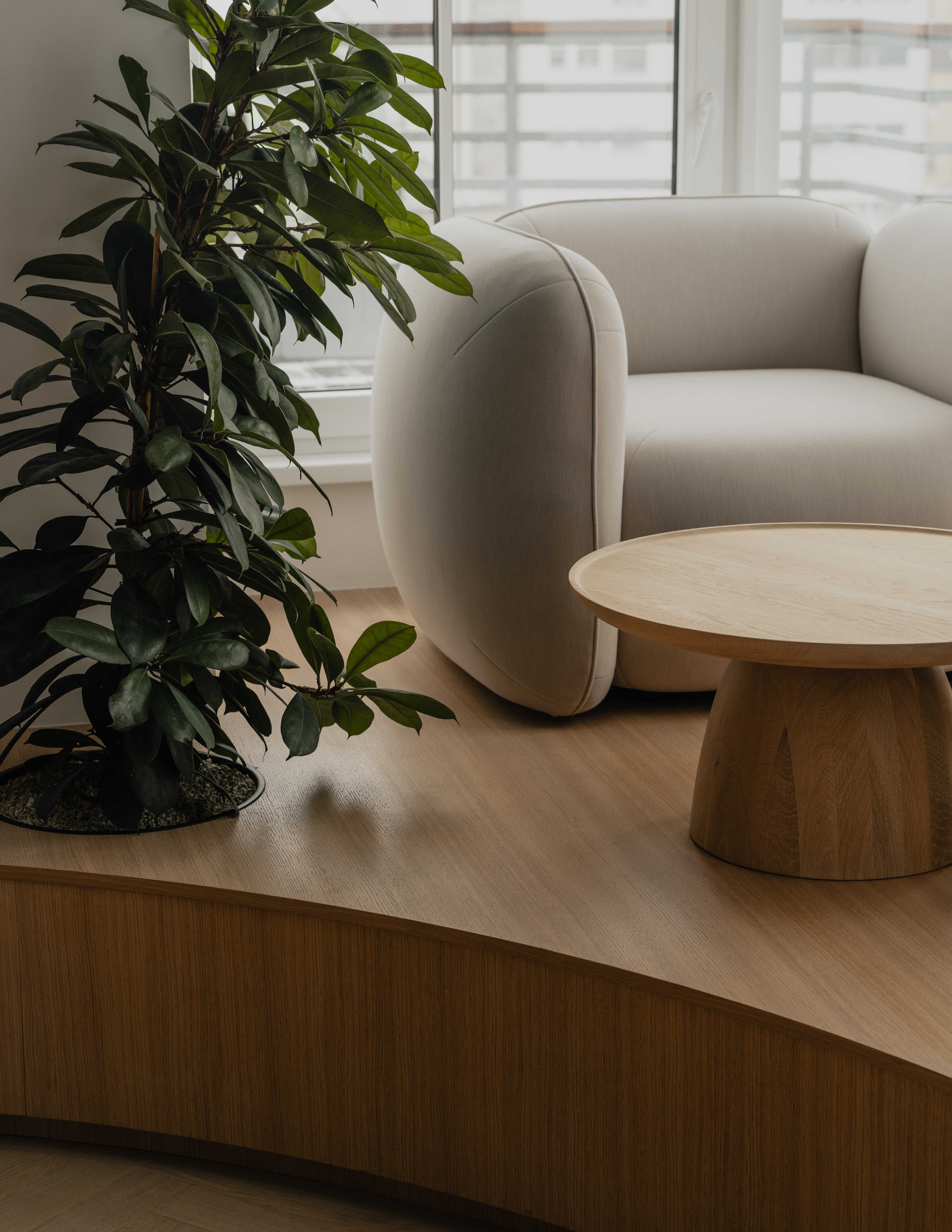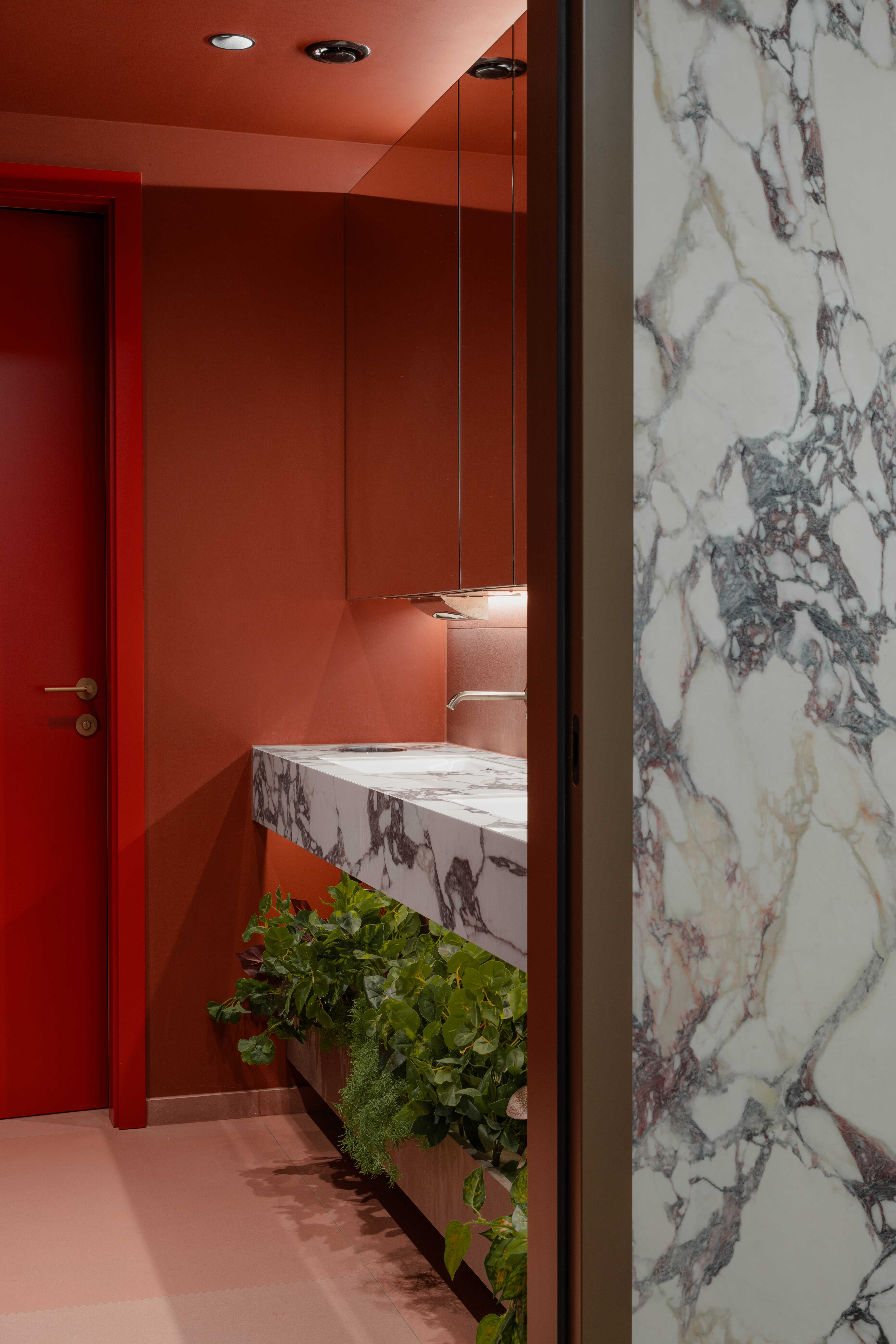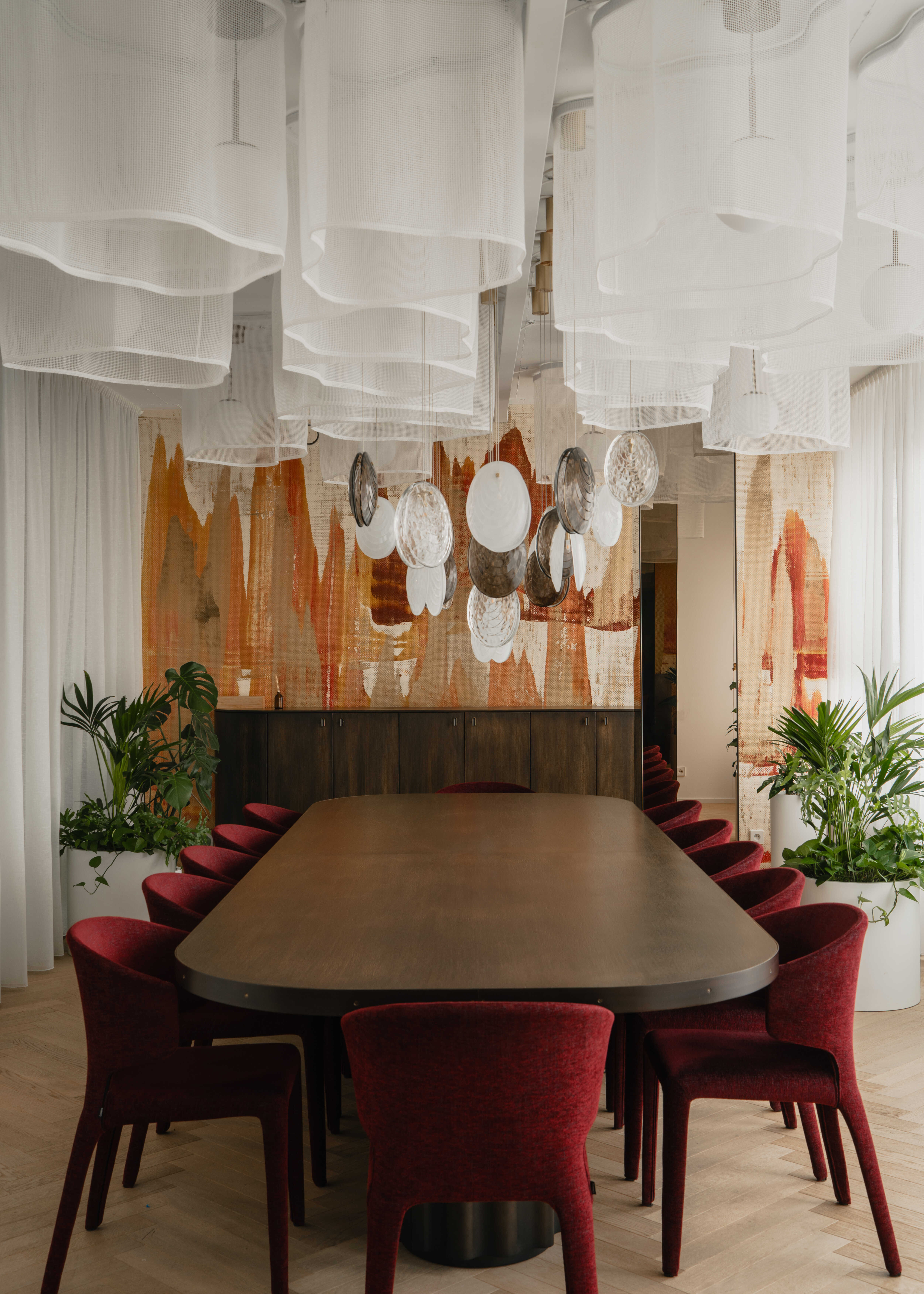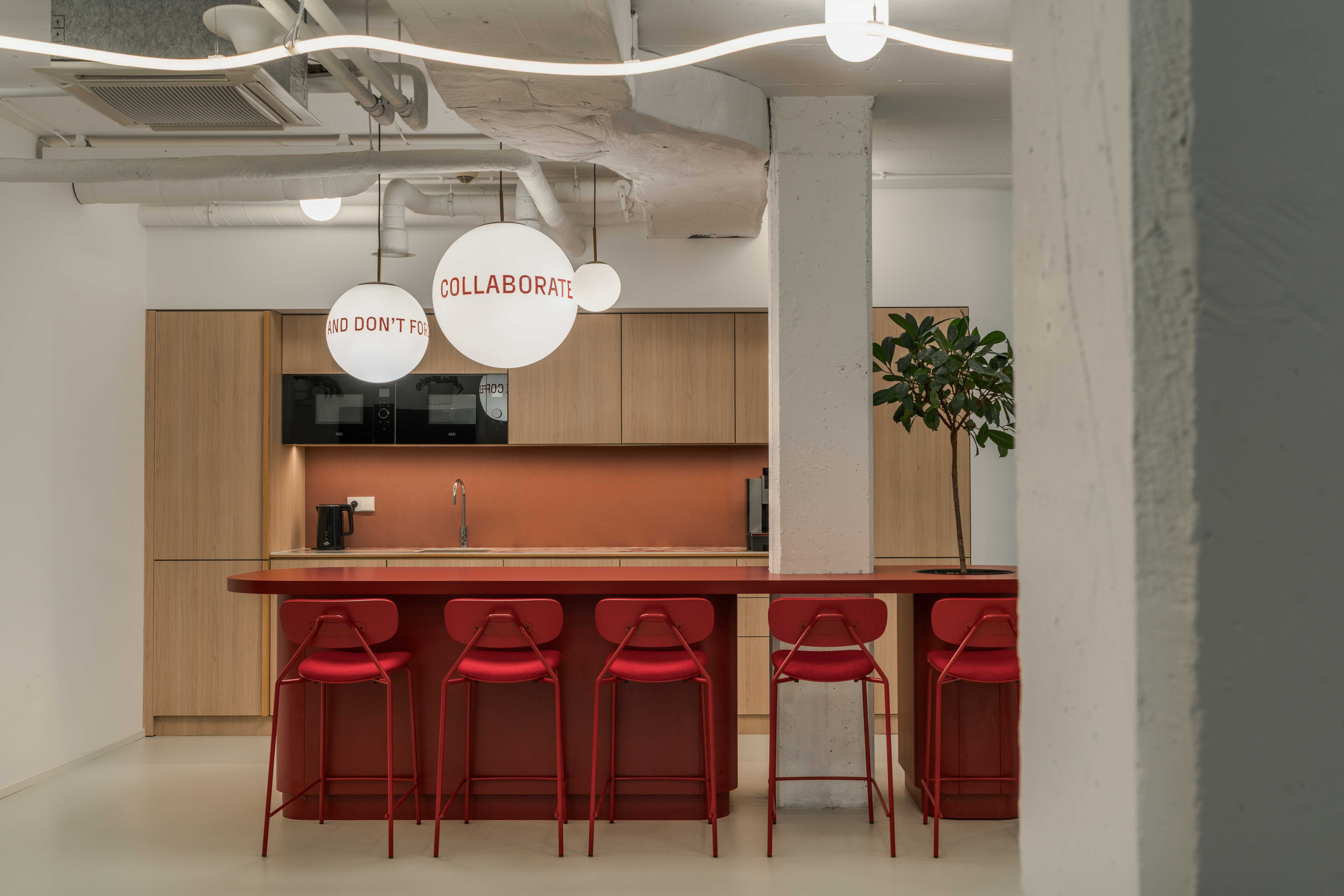 Jemná kombinace materiálů v krémových a světlých odstínech je doplněna o výrazné červené prvky a množství zeleně. Návrh je obohacen o grafické práce studia Upsala nebo například ručně malované tapety od Patrika Hábla. Na podlahy je zvoleno několik druhů krytin s ohledem na funkci prostoru. V kancelářích je navržen světle krémový koberec s nízkým chlupem, v komunikacích je navržena kaučuková podlaha a v reprezentačních prostorech dřevěná lepená podlaha skládaná do parketového vzoru. Vybavení interiéru je z velké části řešeno pomocí vestavěného truhlářského nábytku, který je převážně navržen z bělené dubové dýhy. Výrazným prvkem interiéru je staromosazný plech na recepčním pultu a dalších drobných detailech napříč celým prostorem. Základním principem návrhu interiéru je udržitelnost, která je v tomto případě naplněna výběrem lokálních dodavatelů, výrobců a designérů. Volný nábytek je od českých výrobců Ton, Polstrin, Master&Master a recepční pult je například zdoben bespoke osvětlením od sklářské firmy Lasvit. Stejně tak ostatní svítidla v interiéru jsou od českých výrobců převážně Lucis a Bomma.