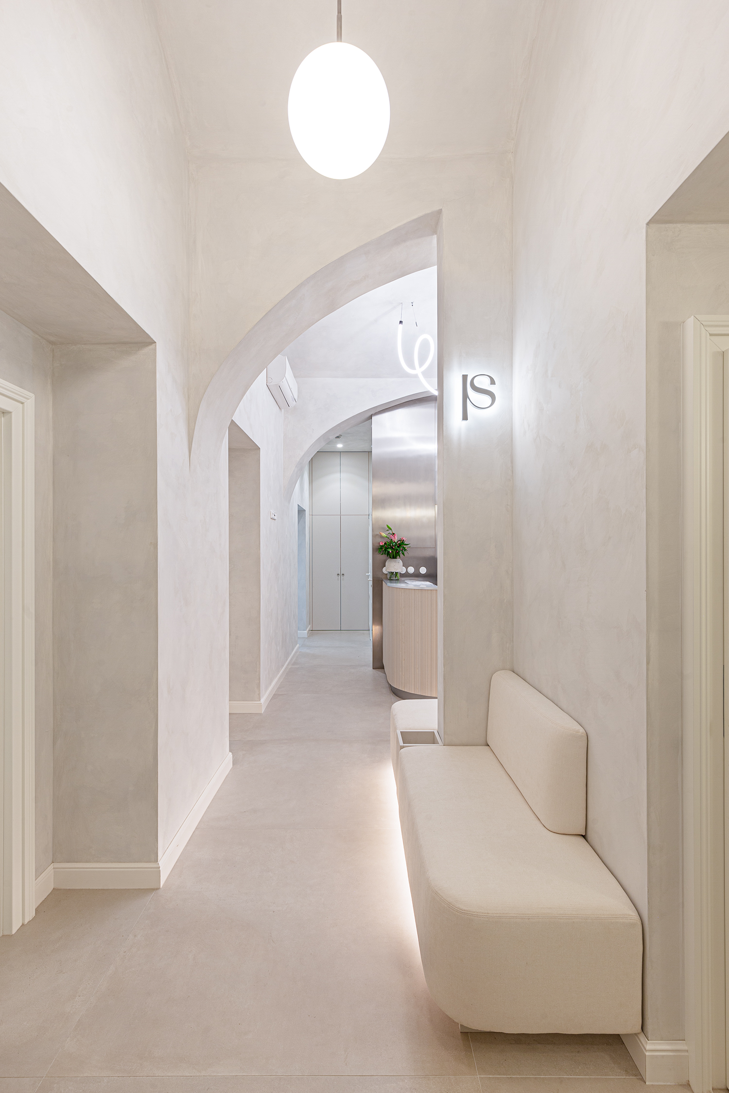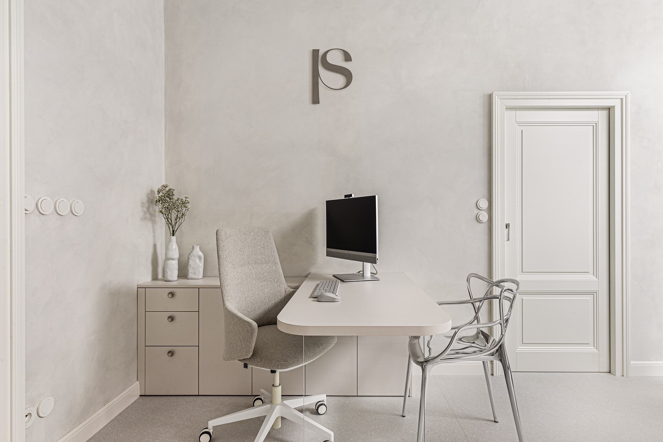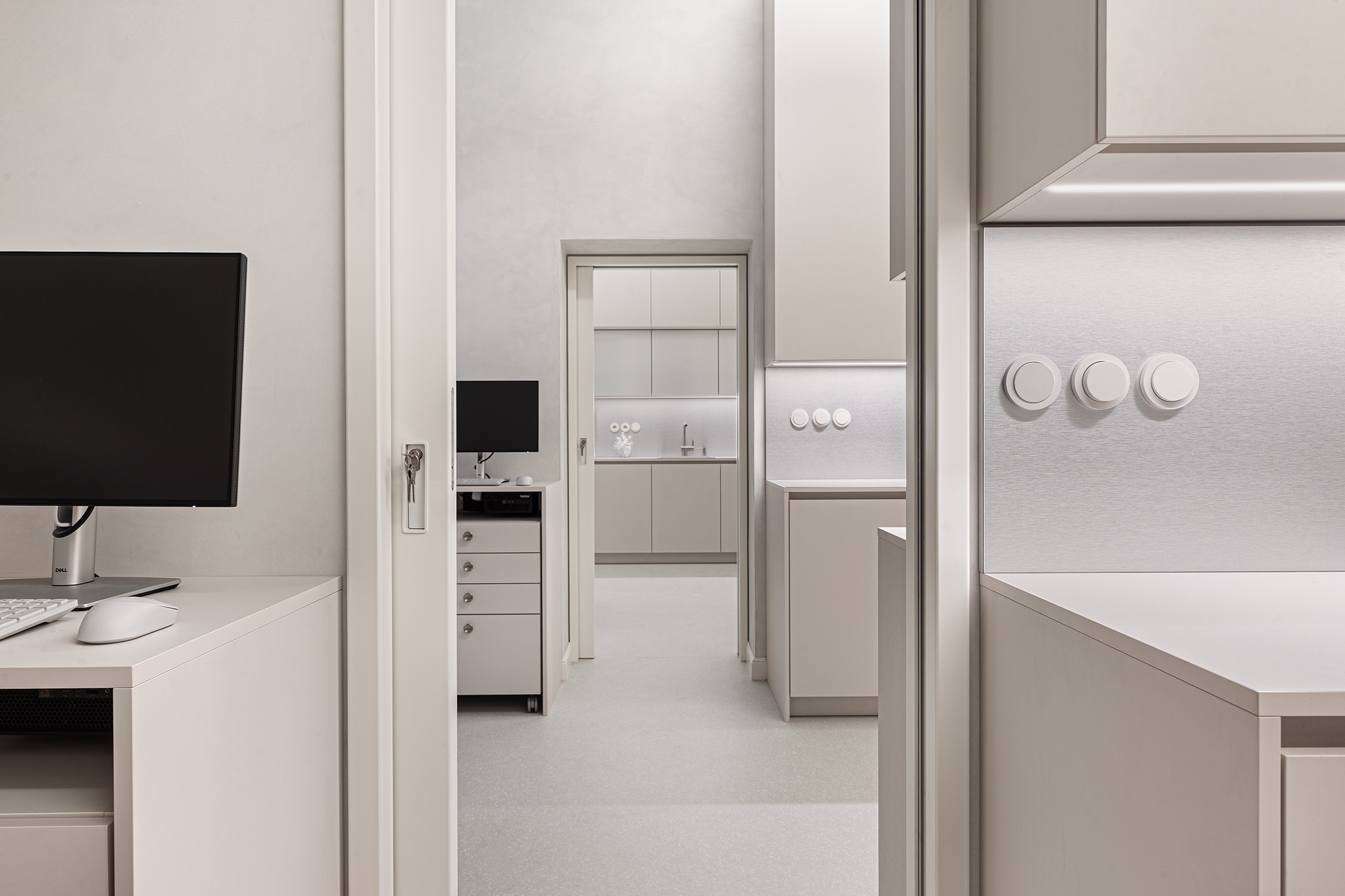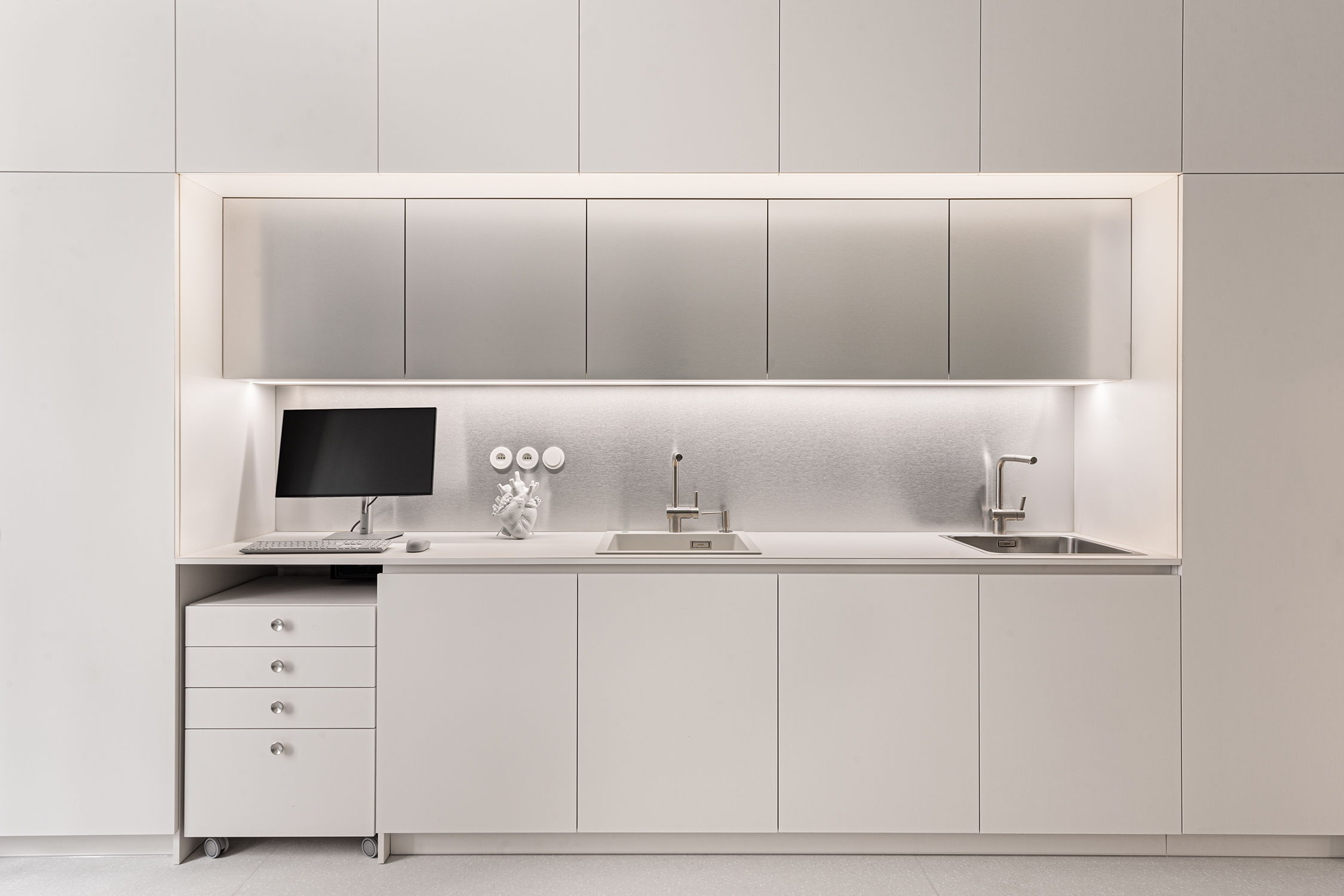 Ve všech prostorech jsou navrženy truhlářské prvky tvořící kompaktní celky, které skrývají dostatek úložného prostoru a splňují požadavky na provoz ordinace. Při návrhu bylo myšleno na designovou čistotu a jednoduchost, proto je většina vybavení vestavná na míru dle našich návrhů. Pomocí světlých a odrazivých materiálů jsme chtěli místu dodat vzdušnost a díky vhodnému osvětlení místo zesvětlit.