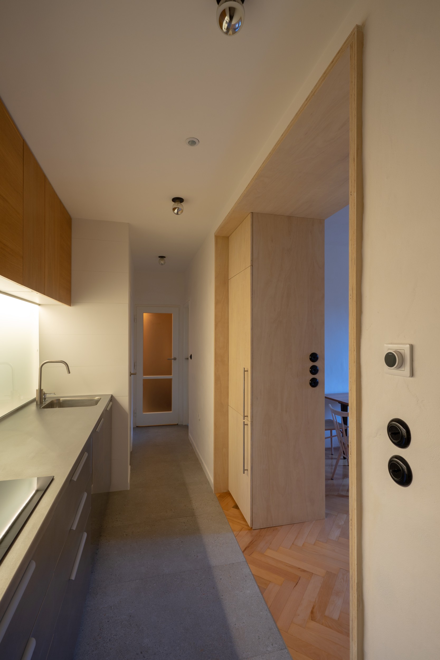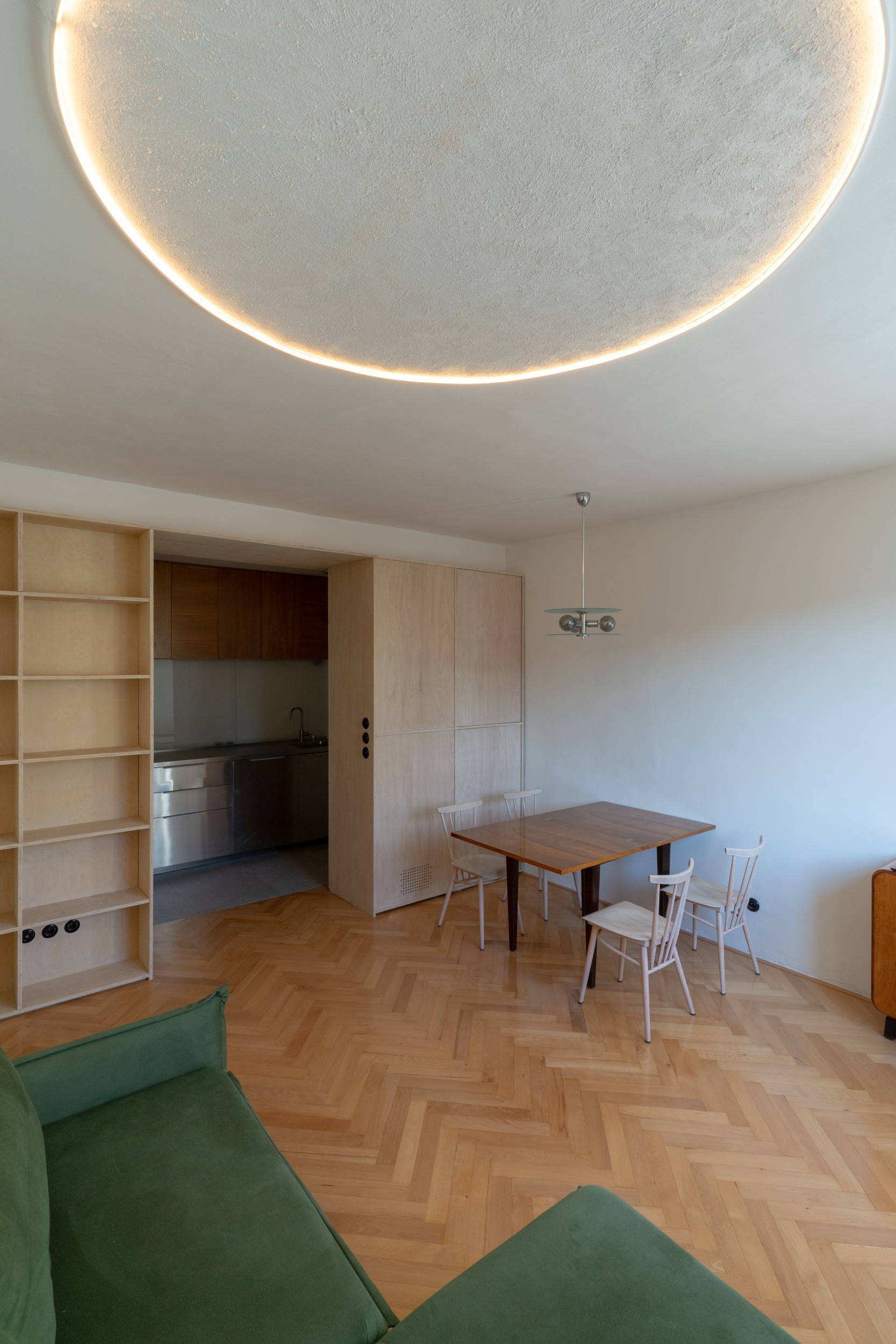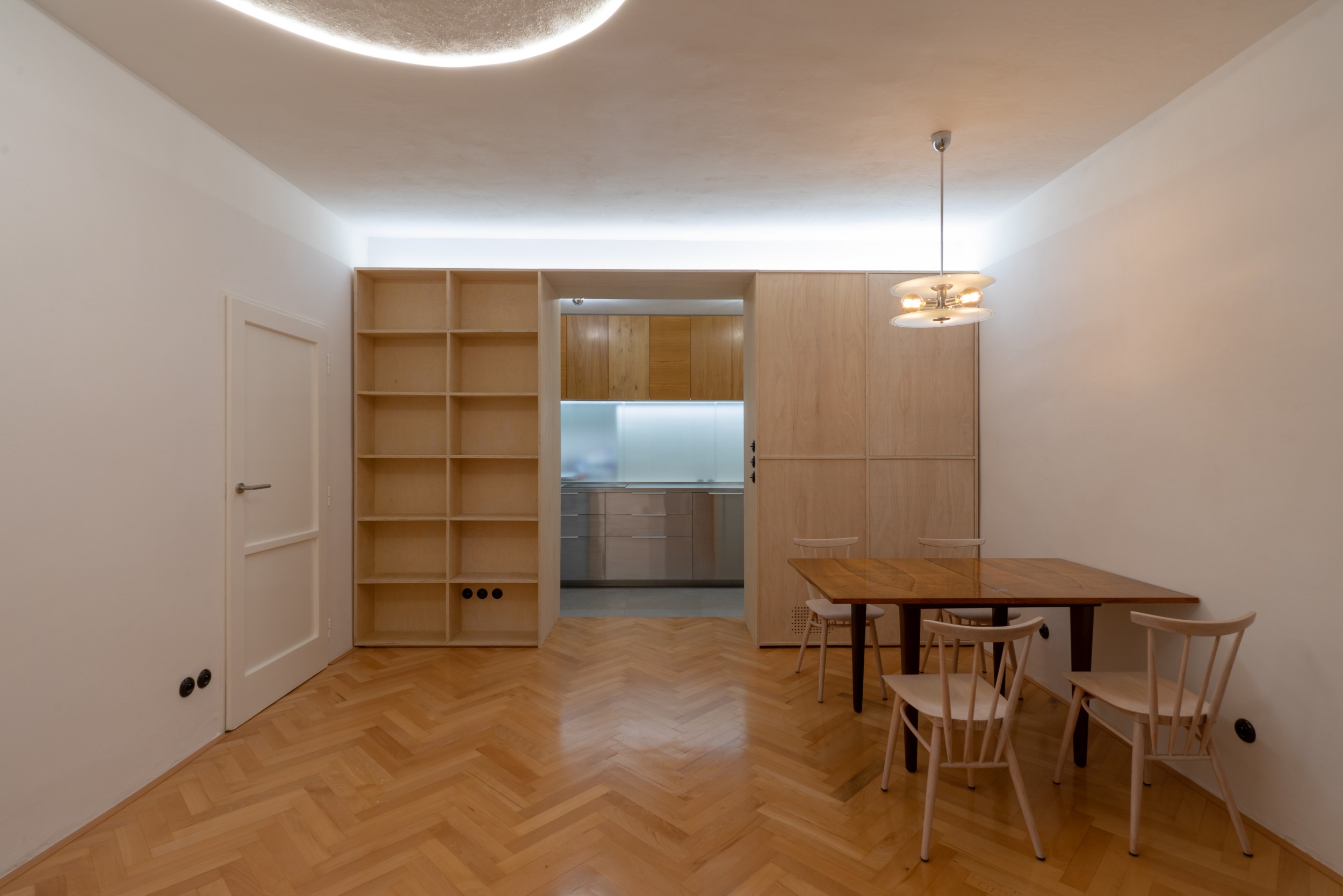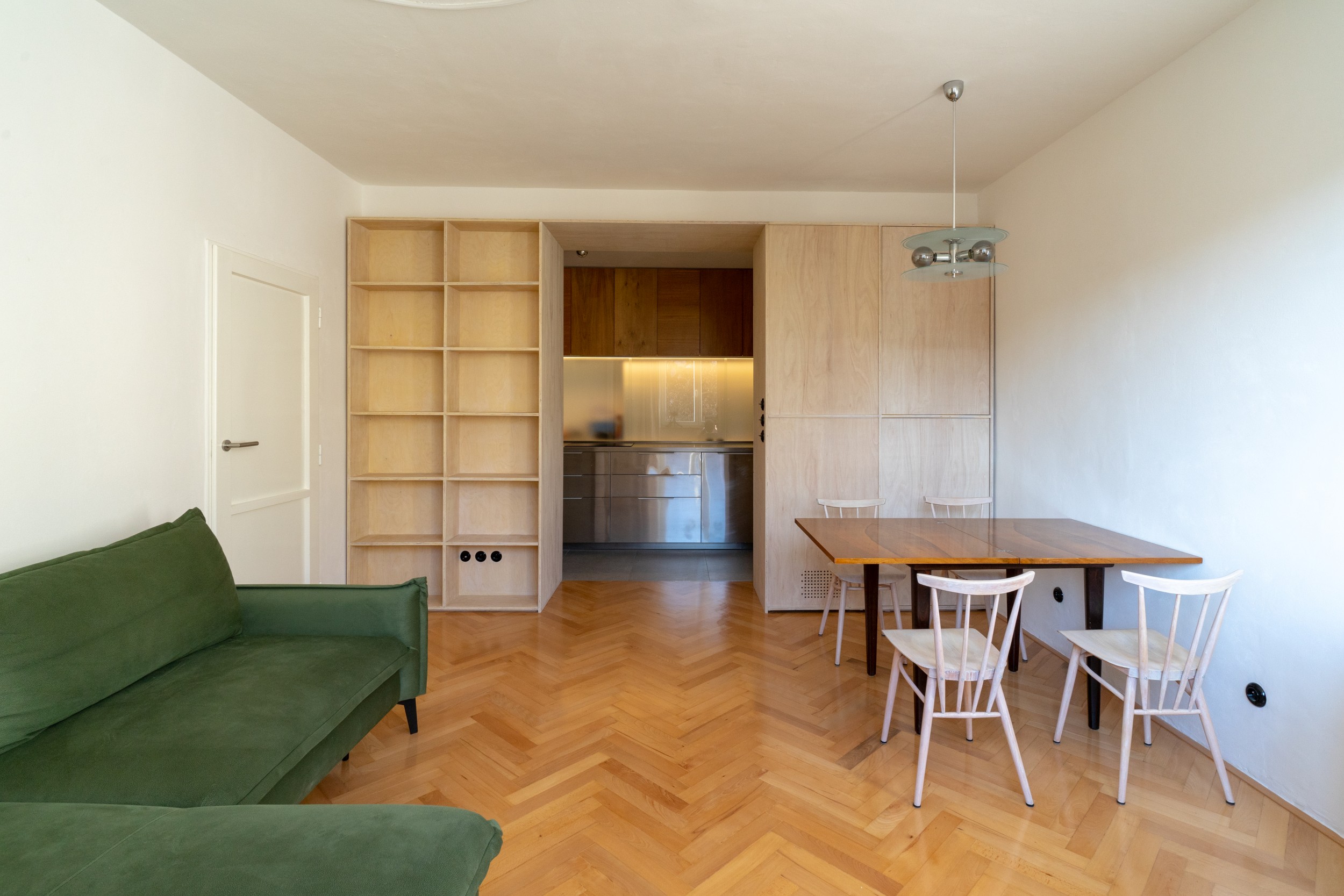 Byt v činžovním domě prošel po 70 letech od výstavby poprvé generální rekonstrukcí. Původní nepraktická dispozice s 10 dveřmi na 58 m² byla upravena z 2+1 na současnější 3+kk. Moderní byt s nádechem retro rozostřuje hranici mezi novým a starým. Řada prvků z původního bytu byla renovována (dveře, nábytek, dřevěné podlahy) a využita v nové podobě (původní dýhované skříně pro dvířka nového nábytku). Elektroinstalace, radiátory a obklady koupelny i toalety jsou nové, inspirované původními prvky. Zvláštní péče byla věnována osvětlení s důrazem na variabilitu, příjemnou útulnou atmosféru a praktičnost.