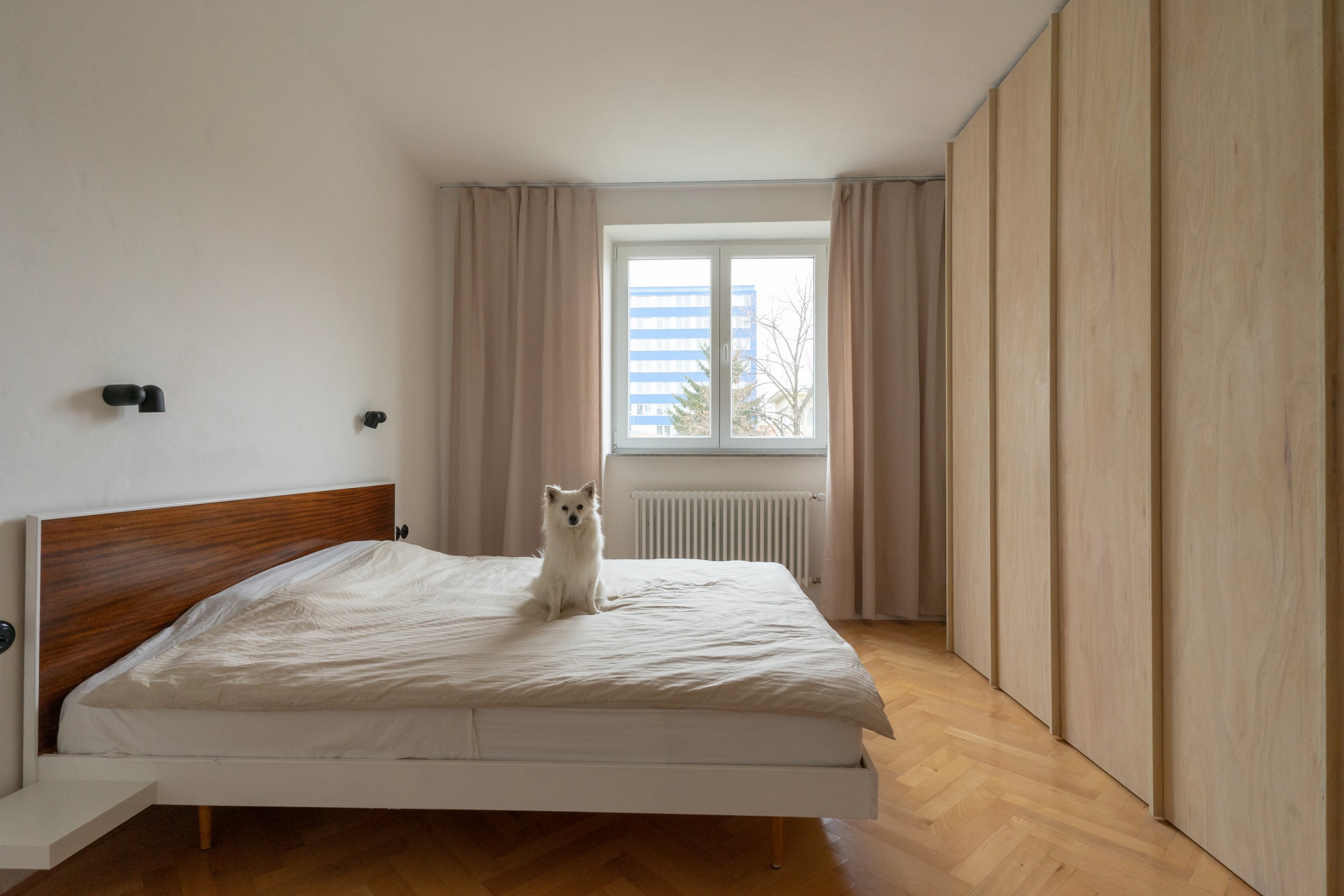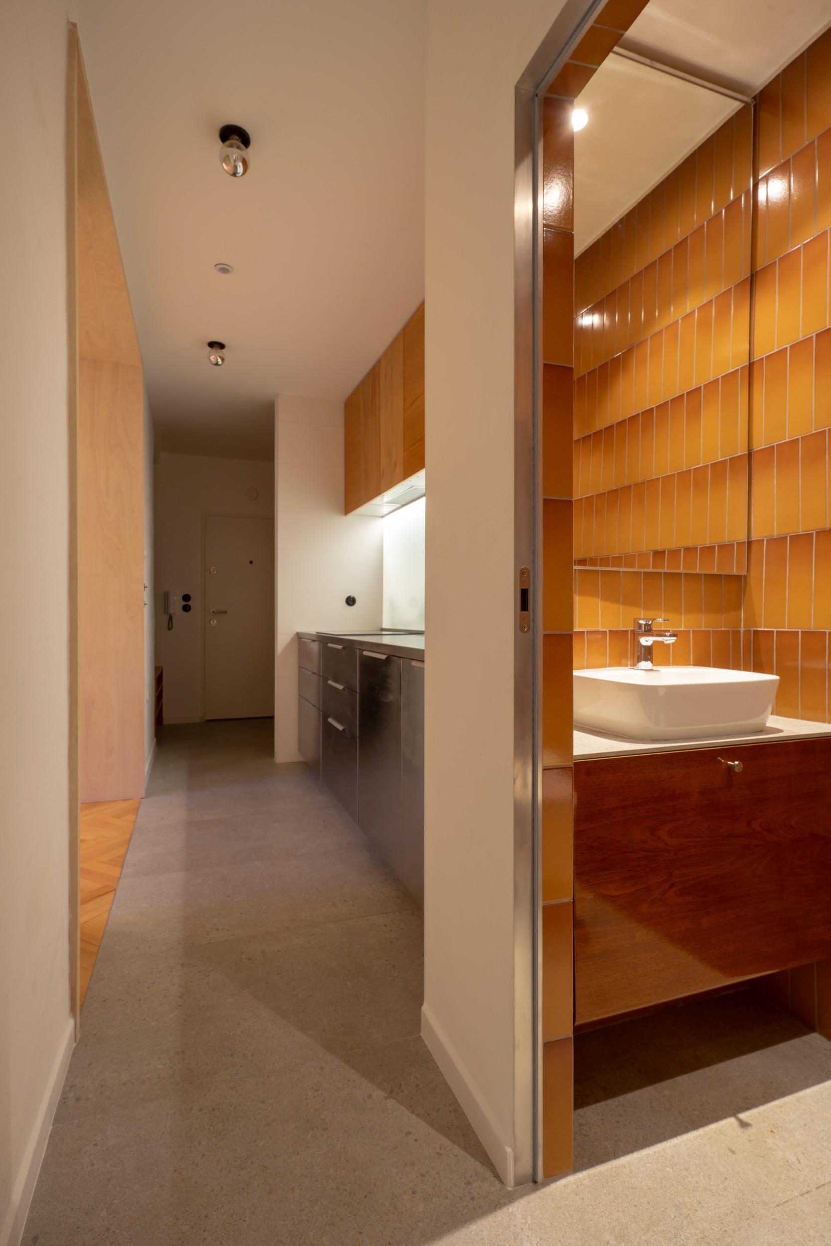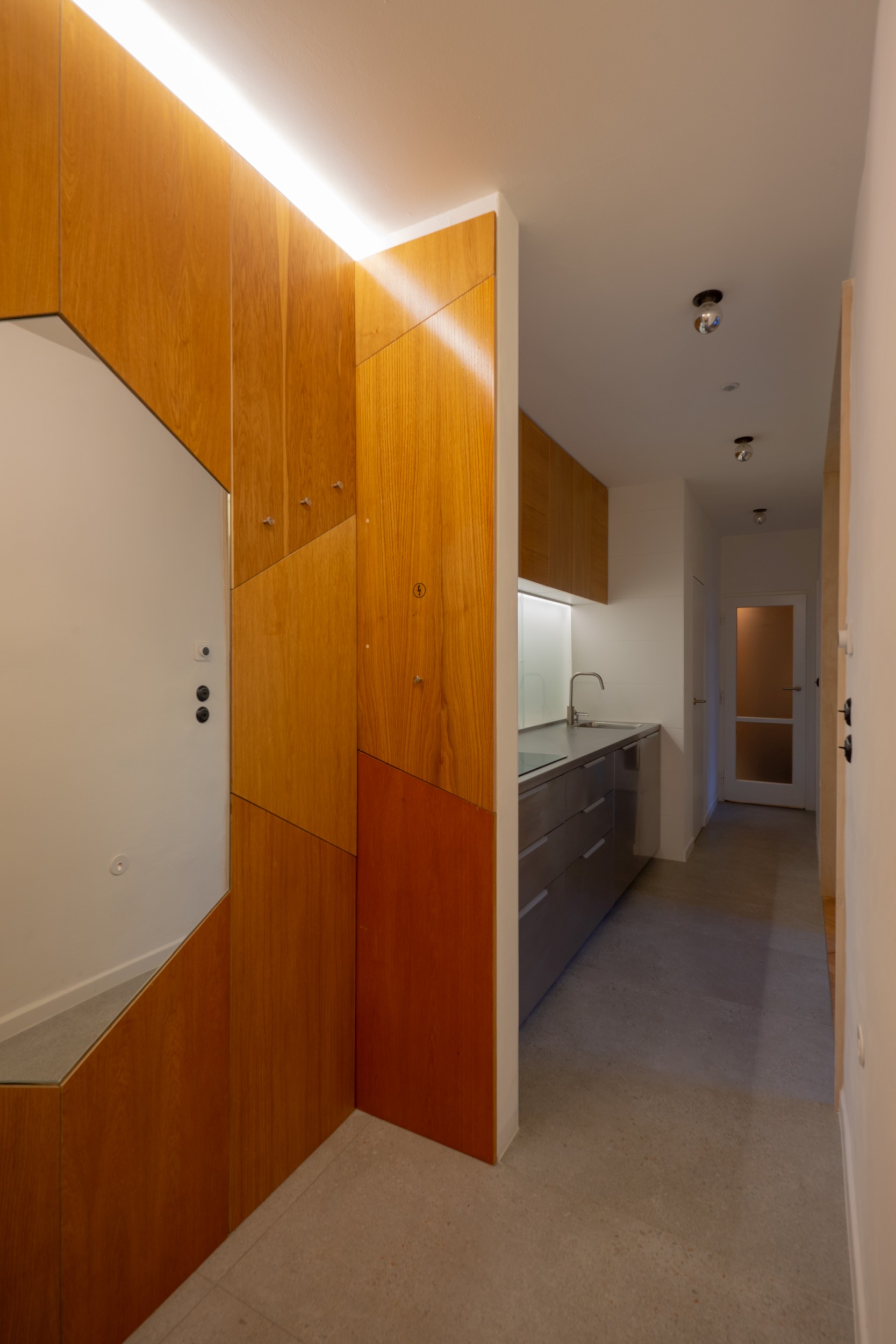 Byt v činžovním domě prošel po 70 letech od výstavby poprvé generální rekonstrukcí. Původní nepraktická dispozice s 10 dveřmi na 58 m² byla upravena z 2+1 na současnější 3+kk. Moderní byt s nádechem retro rozostřuje hranici mezi novým a starým. Řada prvků z původního bytu byla renovována (dveře, nábytek, dřevěné podlahy) a využita v nové podobě (původní dýhované skříně pro dvířka nového nábytku). Elektroinstalace, radiátory a obklady koupelny i toalety jsou nové, inspirované původními prvky. Zvláštní péče byla věnována osvětlení s důrazem na variabilitu, příjemnou útulnou atmosféru a praktičnost.