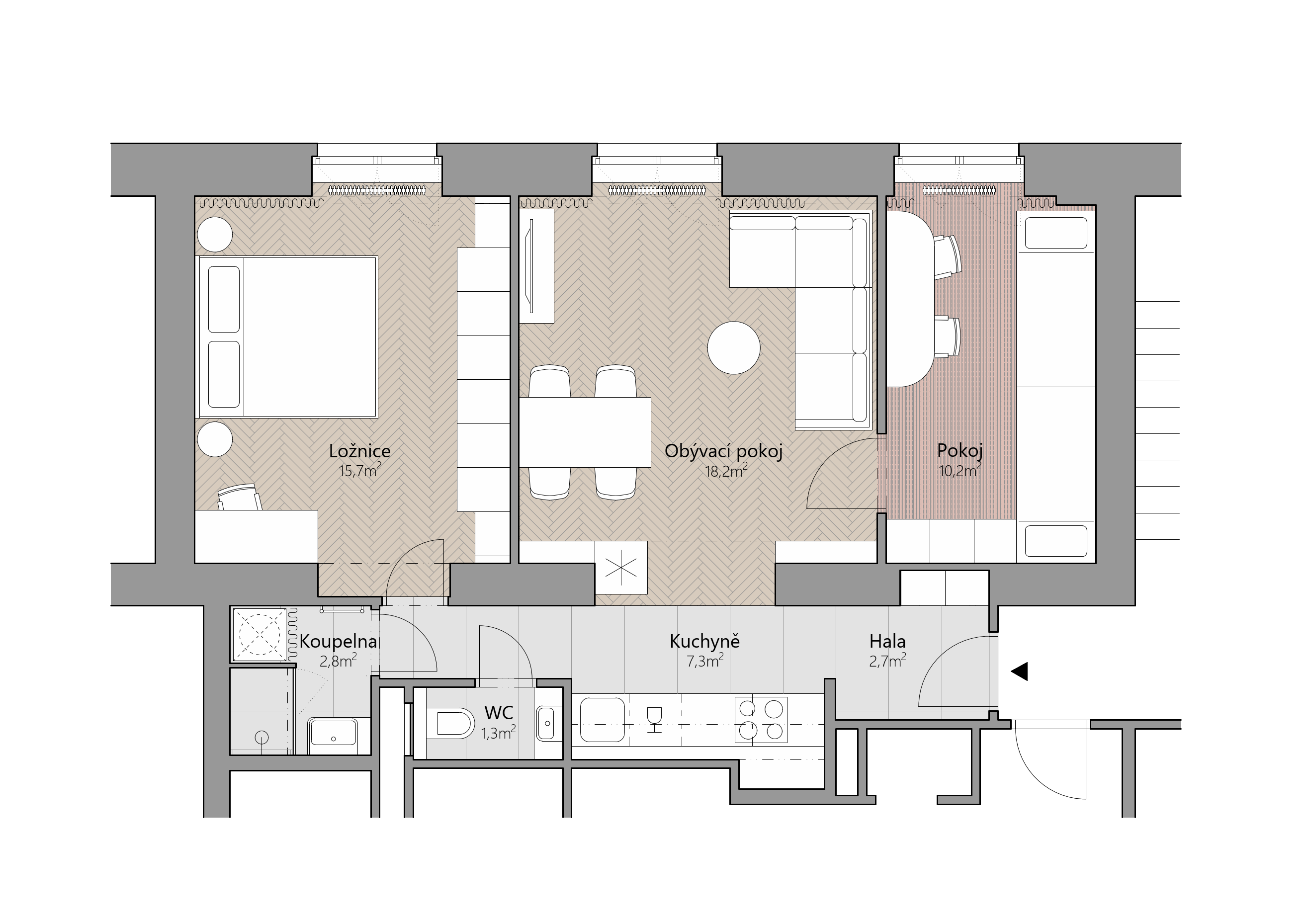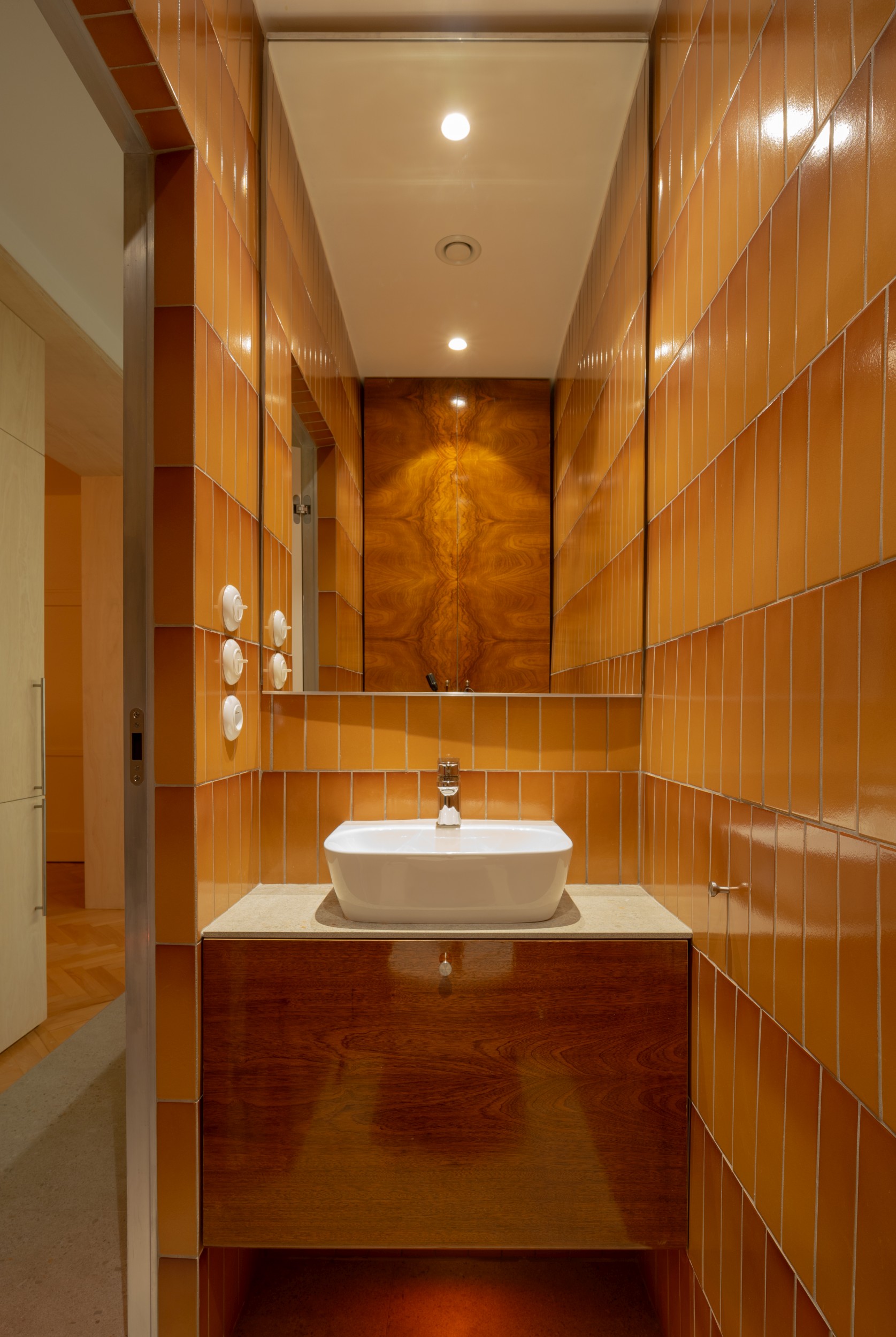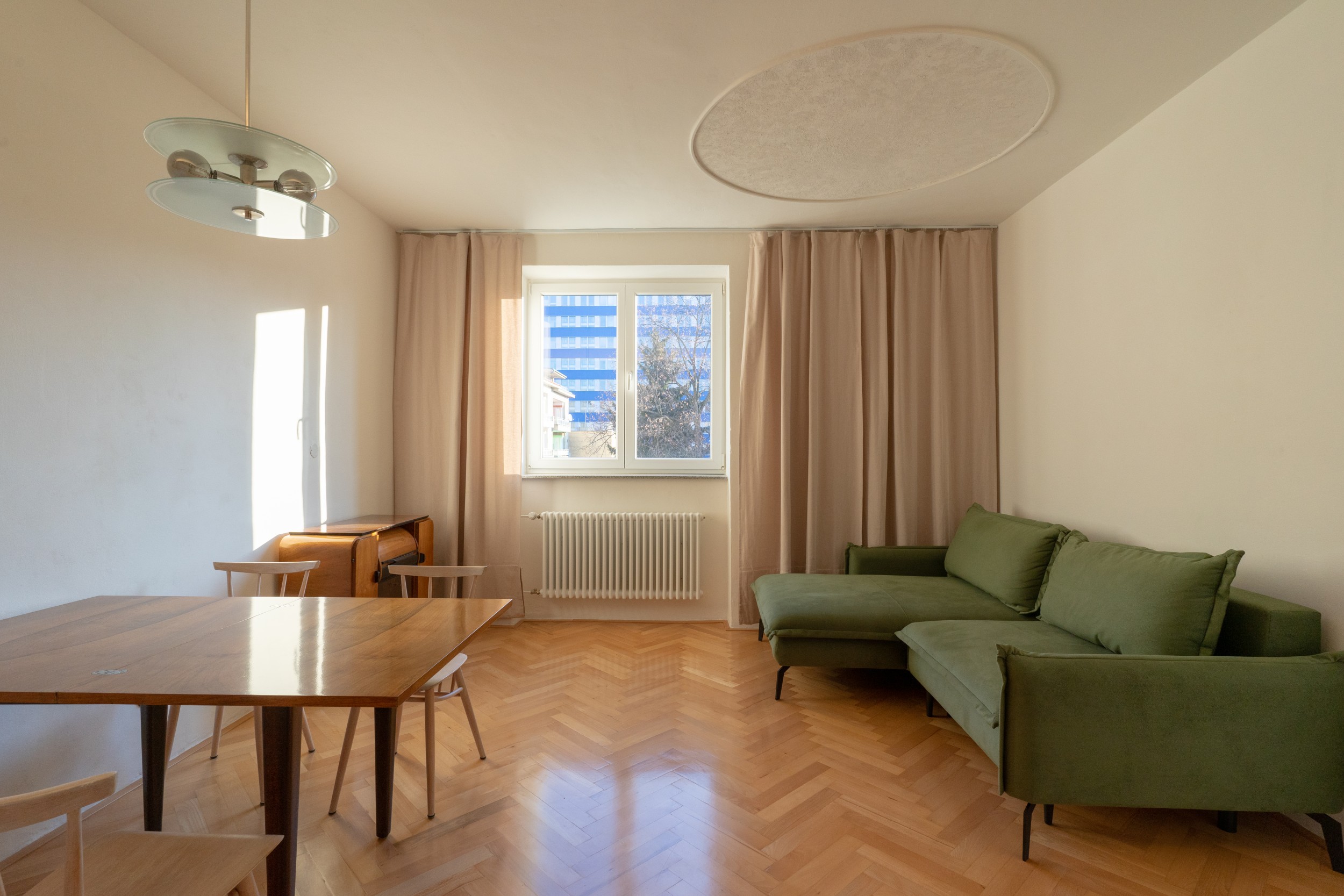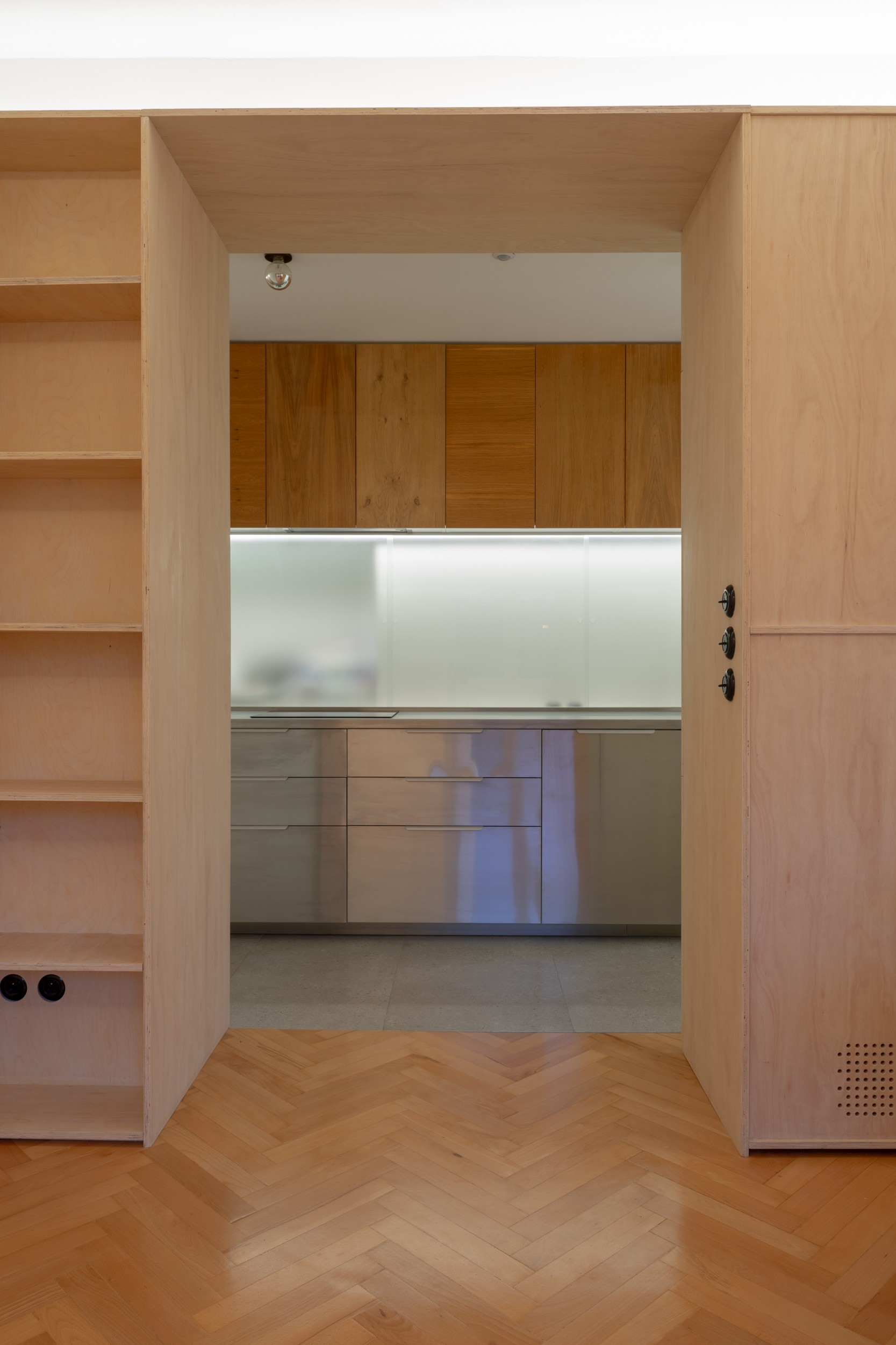 Byt v činžovním domě prošel po 70 letech od výstavby poprvé generální rekonstrukcí. Původní nepraktická dispozice s 10 dveřmi na 58 m² byla upravena z 2+1 na současnější 3+kk. Moderní byt s nádechem retro rozostřuje hranici mezi novým a starým. Řada prvků z původního bytu byla renovována (dveře, nábytek, dřevěné podlahy) a využita v nové podobě (původní dýhované skříně pro dvířka nového nábytku). Elektroinstalace, radiátory a obklady koupelny i toalety jsou nové, inspirované původními prvky. Zvláštní péče byla věnována osvětlení s důrazem na variabilitu, příjemnou útulnou atmosféru a praktičnost.