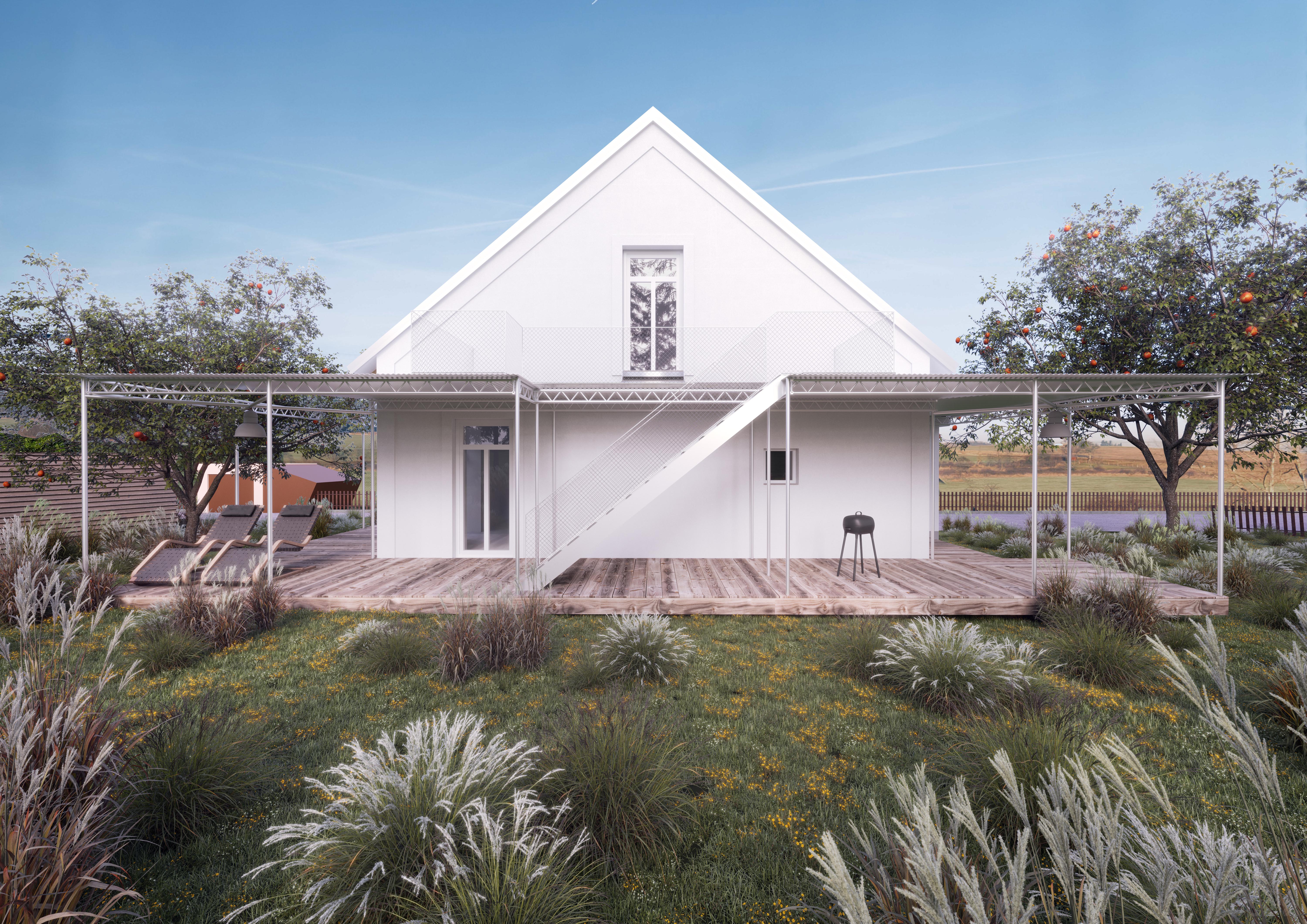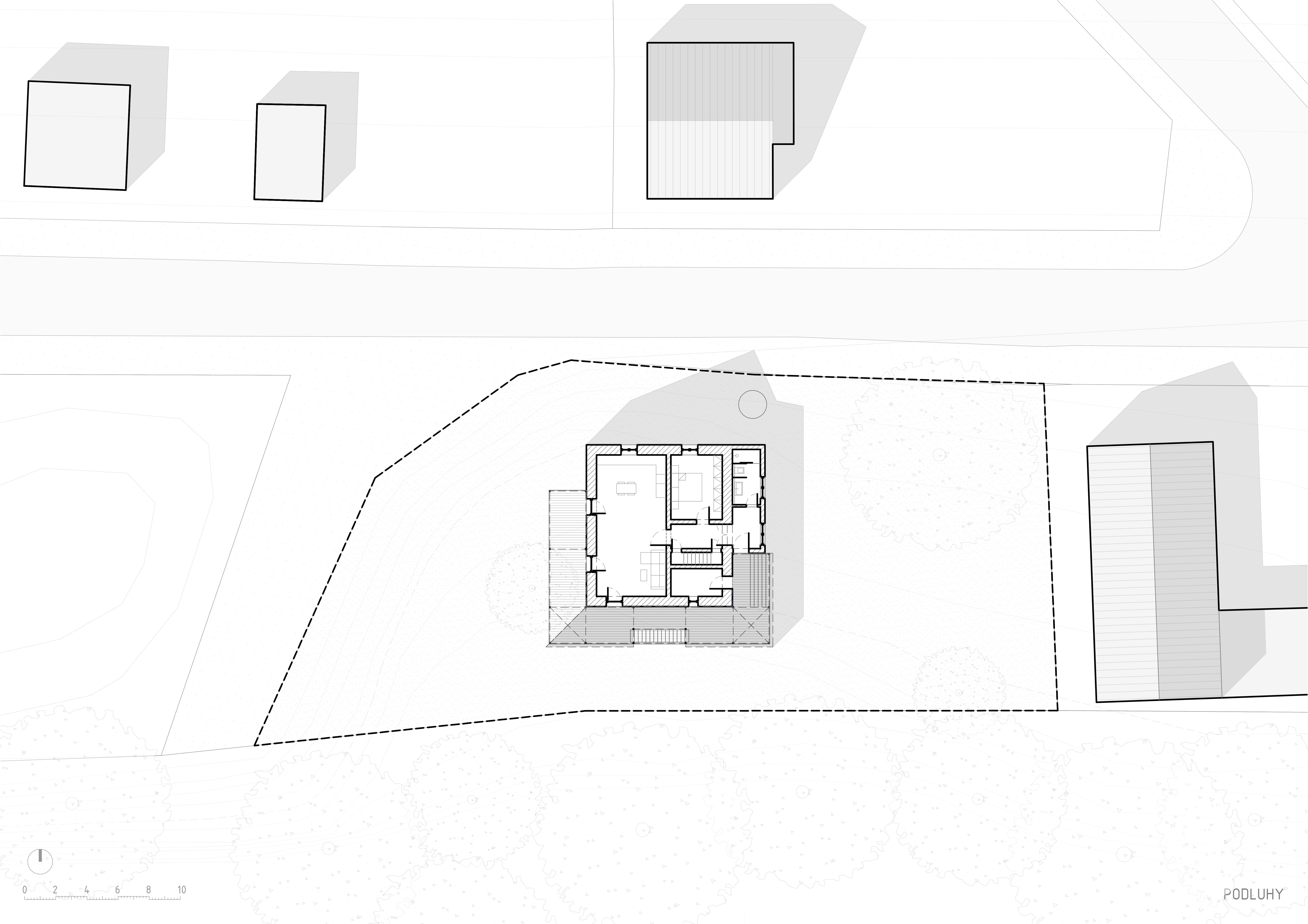 x Terasu jsme vymezili ocelovou konstrukcí trubek částečně zakrytých vlnitým plechem. Vycházeli jsme z materiálů využitých v interiéru i povolání majitelky domu (ortodontistka). Terasa po jižní straně u lesa propojuje vstupní část na východě s rekreační na západě. Na jižní fasádu jsme umístili schodiště do podkroví. Doplněním betonové desky tu zároveň vznikla další malá terasa.
