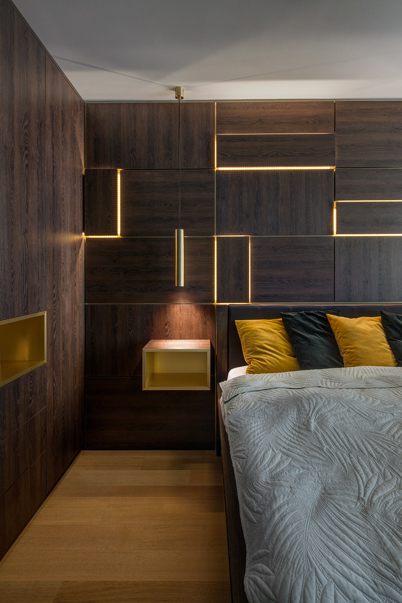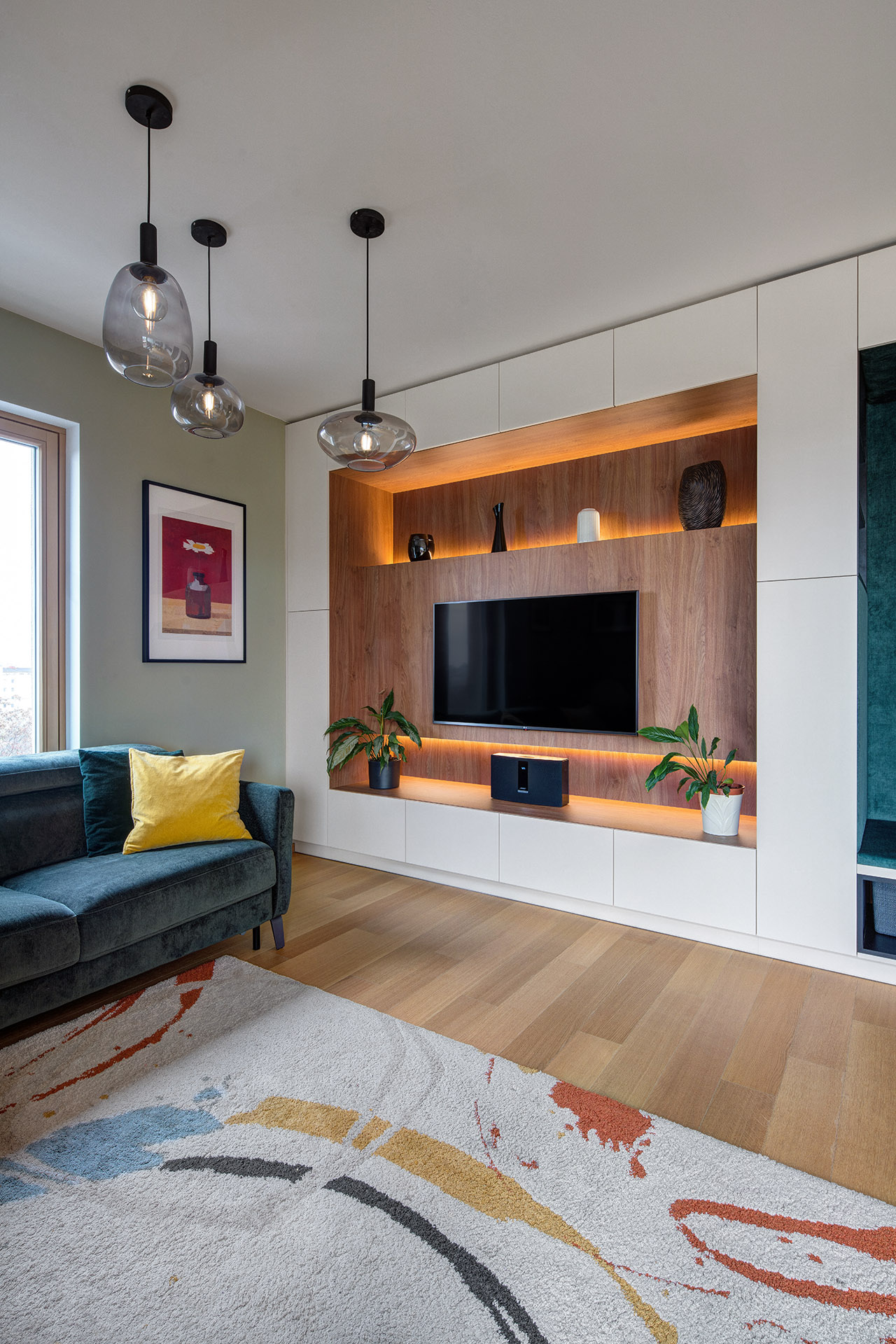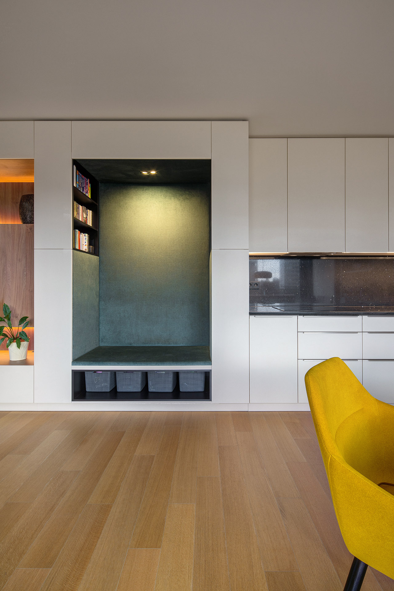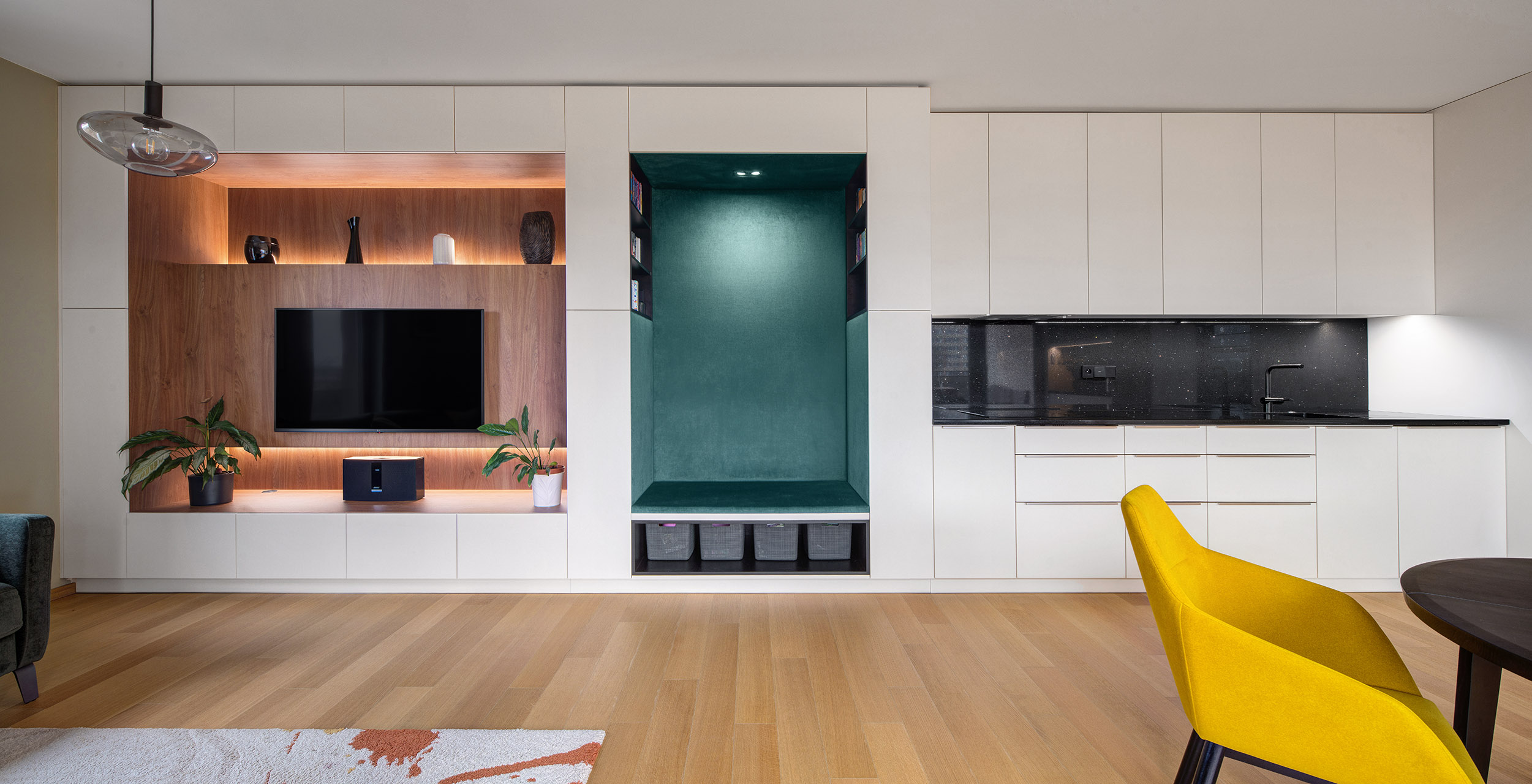 Hlavní obytný prostor je výrazně definován vestavěnou stěnou, která integruje tři funkční niky – televizní, čtenářskou a kuchyňskou – doplněné ještě o niky nápojovou. Takové řešení umožňuje maximální flexibilitu a variabilitu užití prostoru. Ložnice je pojata v elegantnějším duchu s výraznou kazetovou stěnou, zatímco dětský pokoj nabízí hravé prvky a integrovaný systém úložných a spací ploch, který reaguje na potřebu multifunkčního dětského prostředí. Celkově je byt vybalancovaným spojením funkčnosti a estetické preciznosti.