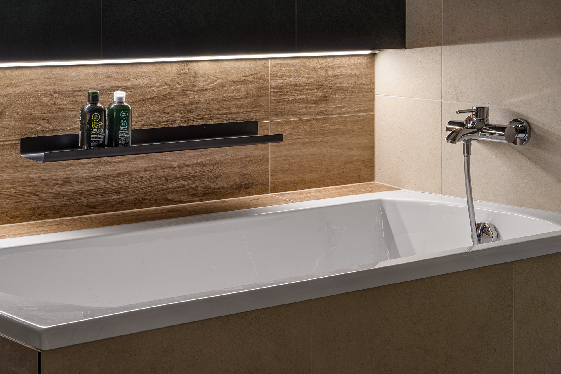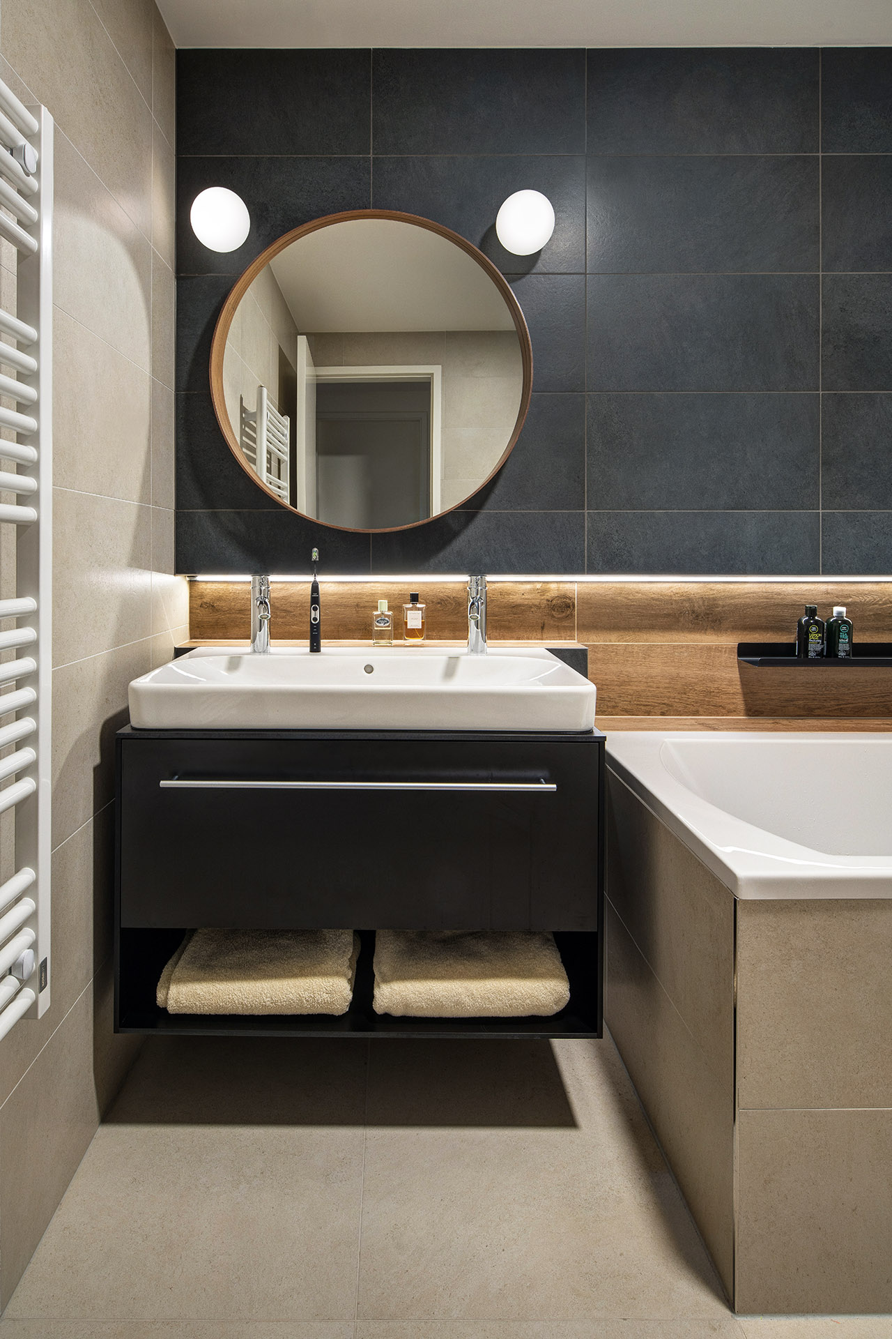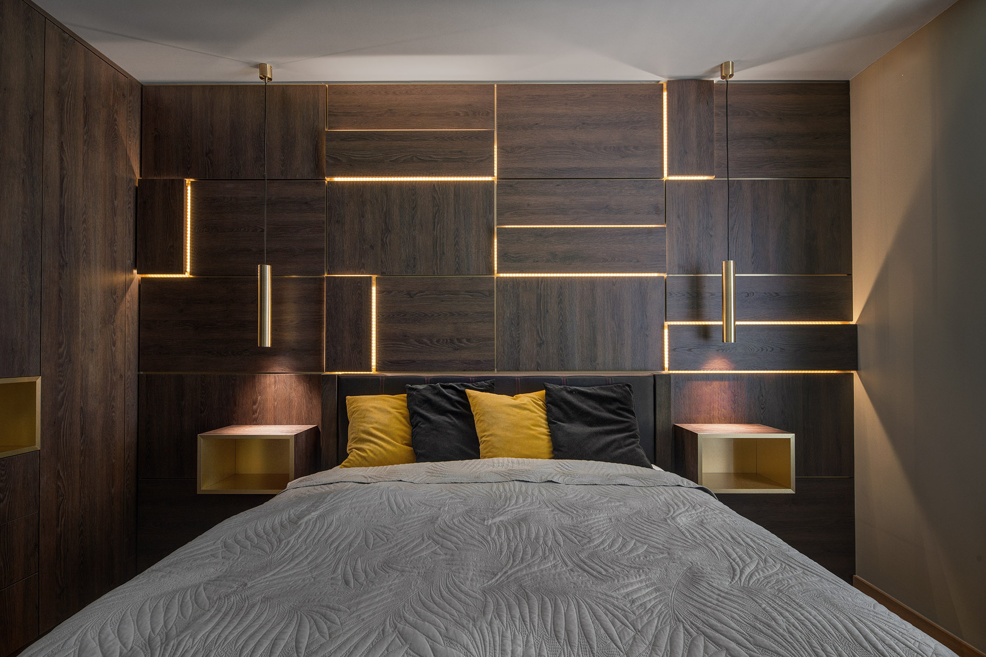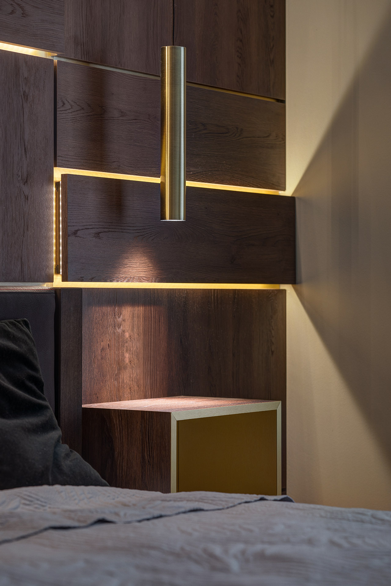 Hlavní obytný prostor je výrazně definován vestavěnou stěnou, která integruje tři funkční niky – televizní, čtenářskou a kuchyňskou – doplněné ještě o niky nápojovou. Takové řešení umožňuje maximální flexibilitu a variabilitu užití prostoru. Ložnice je pojata v elegantnějším duchu s výraznou kazetovou stěnou, zatímco dětský pokoj nabízí hravé prvky a integrovaný systém úložných a spací ploch, který reaguje na potřebu multifunkčního dětského prostředí. Celkově je byt vybalancovaným spojením funkčnosti a estetické preciznosti.