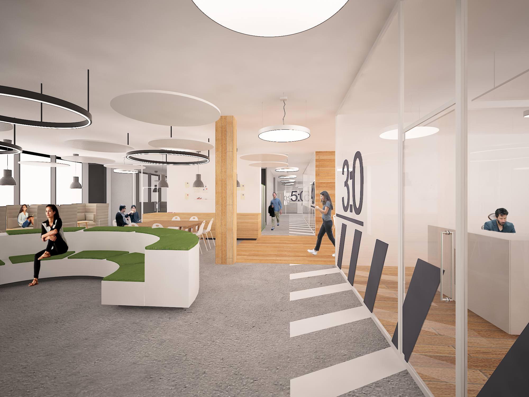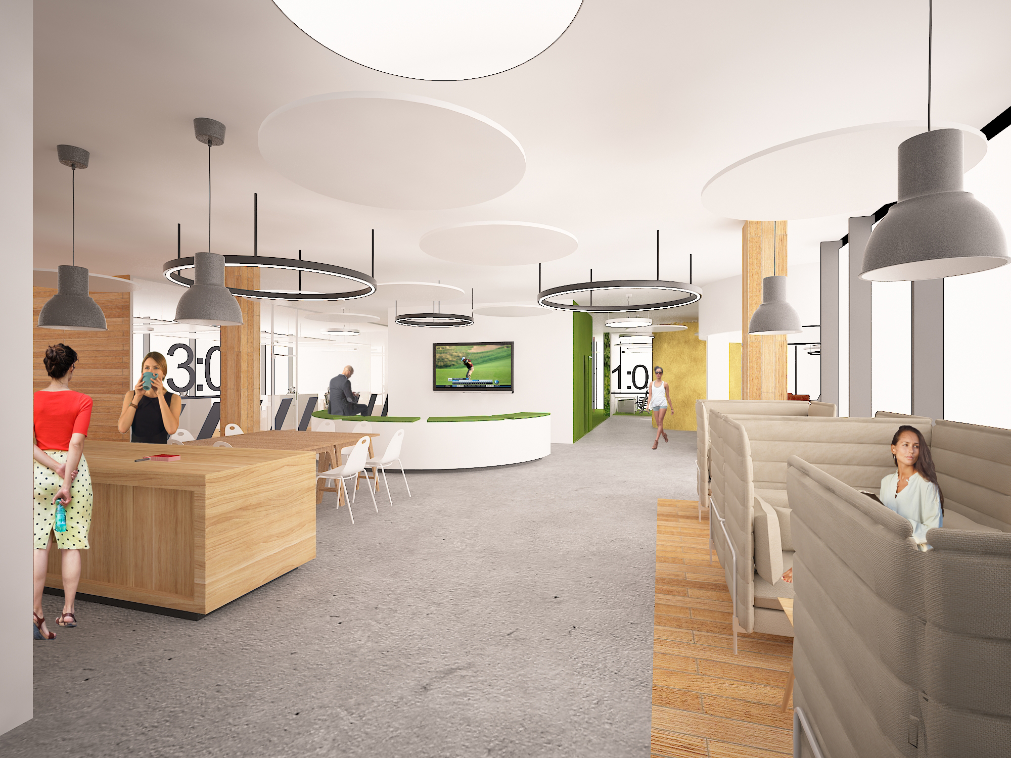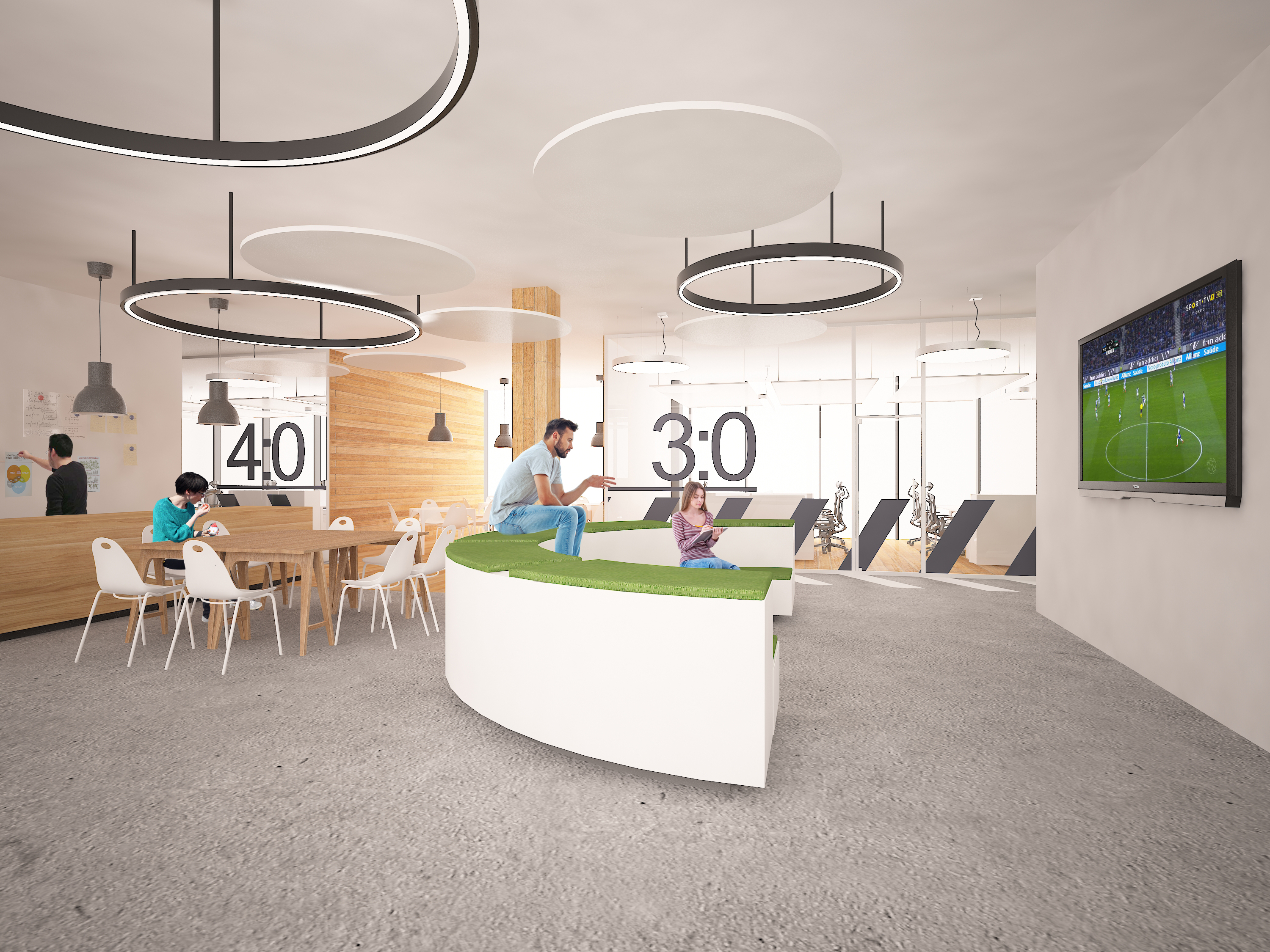 Pro klienta s aktivní firemní kulturou jsme navrhli kancelářské prostory, které propojují pracovní a společenské zóny s důrazem na sportovní tematiku. Pracovní místnosti jsme uspořádali tak, aby byly jasně vymezené a funkční, zatímco společenské a relaxační zóny jsou hravé, dynamické a založené na kruhovém tvarosloví evokujícím sportovní prostředí. Meziprostory slouží pro neformální setkávání a odpočinek – například s houpačkami či pohodlnými posezeními –, což vytváří synergii mezi produktivní prací a odpočinkem.