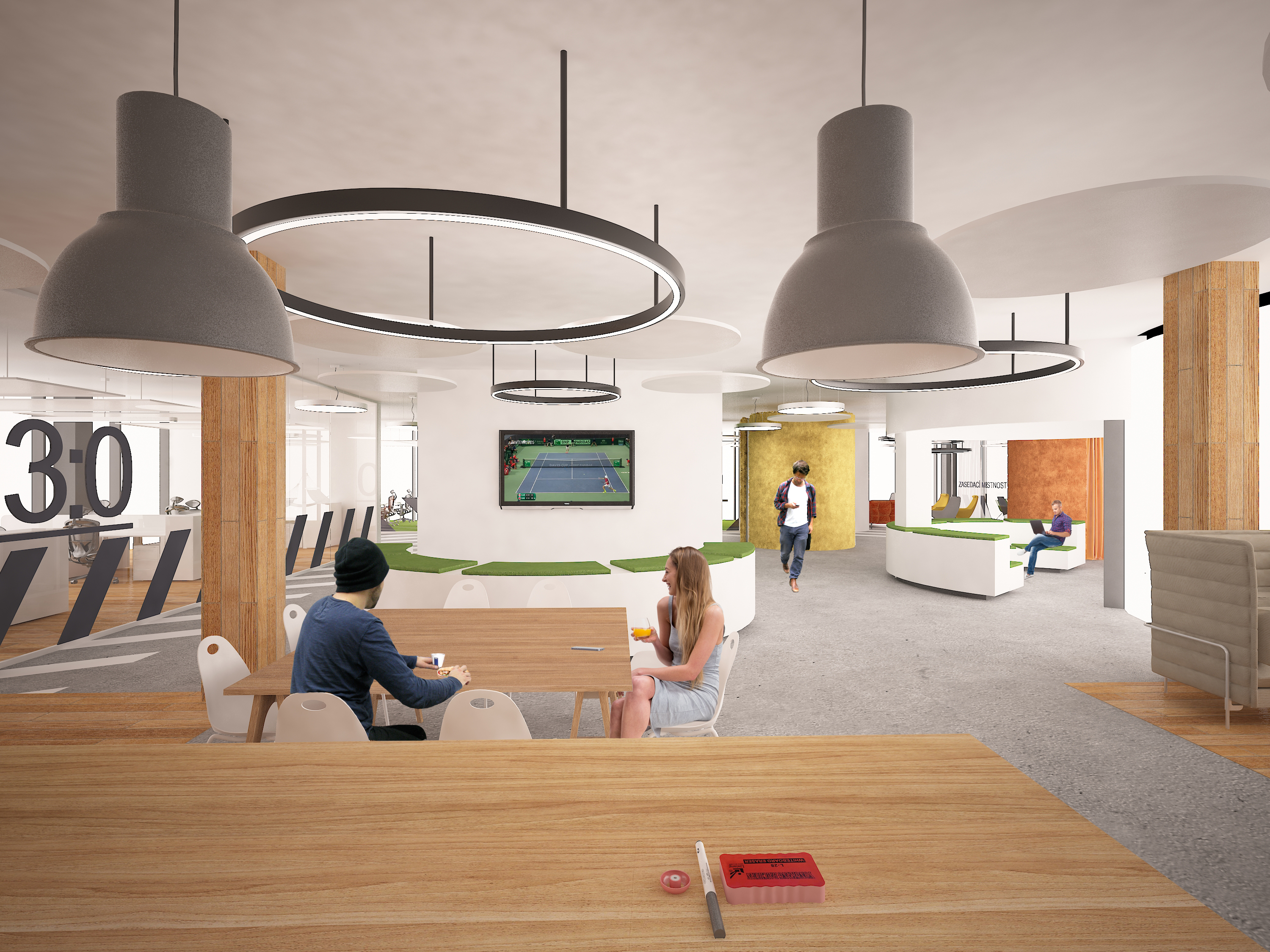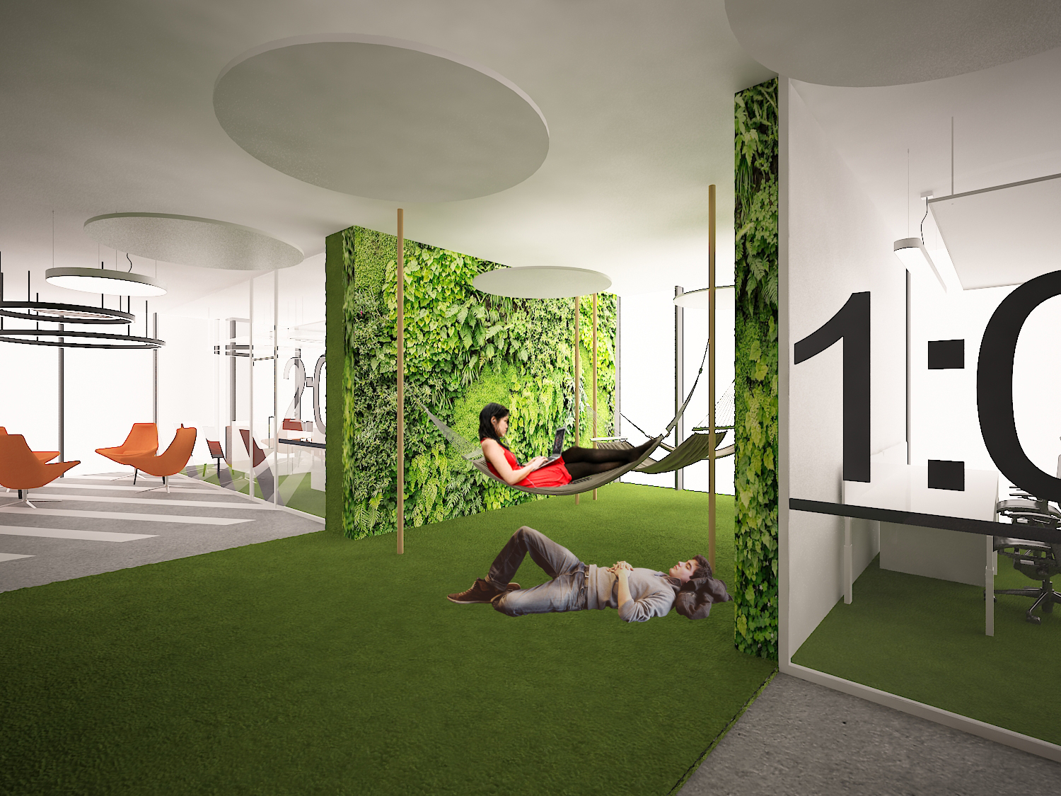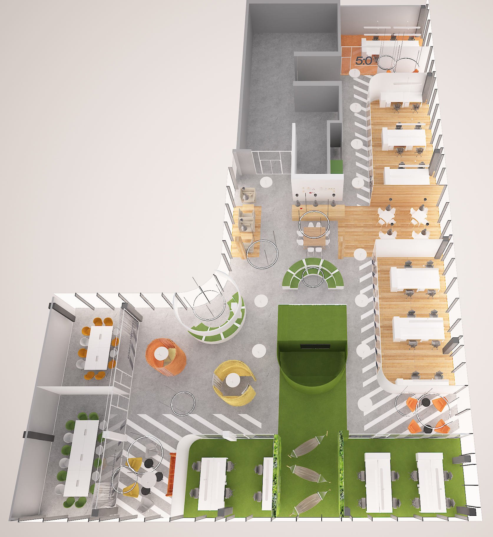 Pro klienta s aktivní firemní kulturou jsme navrhli kancelářské prostory, které propojují pracovní a společenské zóny s důrazem na sportovní tematiku. Pracovní místnosti jsme uspořádali tak, aby byly jasně vymezené a funkční, zatímco společenské a relaxační zóny jsou hravé, dynamické a založené na kruhovém tvarosloví evokujícím sportovní prostředí. Meziprostory slouží pro neformální setkávání a odpočinek – například s houpačkami či pohodlnými posezeními –, což vytváří synergii mezi produktivní prací a odpočinkem.