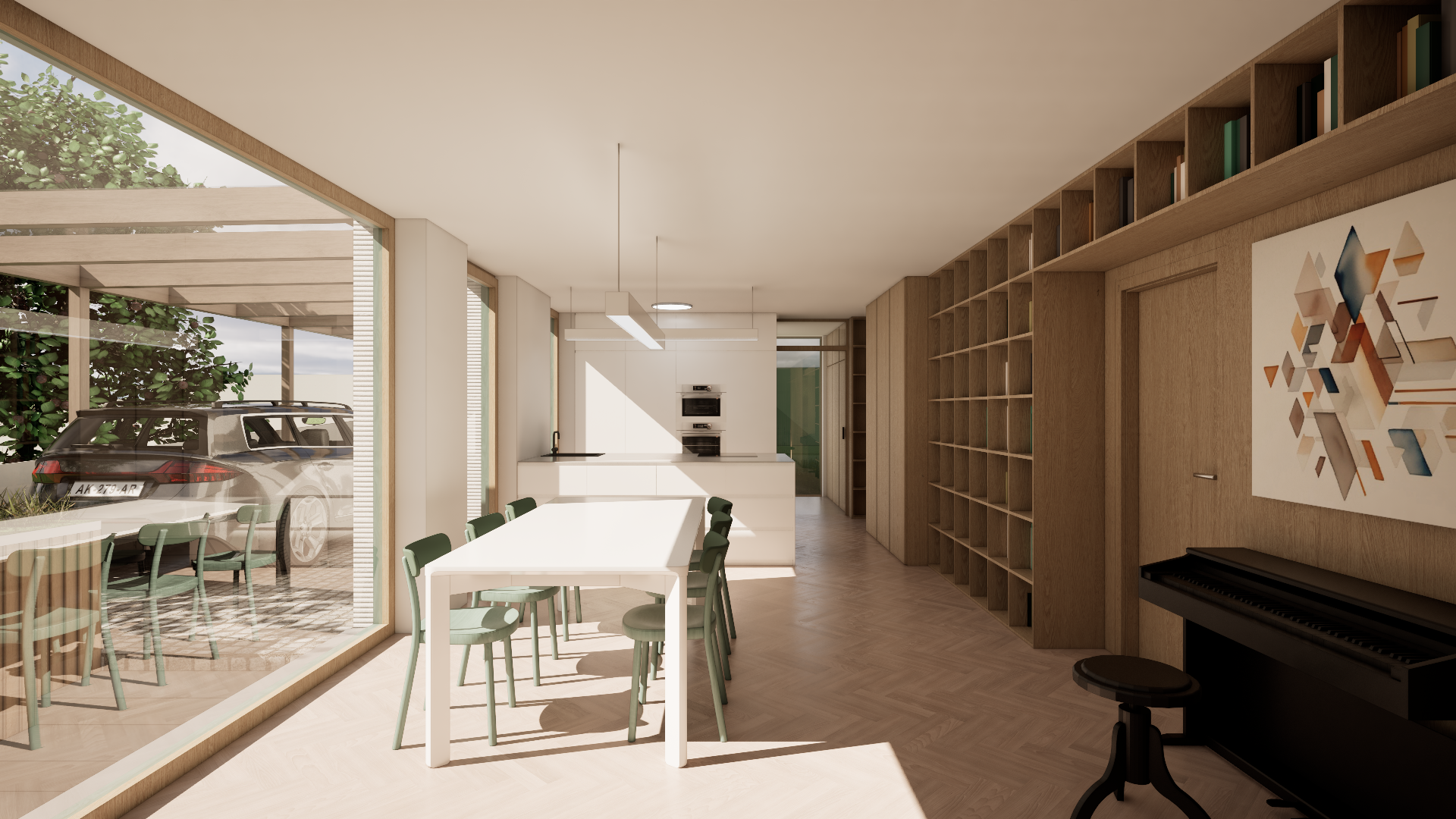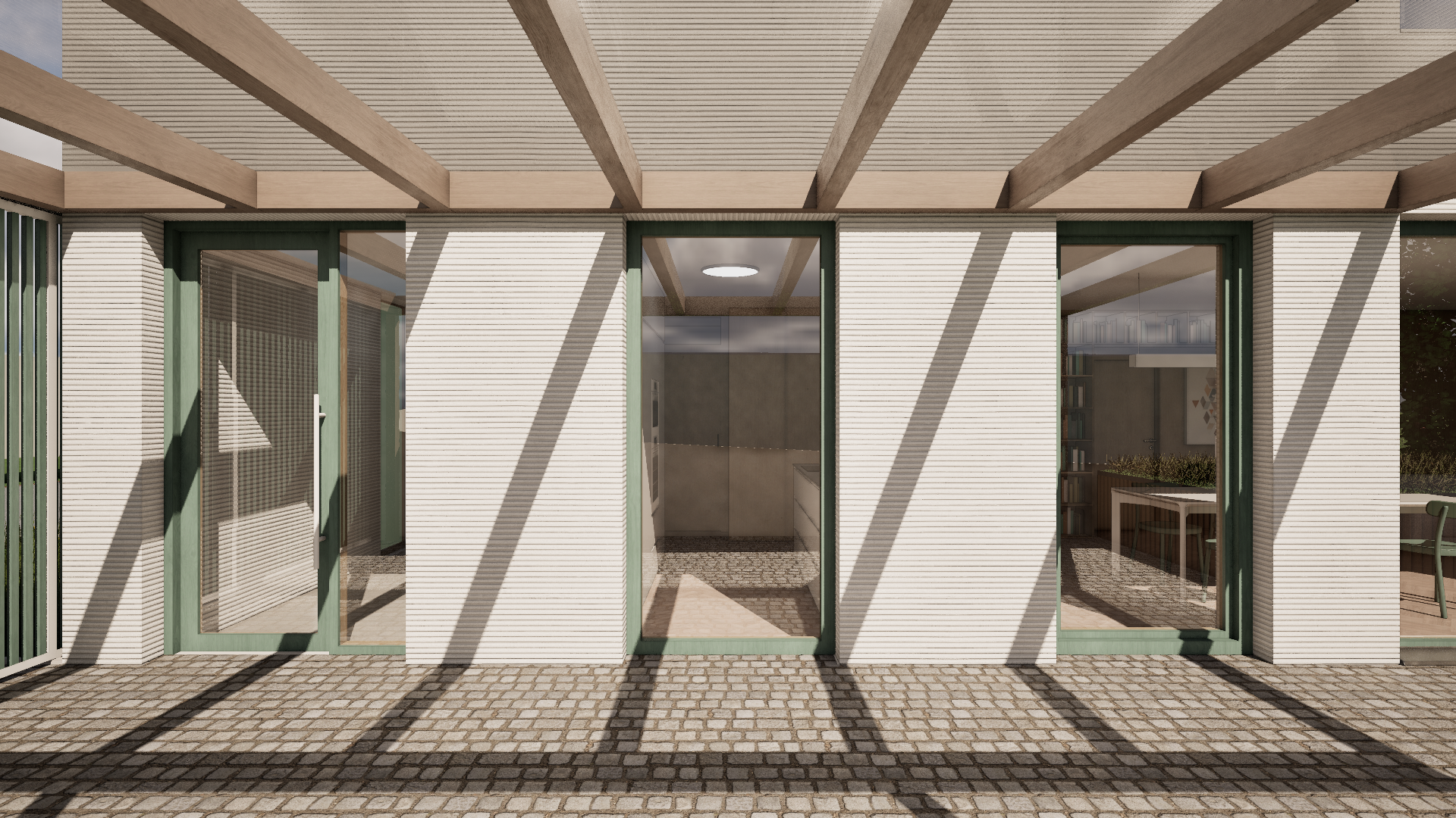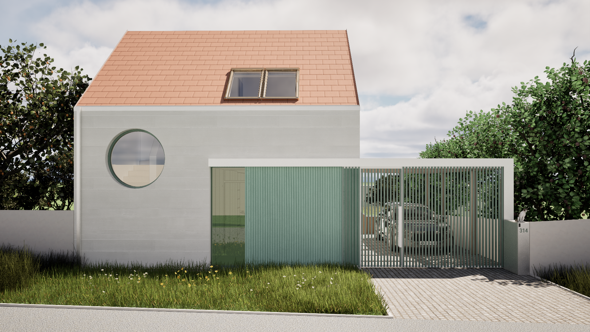 Novostavba na úzké parcele v centru obce navazuje svým tvarem i výrazem na charakter řadové zástavby. V současnosti stojí jako samostatný dům mezi dvěma prázdnými parcelami, návrh však počítá s budoucím doplněním sousední zástavby. Do ulice je orientována sedlová střecha a jednoduchá fasáda s minimem otvorů, na opačné straně se dům otevírá do zahrady přes hlavní obytné prostory. Dispozice vychází z požadavku na kompaktní, funkční bydlení pro čtyřčlennou rodinu.