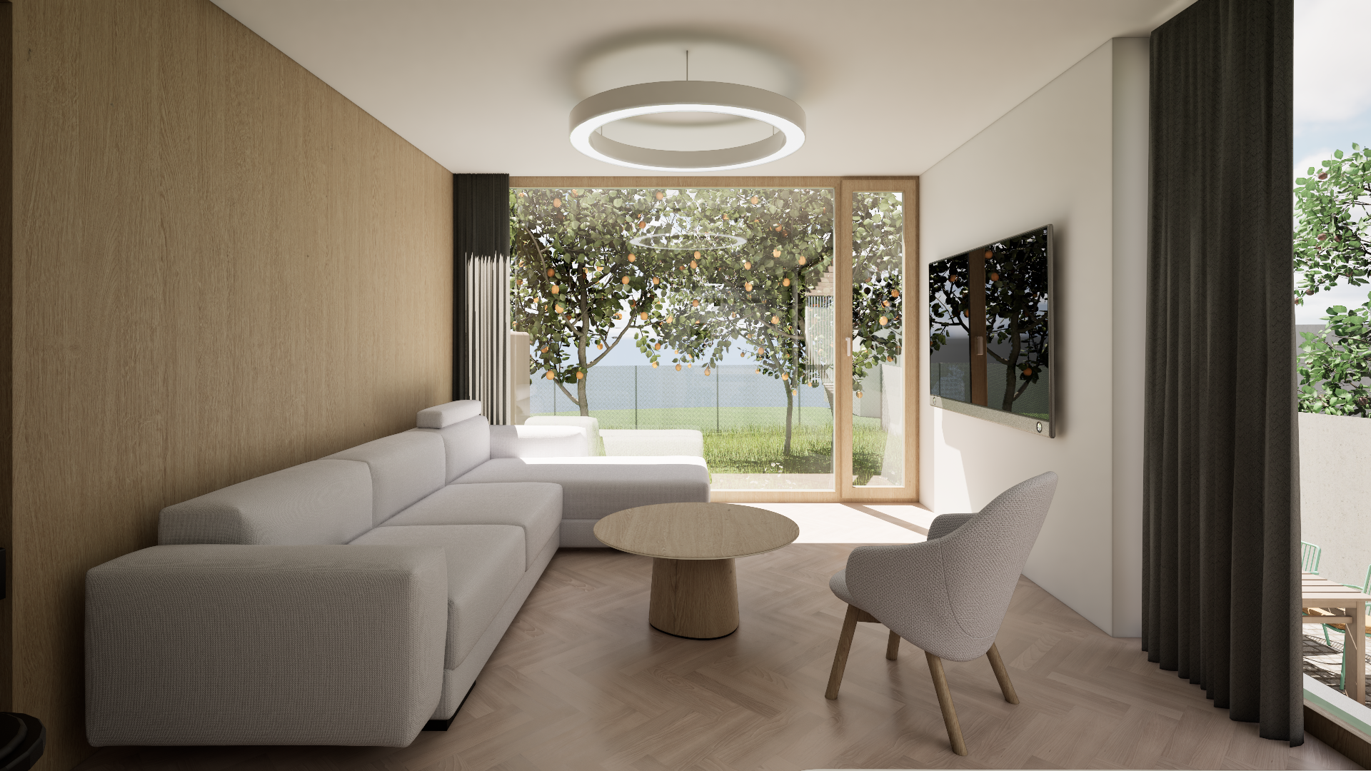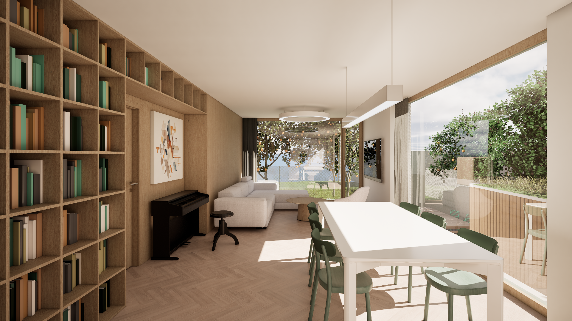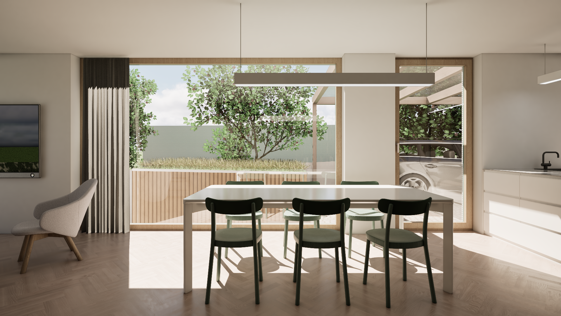 Novostavba na úzké parcele v centru obce navazuje svým tvarem i výrazem na charakter řadové zástavby. V současnosti stojí jako samostatný dům mezi dvěma prázdnými parcelami, návrh však počítá s budoucím doplněním sousední zástavby. Do ulice je orientována sedlová střecha a jednoduchá fasáda s minimem otvorů, na opačné straně se dům otevírá do zahrady přes hlavní obytné prostory. Dispozice vychází z požadavku na kompaktní, funkční bydlení pro čtyřčlennou rodinu.