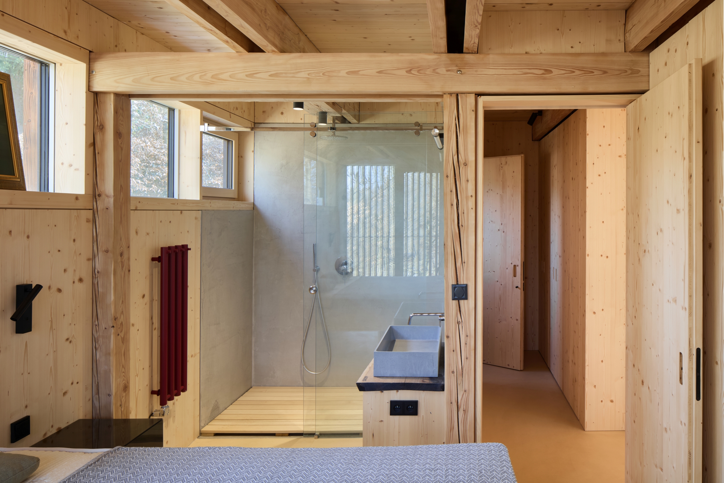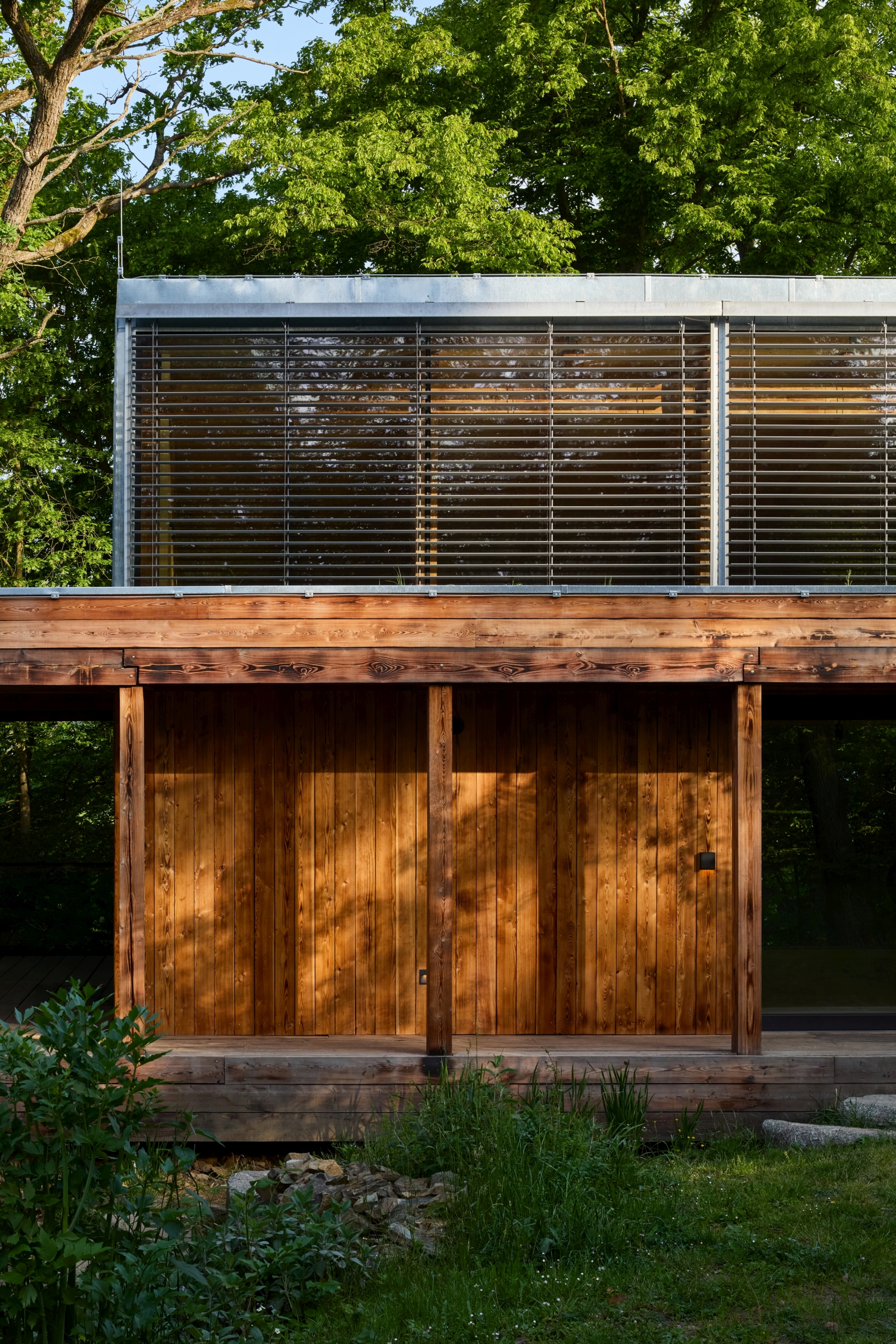 Při hledání vhodného místa a objemu jsme respektovali klínovitý tvar pozemku, konfiguraci terénu, stávající vzrostlé stromy a ukázalo se, že je důležité, aby byl zachován výhled ze zahrady domu do údolí Sázavy a na vrchol Medníku.