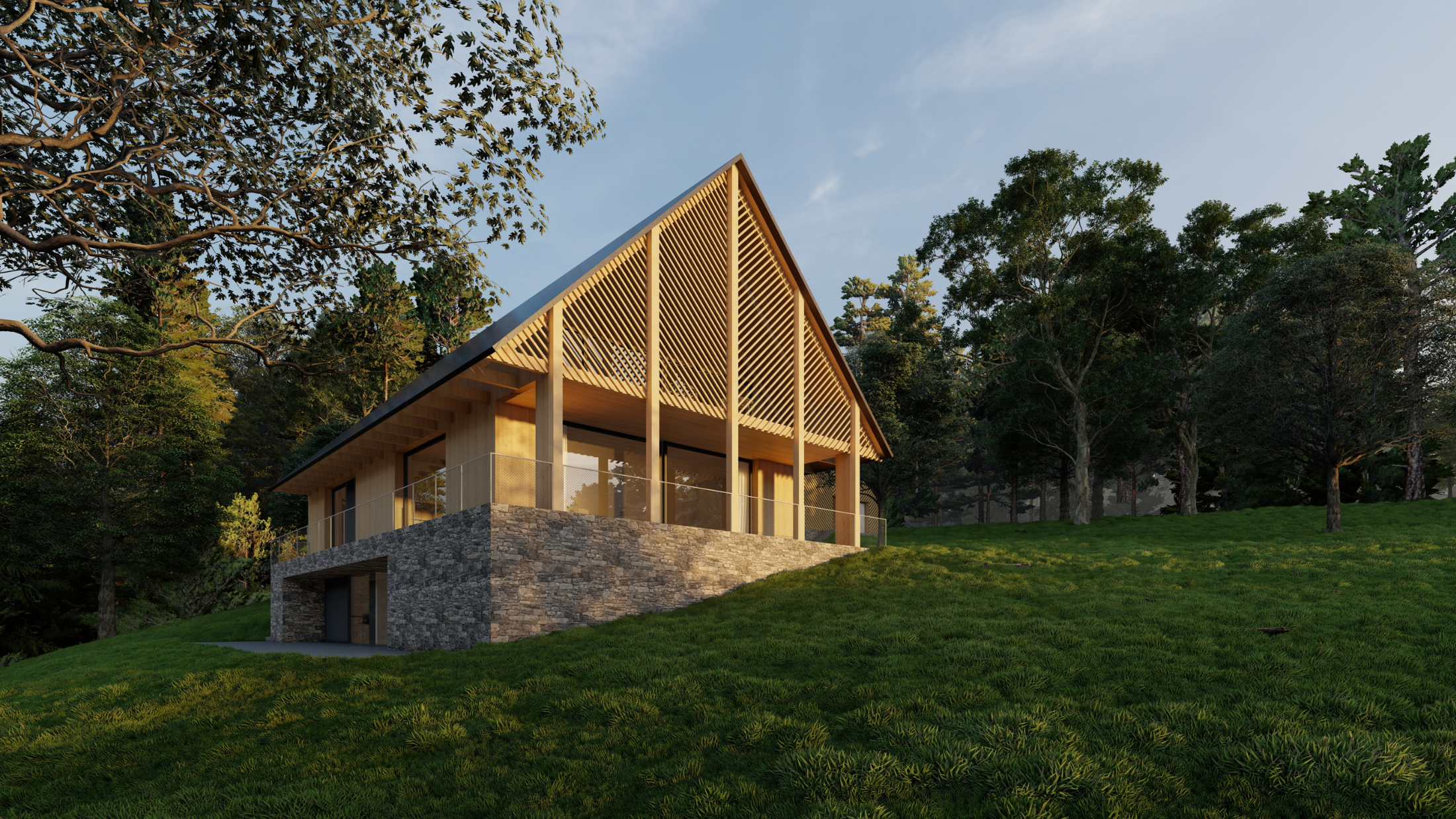 Návrh vychází z požadavků investora a tradičních historických staveb Jizerských hor. Dřevostavba se sedlovou střechou a podezdívkou je navržena v příkrém svahu na půdorysu původního objektu. Dům je funkčně rozdělen dle pater – v přízemí se nachází společenská část otevřená na jih a západ s hlubokými terasami, v podkroví část soukromá s velkorysou lodžií a suterén obsahuje technikou část domu a wellness, které je propojeno přímo se zahradou. Jednoduchost hmoty je doplněna dominantami šikmého laťování, vertikálami dřevěných sloupů a velkými prosklenými otvory. Podtržena je nadčasovými materiály jako jsou dřevo a kámen.