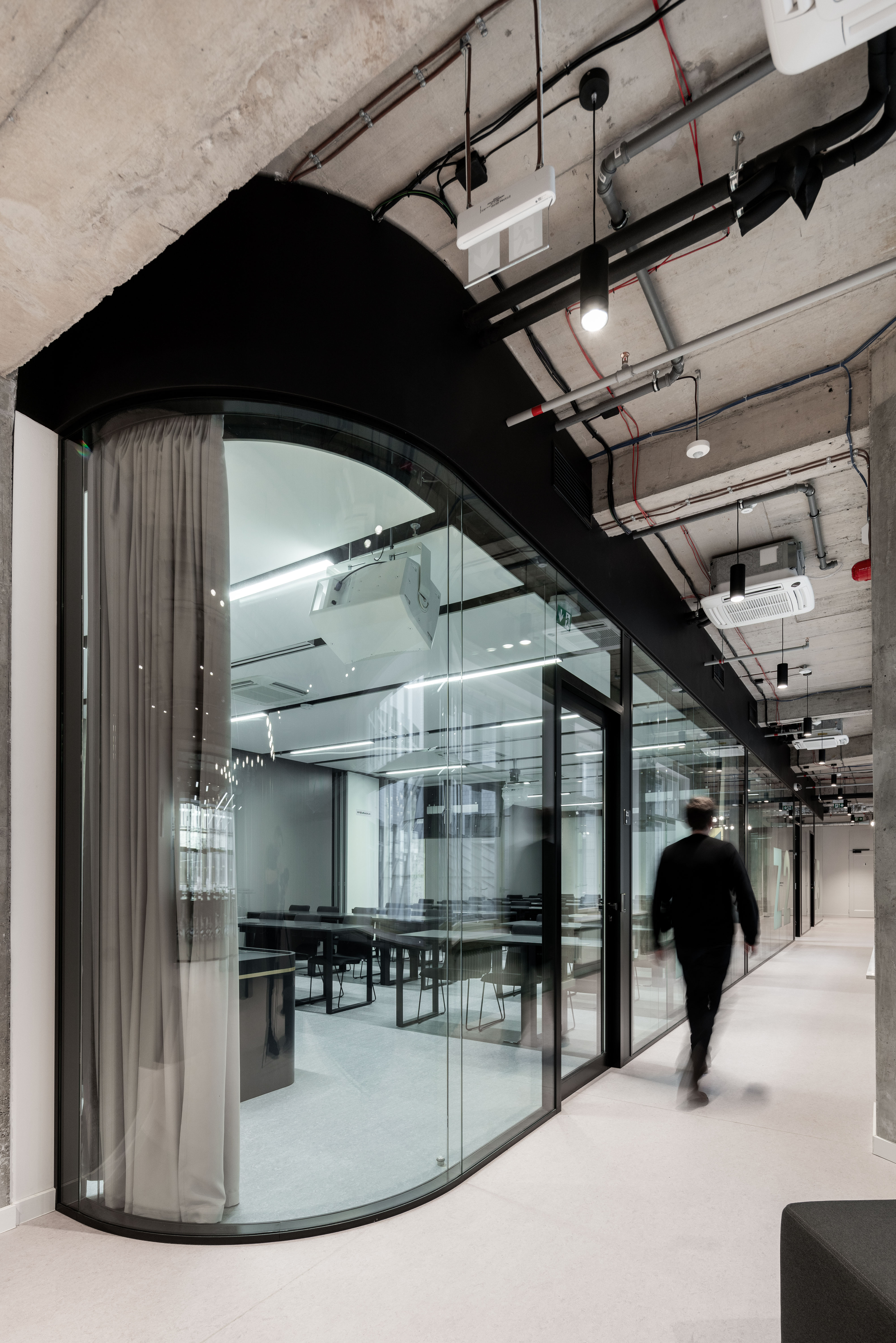 Přiznané železobetonové konstrukce budovy doplňují kvalitními materiály, které odpovídají důstojnosti a důležitosti řešených prostor ať už jde o skleněné příčky, dřevěné a textilní akustické obklady, přírodní linoleum, beton a kvalitní koberce.
