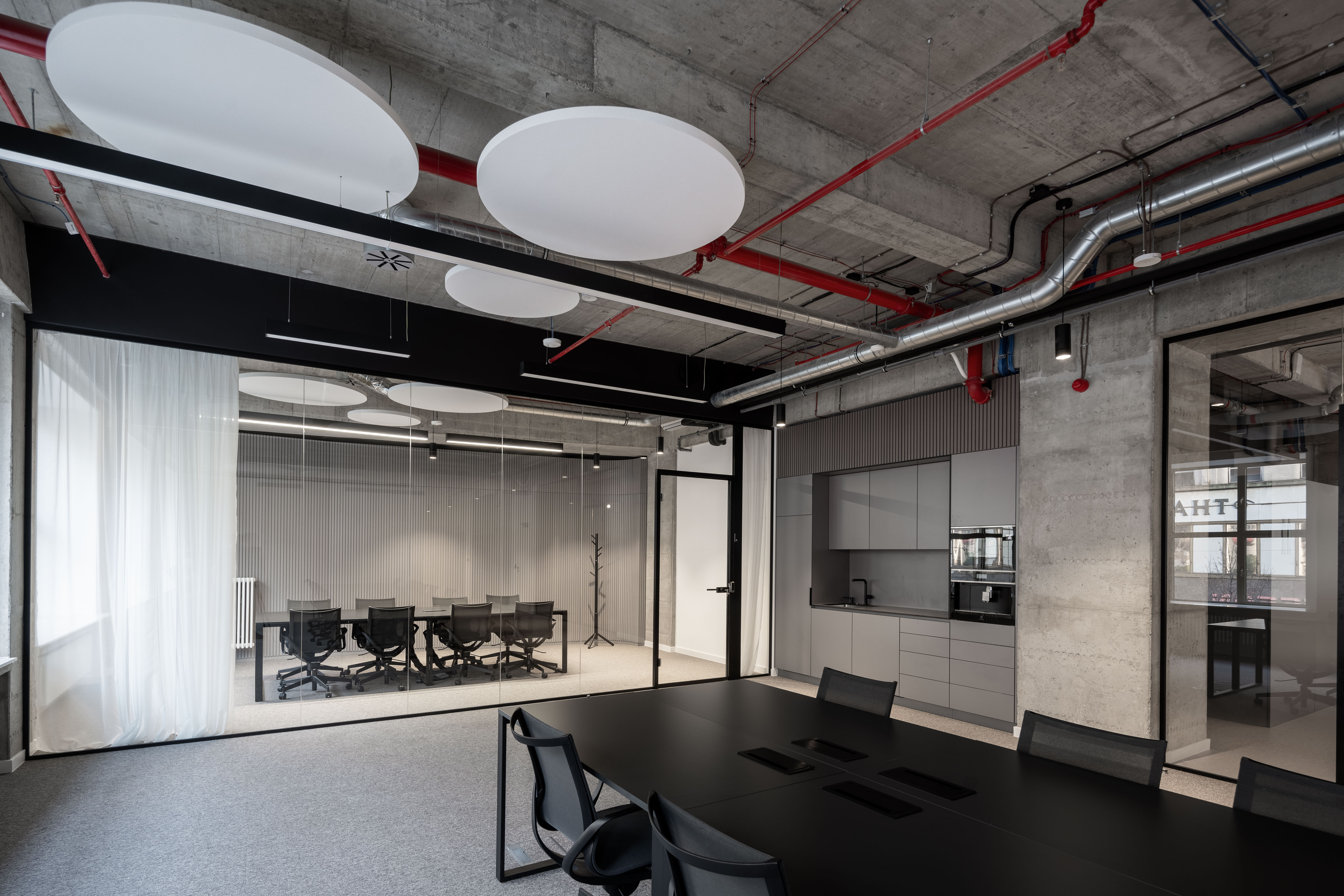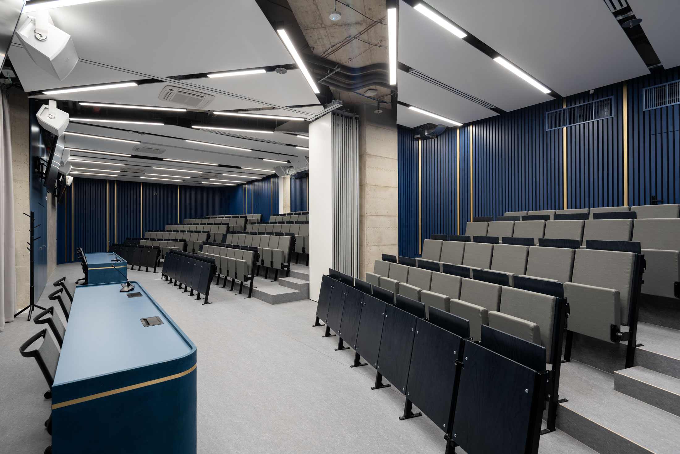 Komplexní akustické řešení jednacích místností, školících a konferenčních sálů je zajištěno segmentovými napínanými podhledy a stěnovými obklady v kombinaci s akustickými závěsy. Kanceláře jsou vybaveny lokálními svěšenými akustickými podhledy v kombinaci se stěnovými obklady. Technické instalace jsou ve společných prostorách vedeny pohledově pod stropem, v reprezentativních prostorech jsou vedeny skrytě nad akustickými podhledy.