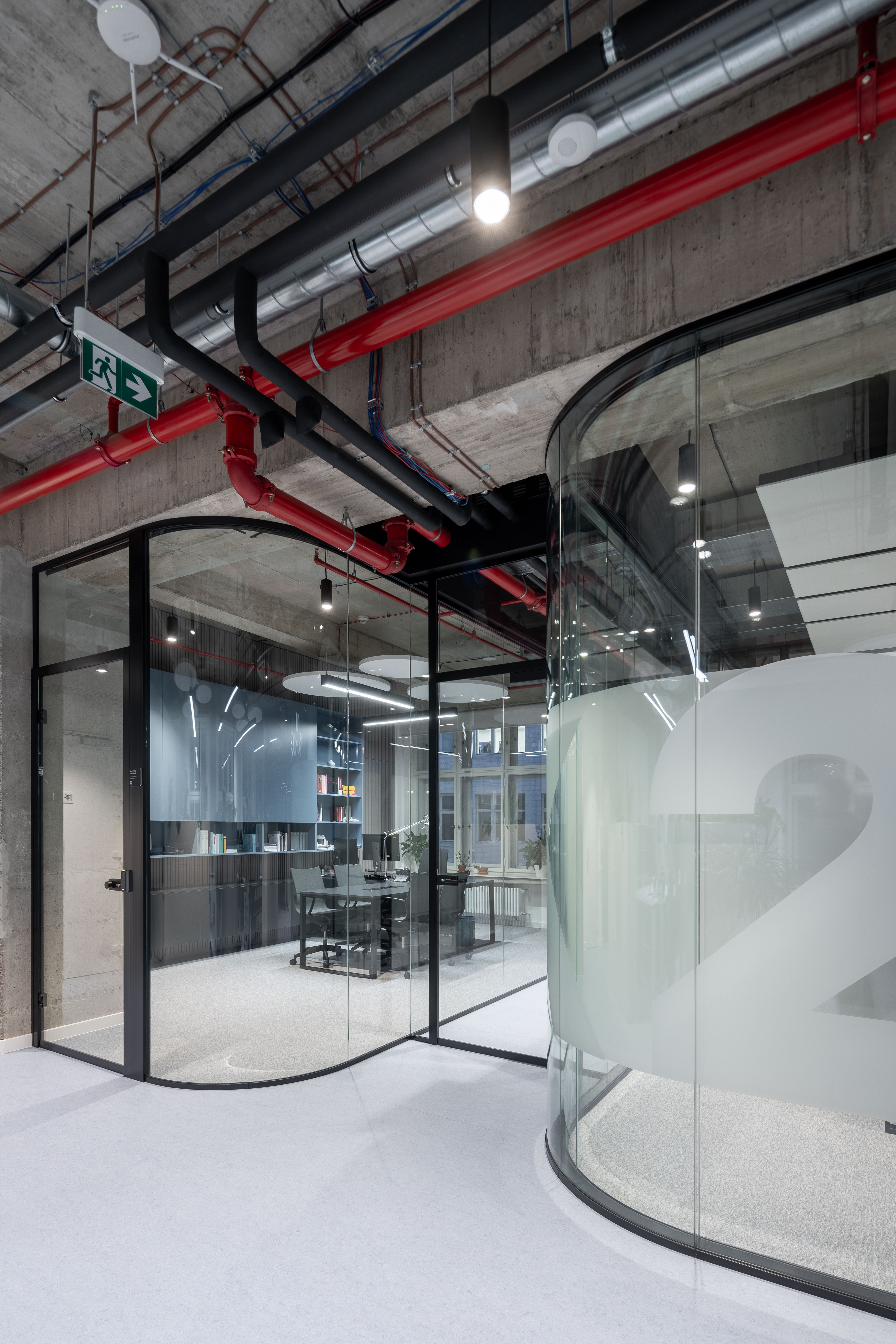 Kompoziční a výtvarnou ideu zaoblených prosklených školících a konferenční sálů a „ostrovů“ zázemí doplňuje jednotící barevné řešení podlah a stěn společných prostor. Tyto “ostrovy“ v dispozici opatřené barevnými truhlářskými obestavbami a obklady integrují přidané funkce kuchyněk, šaten apod. a pomáhají zlepšovat prostorovou akustiku. Pohyb a orientace v rámci jednotlivých podlaží je přehlednější, plynulejší a přirozenější, díky jednotícímu barevnému řešení podlah a stěnových obkladů v rámci jednotlivých podlaží.