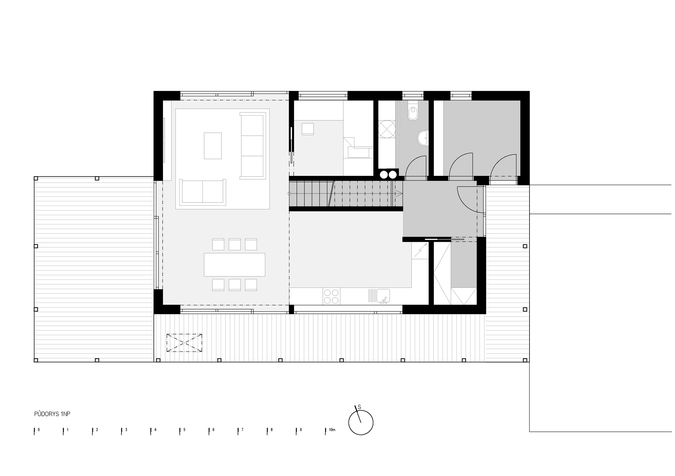Dispozice prvního nadzemního podlaží váže na koncepční průhledovou osu domu od vstupní haly a graduje skrz kuchyň do obytného prostoru otevřeného do podkroví. Otevření stropní části obytného prostoru zdůrazňuje jeho důležitost jakožto hlavní části domu a zároveň umožňuje vizuální propojení spolu s kontrolu dění v druhém patře.