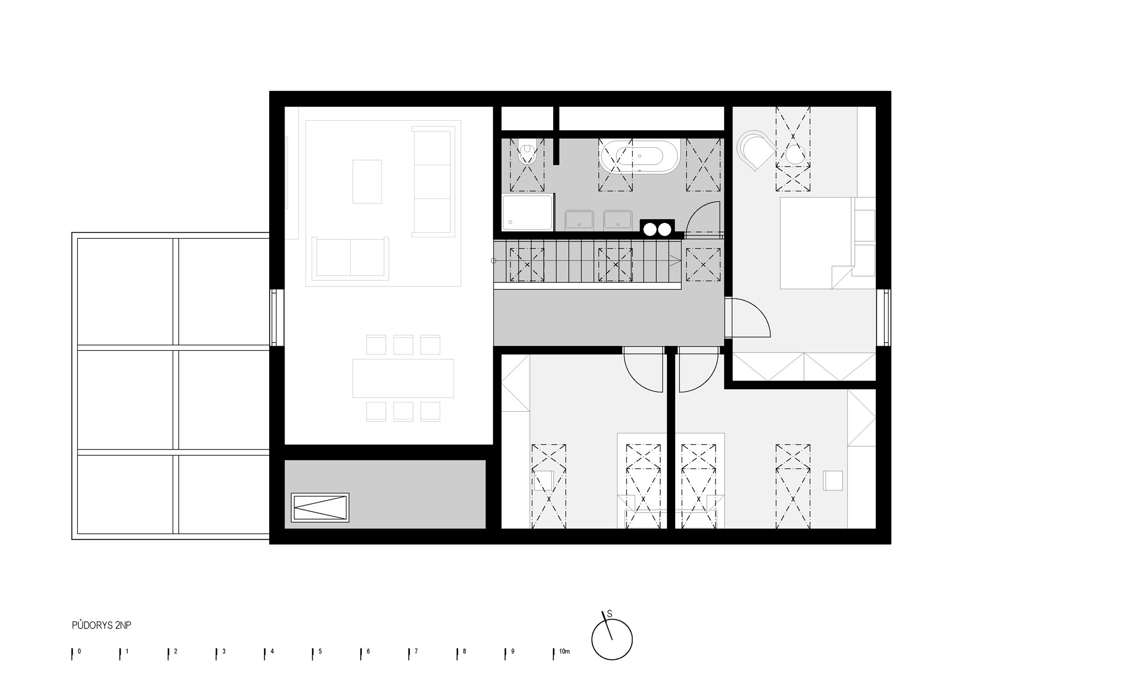 Rodinný dům o dispozici 5+kk je zónován na denní část v 1.NP a soukromou s pokoji ve 2.NP.