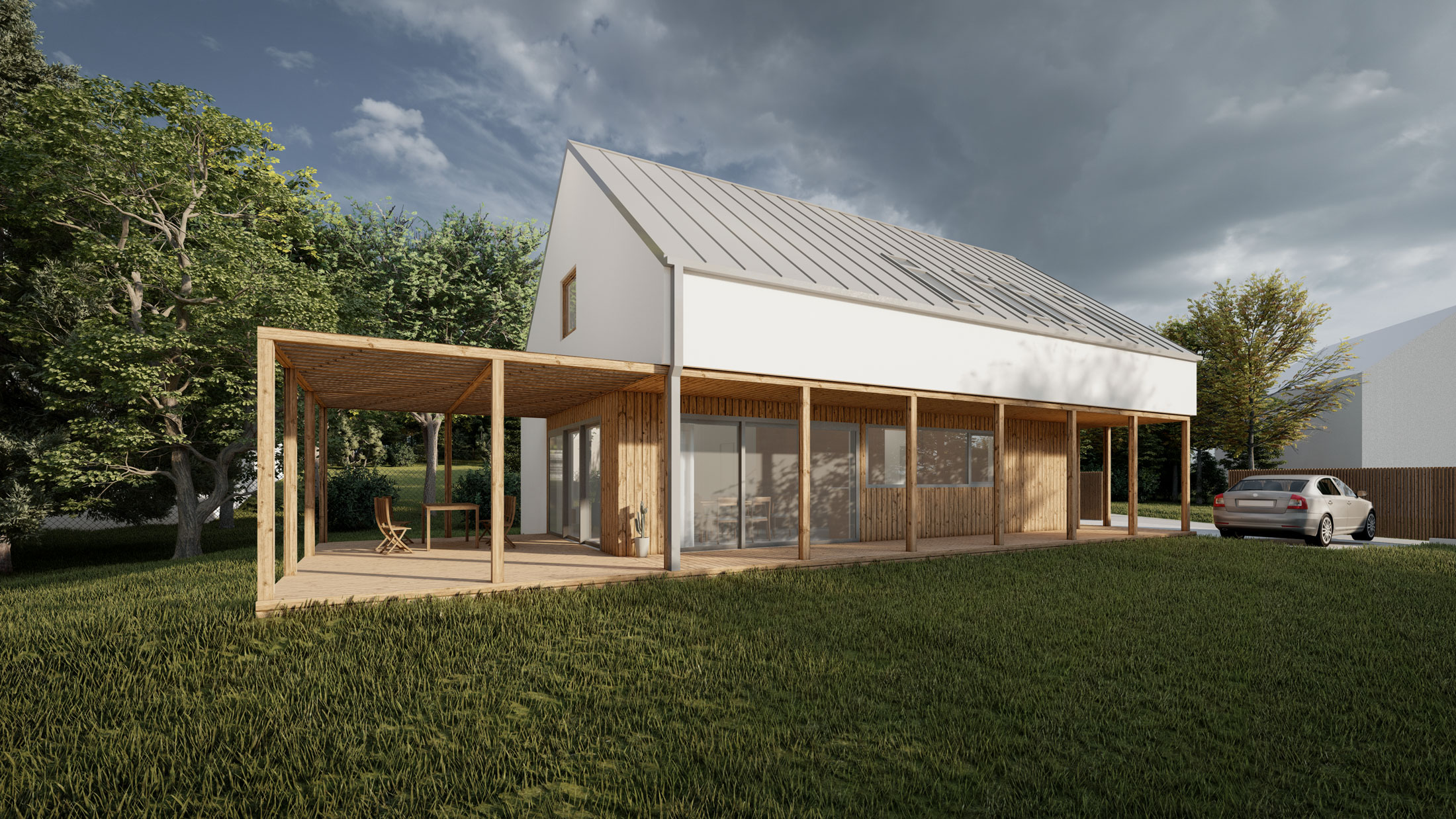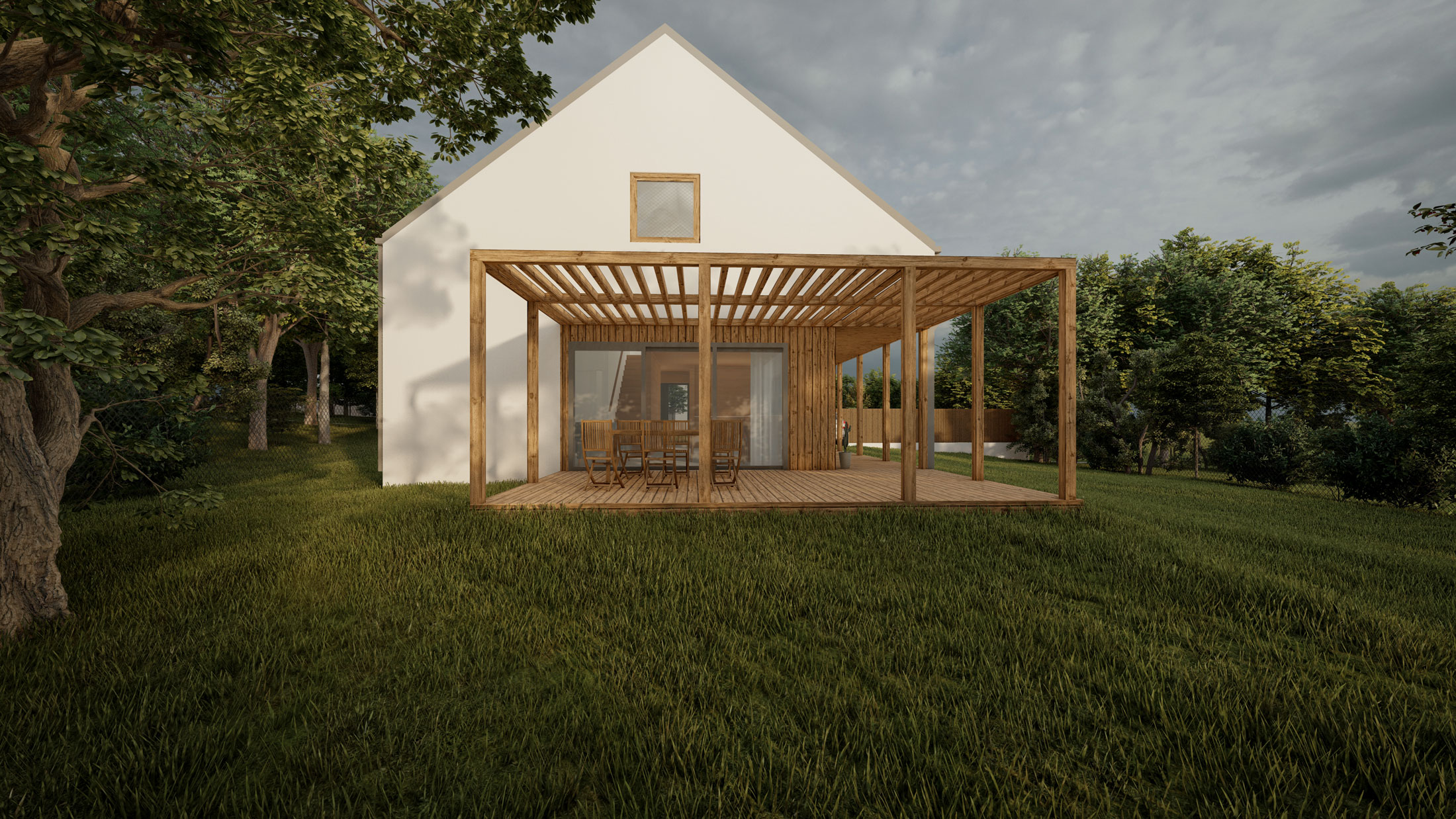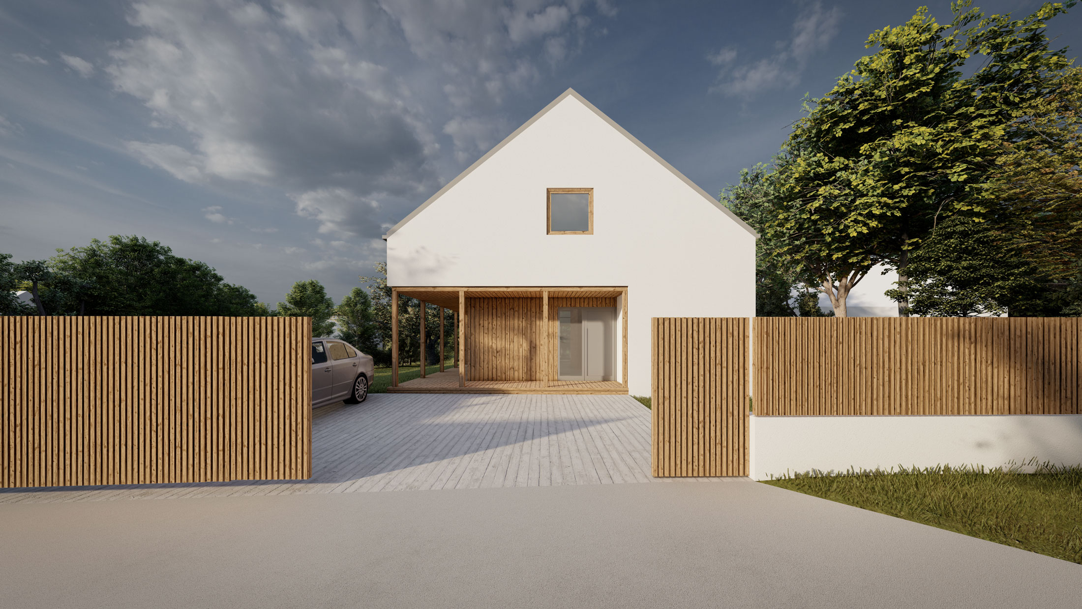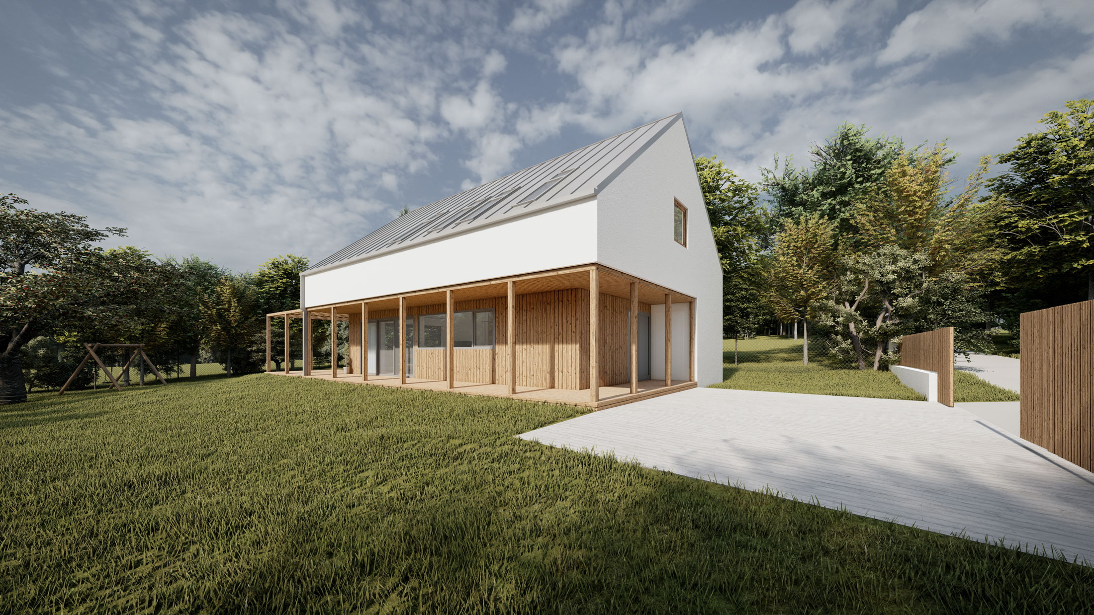 Předmětem architektonické studie je rodinný dům na nezastavěné parcele. Hlavní myšlenkou je vytvoření kompaktní hmoty domu pro maximální využití plochy zahrady. Za nejdůležitější považujeme slunečnou, jihozápadní část pozemku. Samotné prostory domu gradují v ose od vstupu na zahradu podle funkce a důležitosti. Důraz je kladen také otevření jednotlivých obytných prostor do zahrady. Objekt je navržen jako dřevostavba v systému two by four.