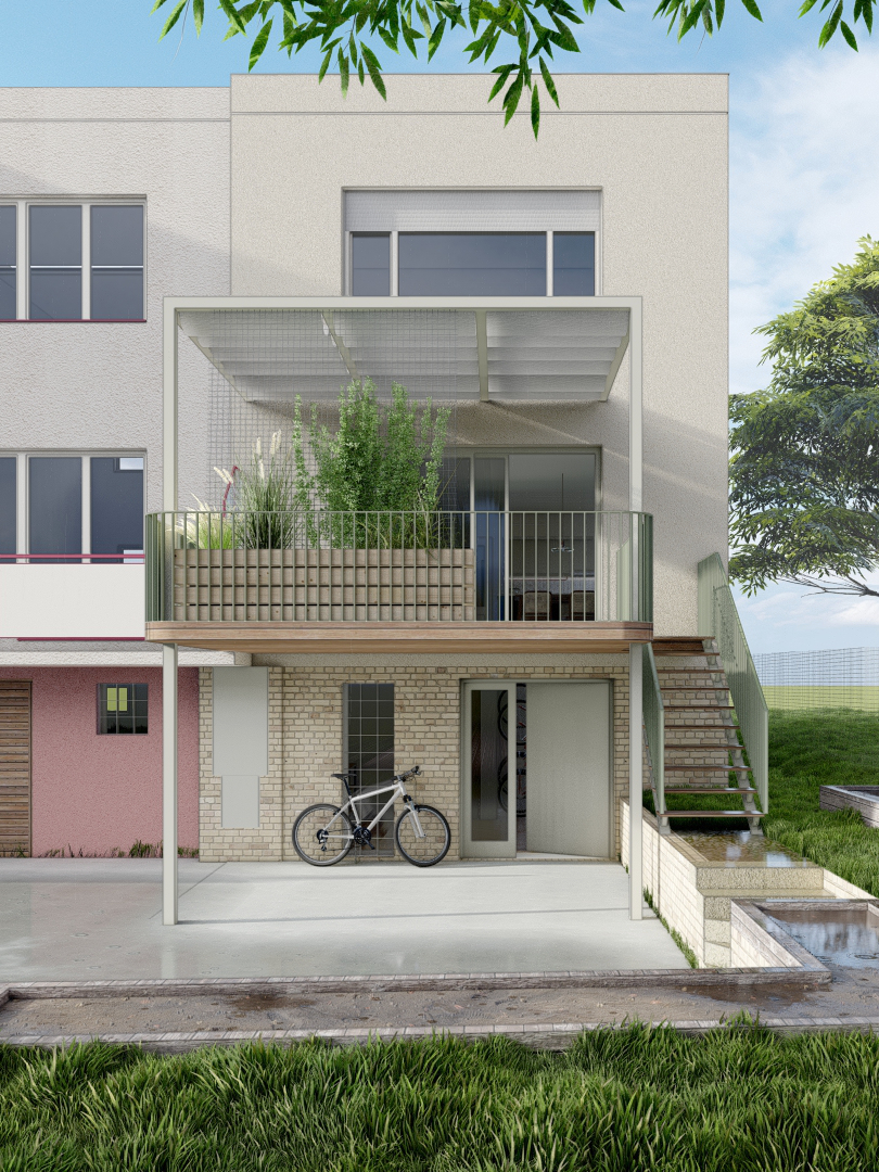 K zadní fasádě bude přistavěna terasa, která kromě komfortního pobytového prostoru zajistí dosud chybějící vazbu na zahradu.