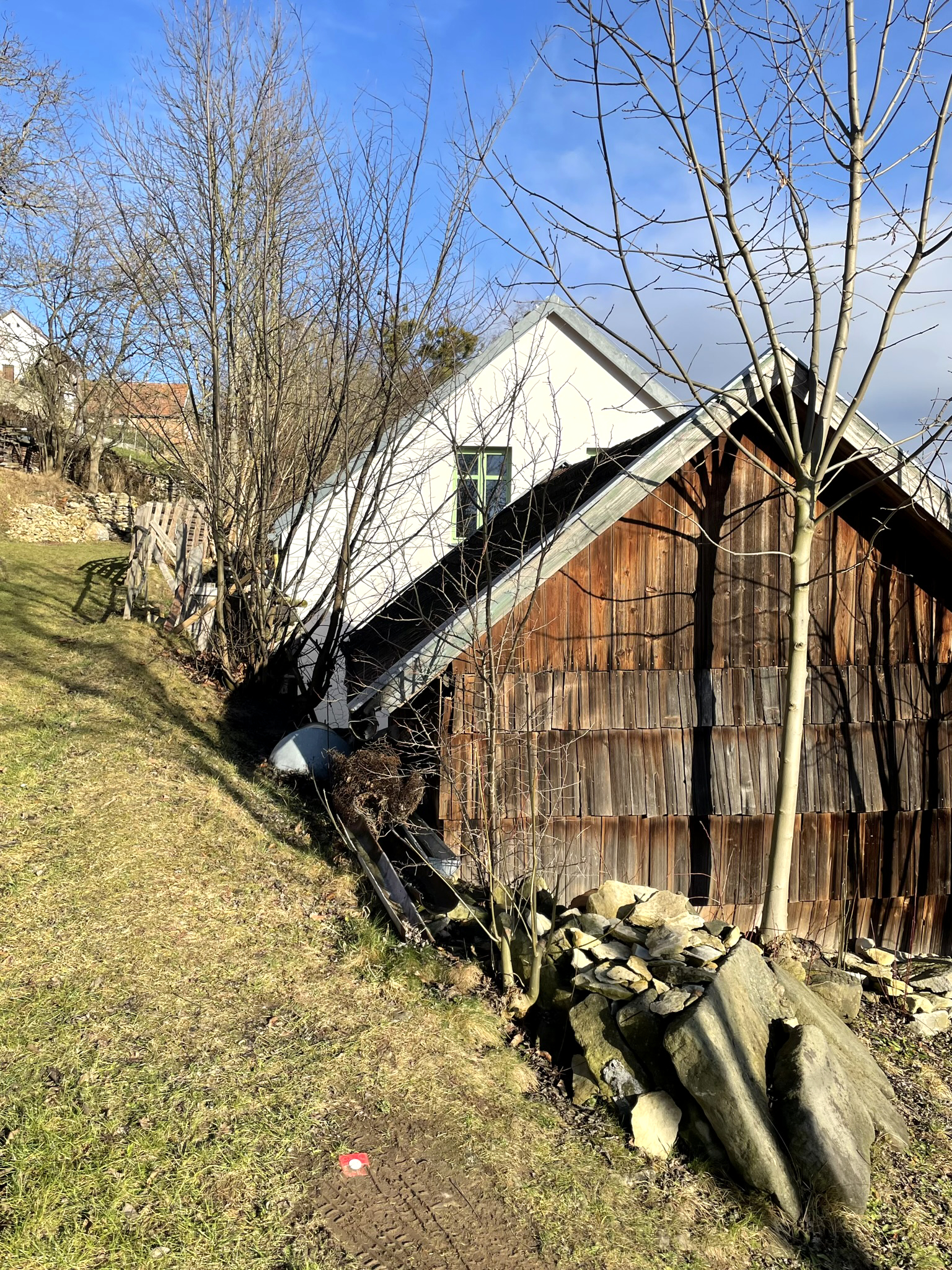 Letitá chalupa již technicky ani prostorově nevyhovovala potřebám pětičlenné rodiny. Po důsledném prověřené možností výstavby v jiných částech pozemku (sad, stodola) se investoři rozhodli pro demolici obytné části stavení a její náhradu novým domem.
